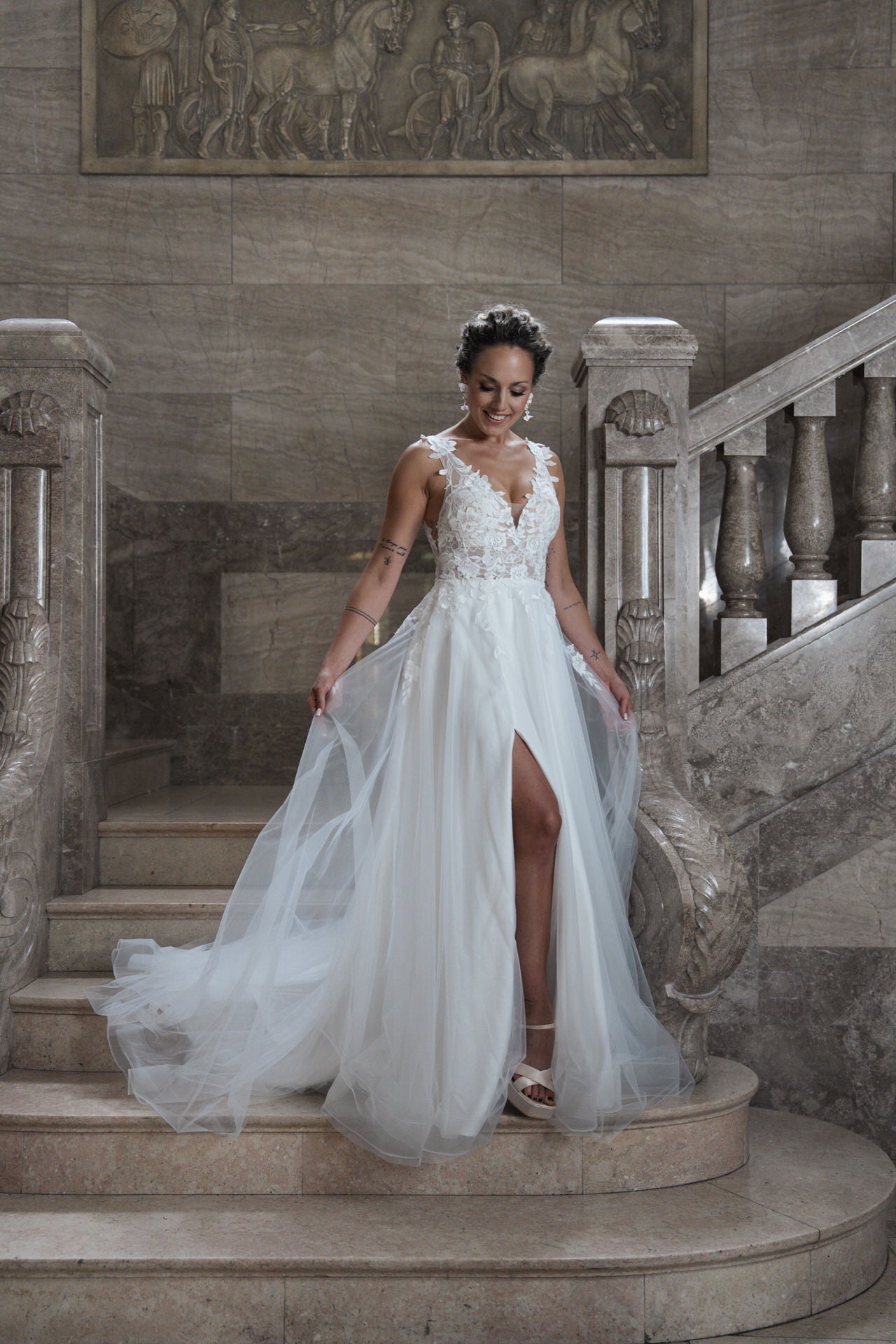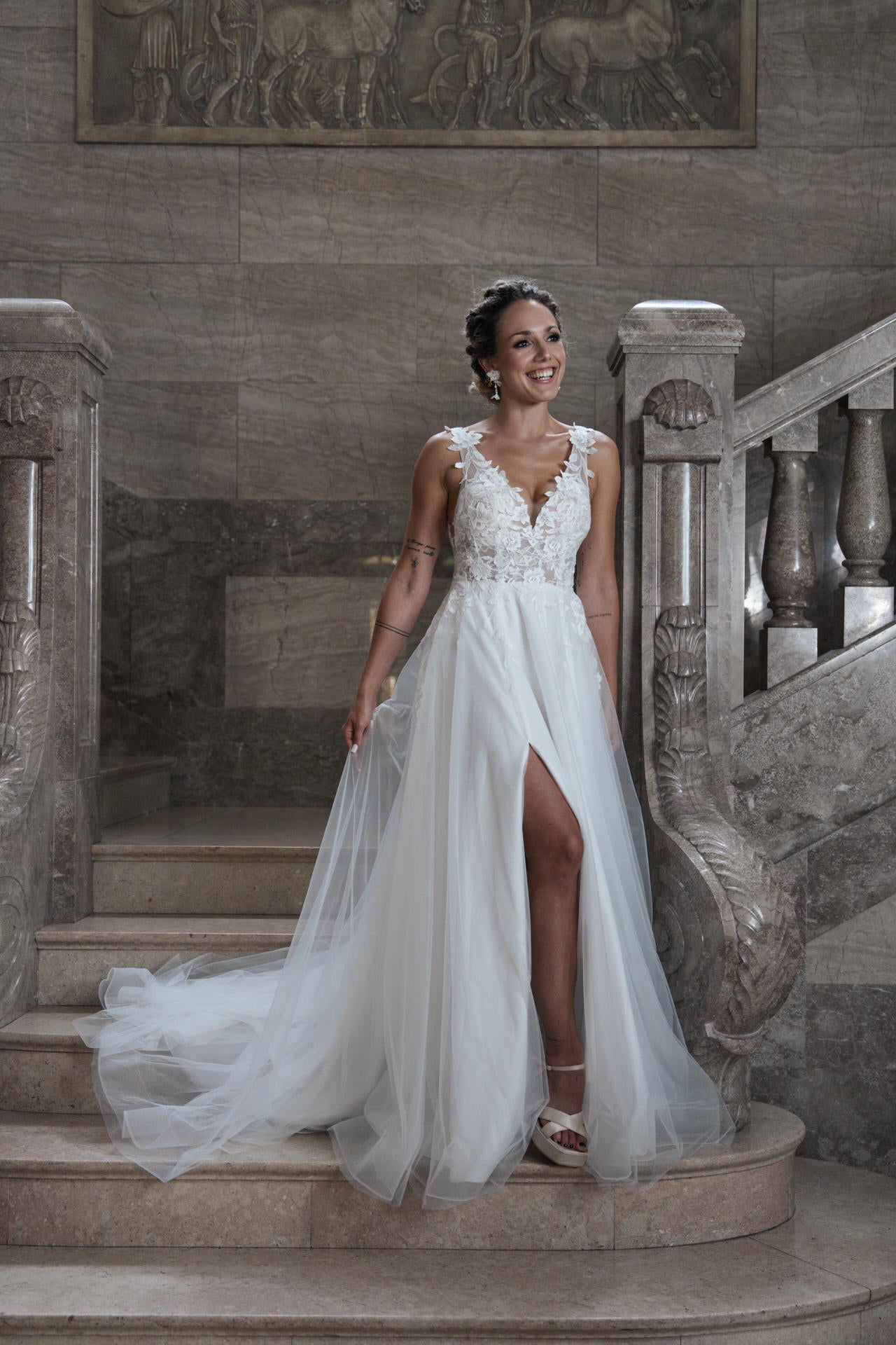 Träumst du von einem Hochzeitskleid, das romantische Leichtigkeit mit floralem Charme und einem Hauch von Verführung vereint? Das Bridonista R2L26-C-A26 ist wie für dich gemacht! Dieses bezaubernde Kleid kombiniert einen eleganten A-Linien-Schnitt mit zarten Spitzen, luftigem Tüll und einem verführerischen Lingerie-Look. Mit seiner mittellangen Schleppe, einem subtilen Schlitz und kunstvollen Verzierungen wirst du in diesem Kleid deinen großen Tag unvergesslich machen.