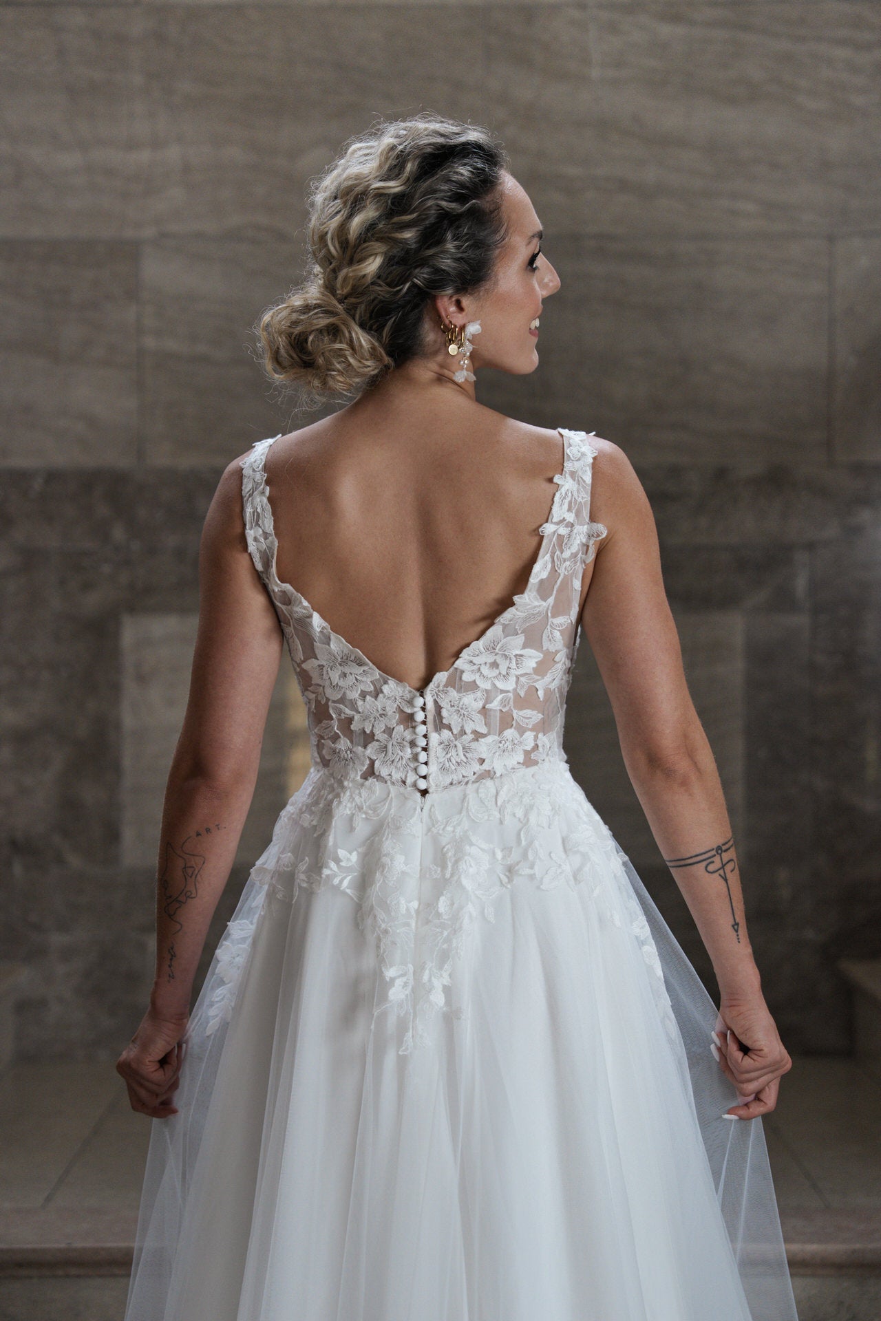 Gefertigt aus zartem Tüll, fühlt sich dein Kleid leicht und luftig an, während es eine romantische Präsenz schafft. Feine Chantilly-Spitze mit floralen Blätterspitzenmustern verleiht dem Kleid eine natürliche, romantische Ausstrahlung, die an einen blühenden Garten erinnert. Kunstvolle Bestickungen, mit Liebe zum Detail handgefertigt, verzieren den Oberkörper und den Rock, und fügen eine luxuriöse Tiefe hinzu, die das Kleid zum Strahlen bringt.