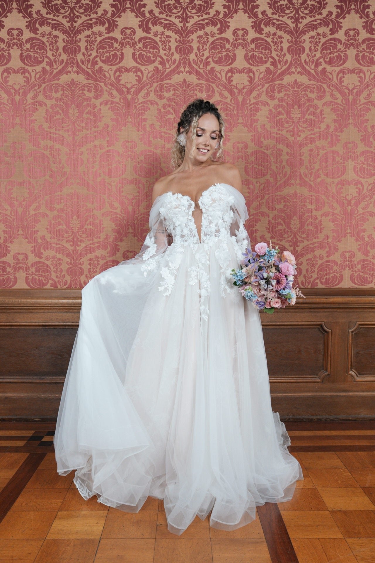 Träumst du von einem Hochzeitskleid, das romantische Leichtigkeit mit floralem Charme, sinnlicher Ausstrahlung und glamourösem Glanz vereint? Das Bridonista R2L26-C-B02 (+G) ist wie für dich geschaffen! Dieses bezaubernde Kleid kombiniert einen klassischen Prinzessinnen-Schnitt mit zarten Spitzen, funkelndem Glitzer-Tüll und einem verführerischen Lingerie-Look. Mit seiner langen Schleppe, subtilen Cutouts und abnehmbaren Ärmeln wirst du in diesem Kleid deinen großen Tag unvergesslich machen.