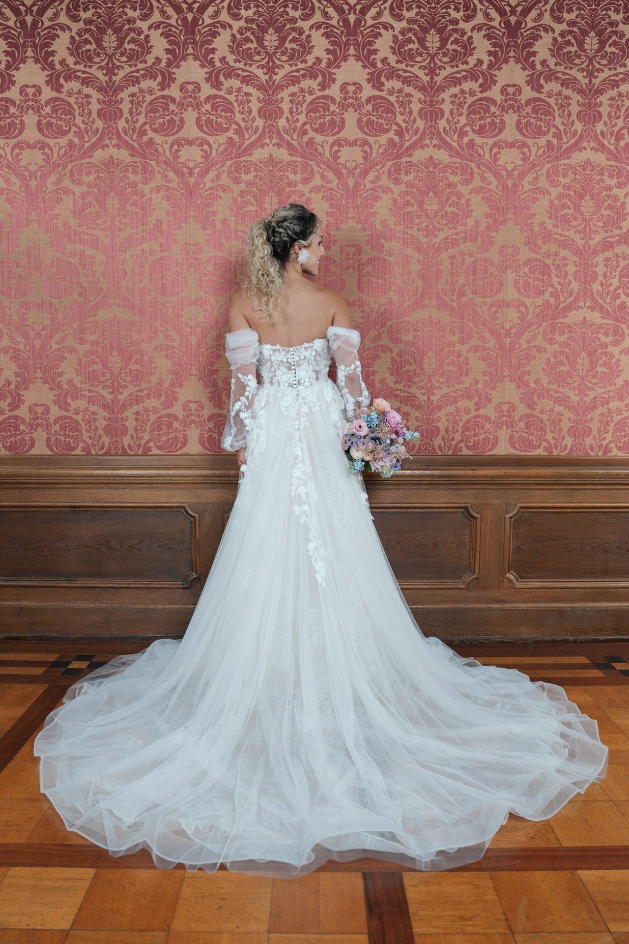 Die lange Schleppe verleiht deinem Auftritt Dramatik, perfekt für kirchliche Zeremonien oder elegante Locations. Besonders einzigartig sind die abnehmbaren Ärmel, die dir die Flexibilität geben, zwischen einem ärmellosen, luftigen Look und einer eleganten, bedeckten Optik zu wechseln. Die 3D-Design-Elemente verleihen dem Kleid eine ausdrucksstarke Dimension, die es modern und unverwechselbar macht.