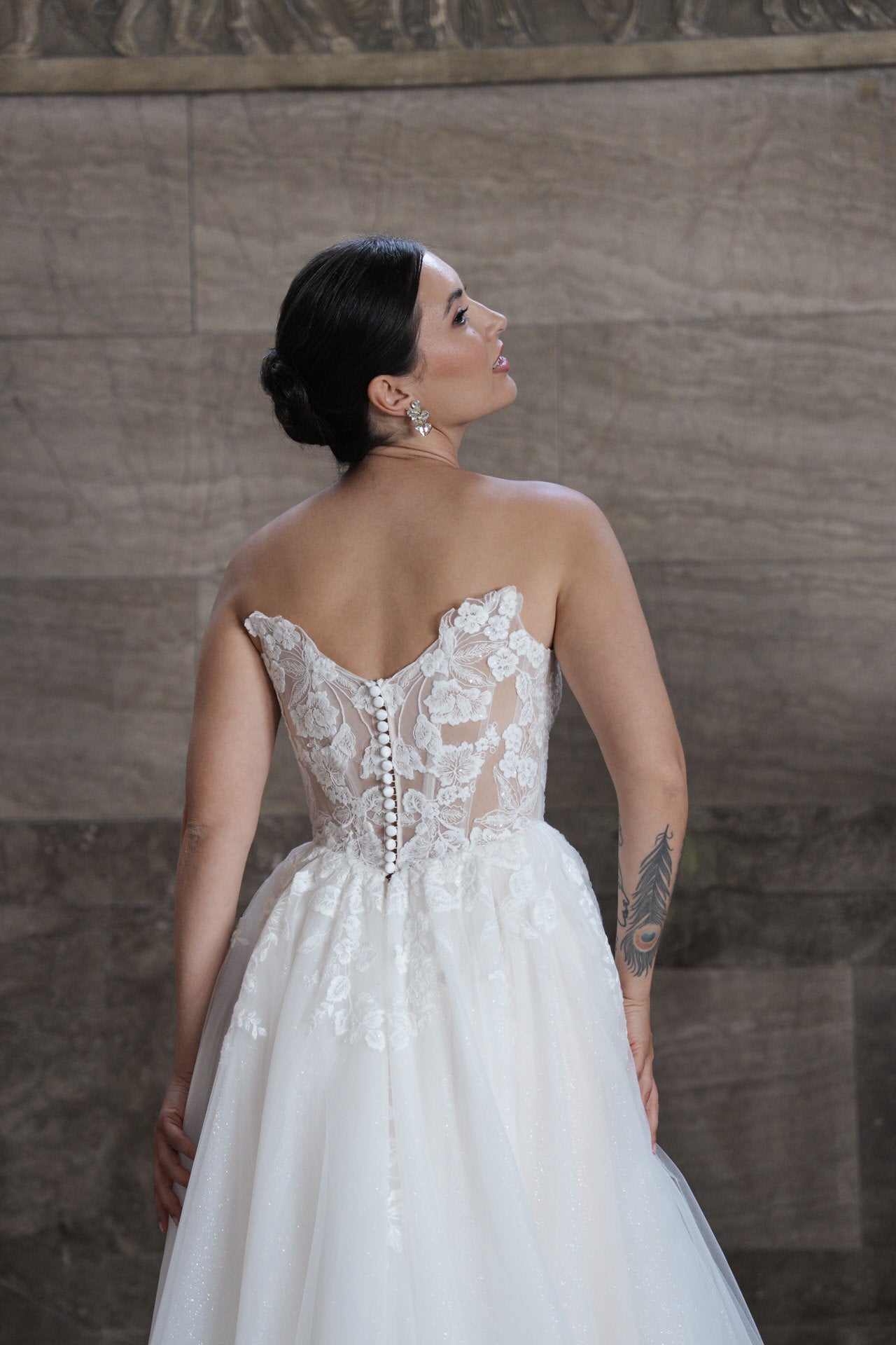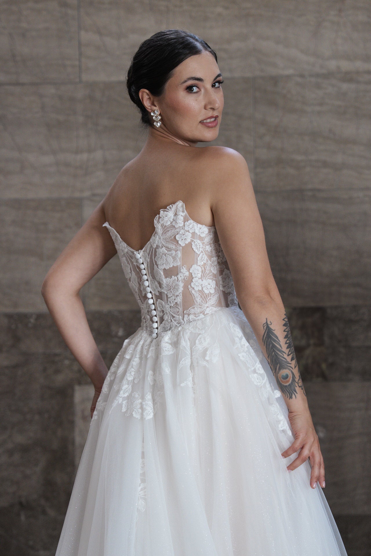 Träumst du von einem Hochzeitskleid, das romantische Eleganz mit floralem Charme und einem Hauch von Sinnlichkeit vereint? Das Bridonista R2L26-C-B03 ist wie für dich geschaffen! Dieses bezaubernde Kleid kombiniert einen klassischen Prinzessinnen-Schnitt mit zarten Spitzen, luftigem Tüll und einem verführerischen Lingerie-Look. Mit seiner langen Schleppe und kunstvollen Verzierungen wirst du in diesem Kleid deinen großen Tag unvergesslich machen.