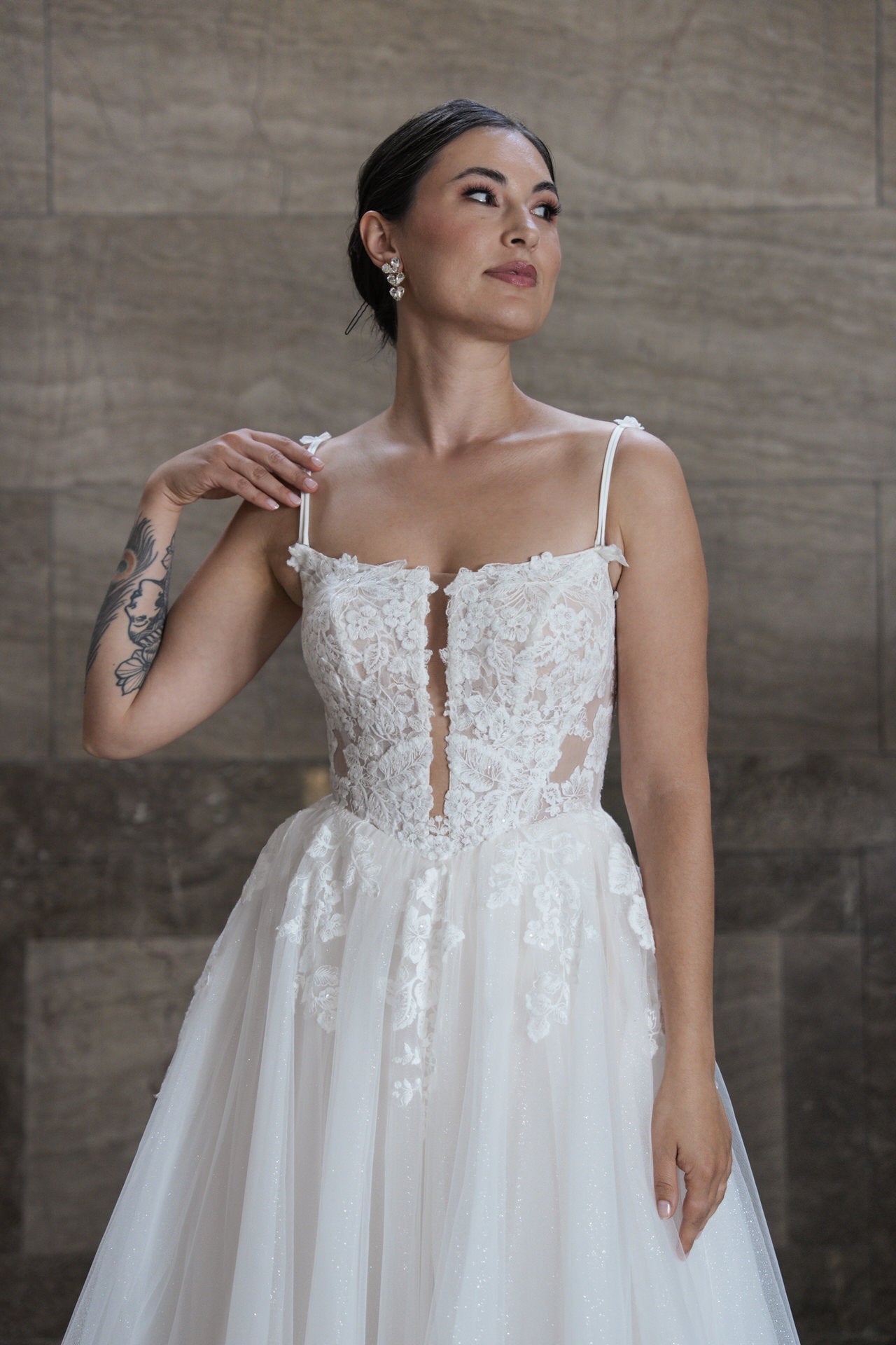 Gefertigt aus zartem Tüll, fühlt sich dein Kleid leicht und luftig an, während es eine romantische Präsenz schafft. Feine Spitze mit floralen Blätterspitzenmustern verleiht dem Kleid eine natürliche, romantische Ausstrahlung, die an einen blühenden Garten erinnert. Kunstvolle Bestickungen, mit Liebe zum Detail handgefertigt, verzieren den Oberkörper und den Rock, und fügen eine luxuriöse Tiefe hinzu, die das Kleid zum Strahlen bringt.
