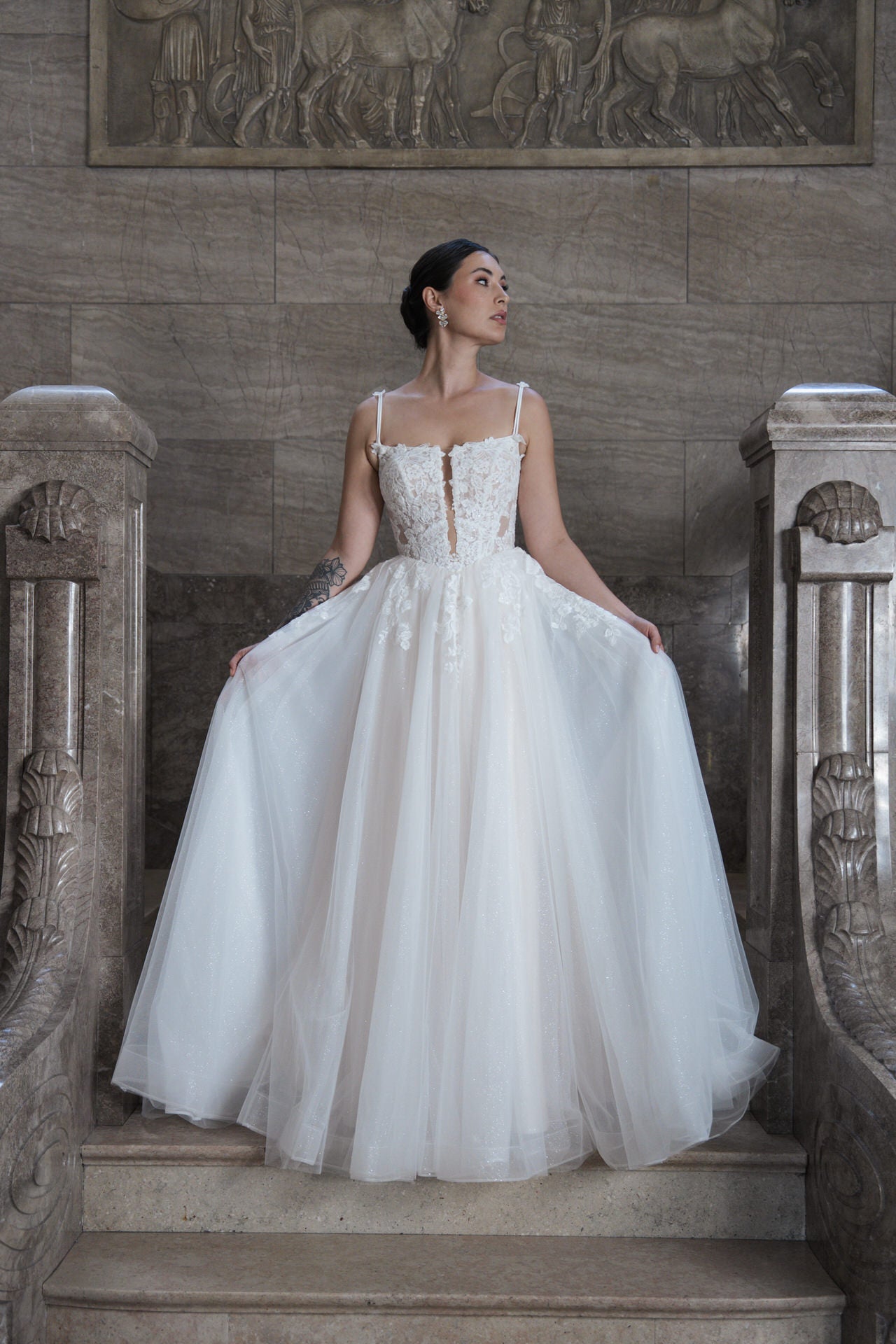 Gefertigt aus schimmerndem Glitzer-Tüll, funkelt dein Kleid wie ein Sternenhimmel und fühlt sich dennoch leicht und luftig an. Zarte Spitze mit floralen Blätterspitzenmustern verleiht dem Kleid eine natürliche, romantische Ausstrahlung, die an einen blühenden Garten erinnert. Die kunstvolle Bestickung, mit Liebe zum Detail handgefertigt, ziert den Oberkörper und den Rock, und fügt dem Design eine luxuriöse Tiefe hinzu. Das (+G)-Upgrade verstärkt den Glanz mit zusätzlichen Glitzereinlagen, die dein Kleid bei jedem Schritt erstrahlen lassen.