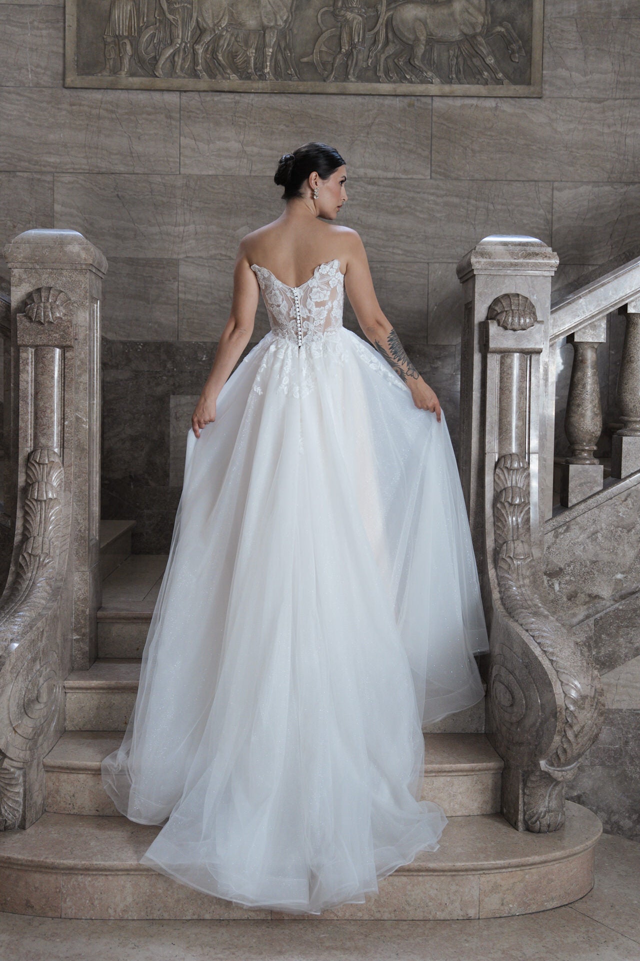 Träumst du von einem Hochzeitskleid, das romantische Eleganz mit einem Hauch von Natürlichkeit und funkelndem Glamour vereint? Das Bridonista R2L26-C-B03 (+G) ist wie für dich gemacht! Dieses atemberaubende Kleid kombiniert einen klassischen Prinzessinnen-Schnitt mit zarten floralen Details, glitzerndem Tüll und einem verführerischen Lingerie-Look. Mit seiner langen Schleppe und liebevollen Verzierungen wirst du in diesem Kleid deinen großen Tag unvergesslich machen.