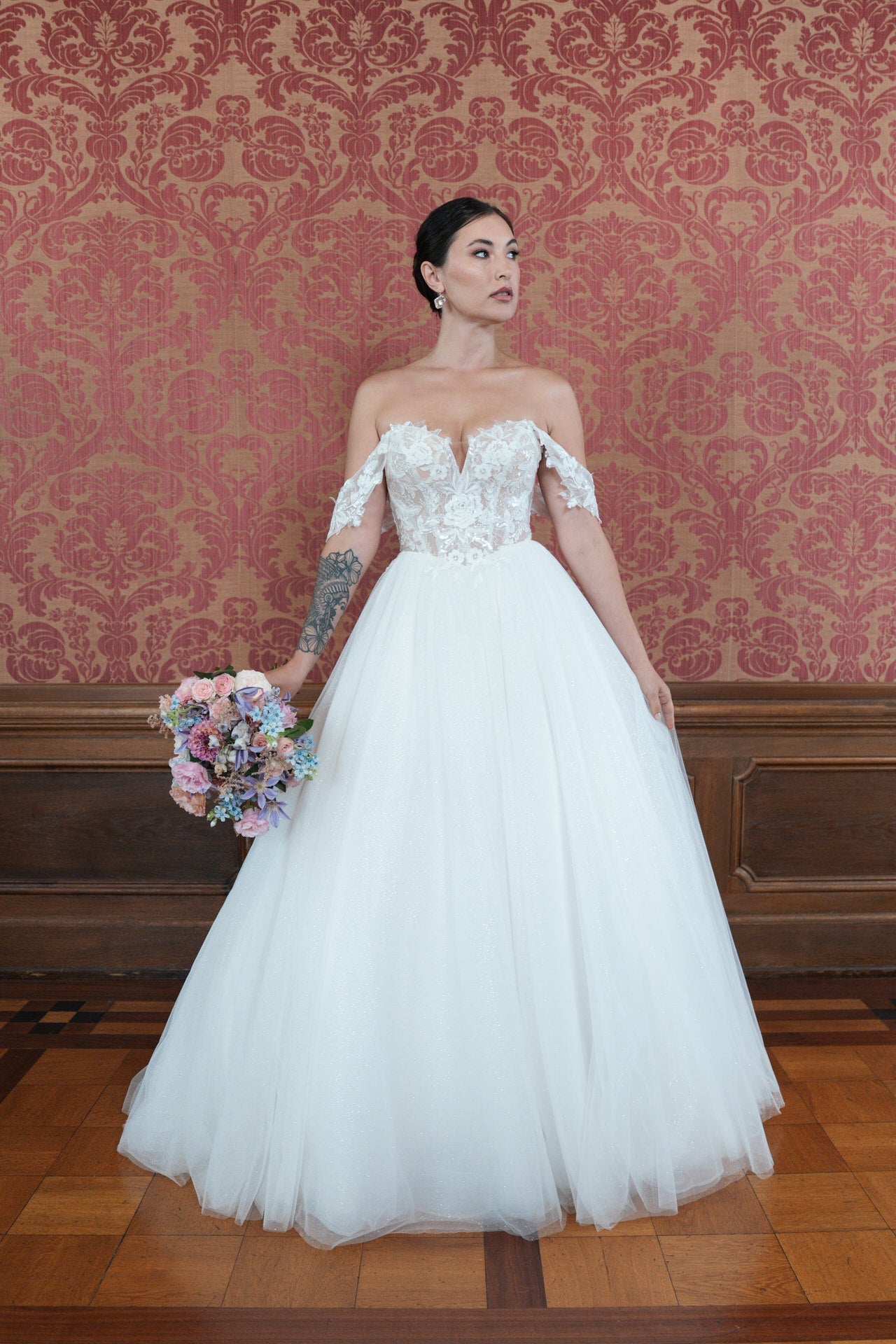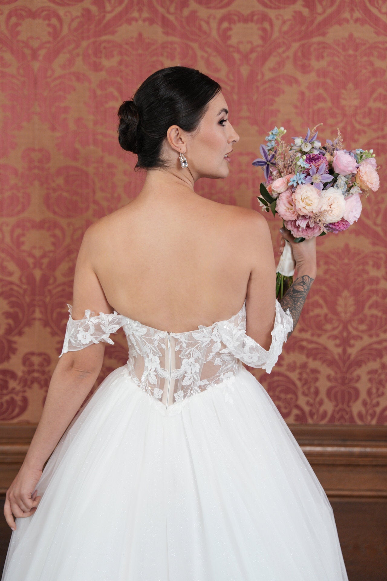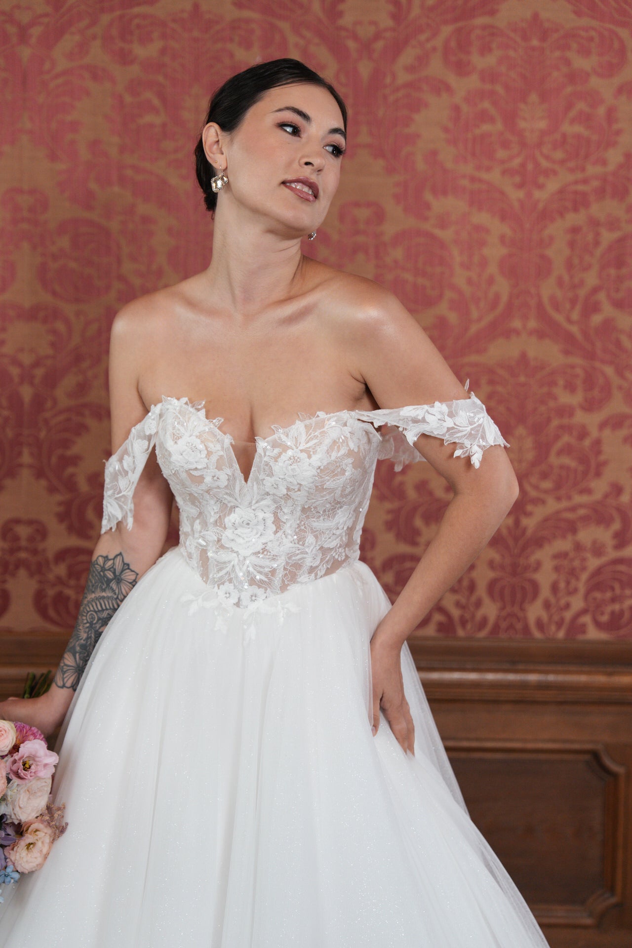 Träumst du von einem Hochzeitskleid, das romantische Leichtigkeit mit floralem Charme und glamourösem Glanz vereint? Das Bridonista R2L26-C-B05 (+G) ist wie für dich geschaffen! Dieses bezaubernde Kleid kombiniert einen klassischen Prinzessinnen-Schnitt mit zarten Spitzen, funkelndem Glitzer-Tüll und einem verführerischen Lingerie-Look. Mit seiner mittellangen Schleppe und kunstvollen Verzierungen wirst du in diesem Kleid deinen großen Tag unvergesslich machen.