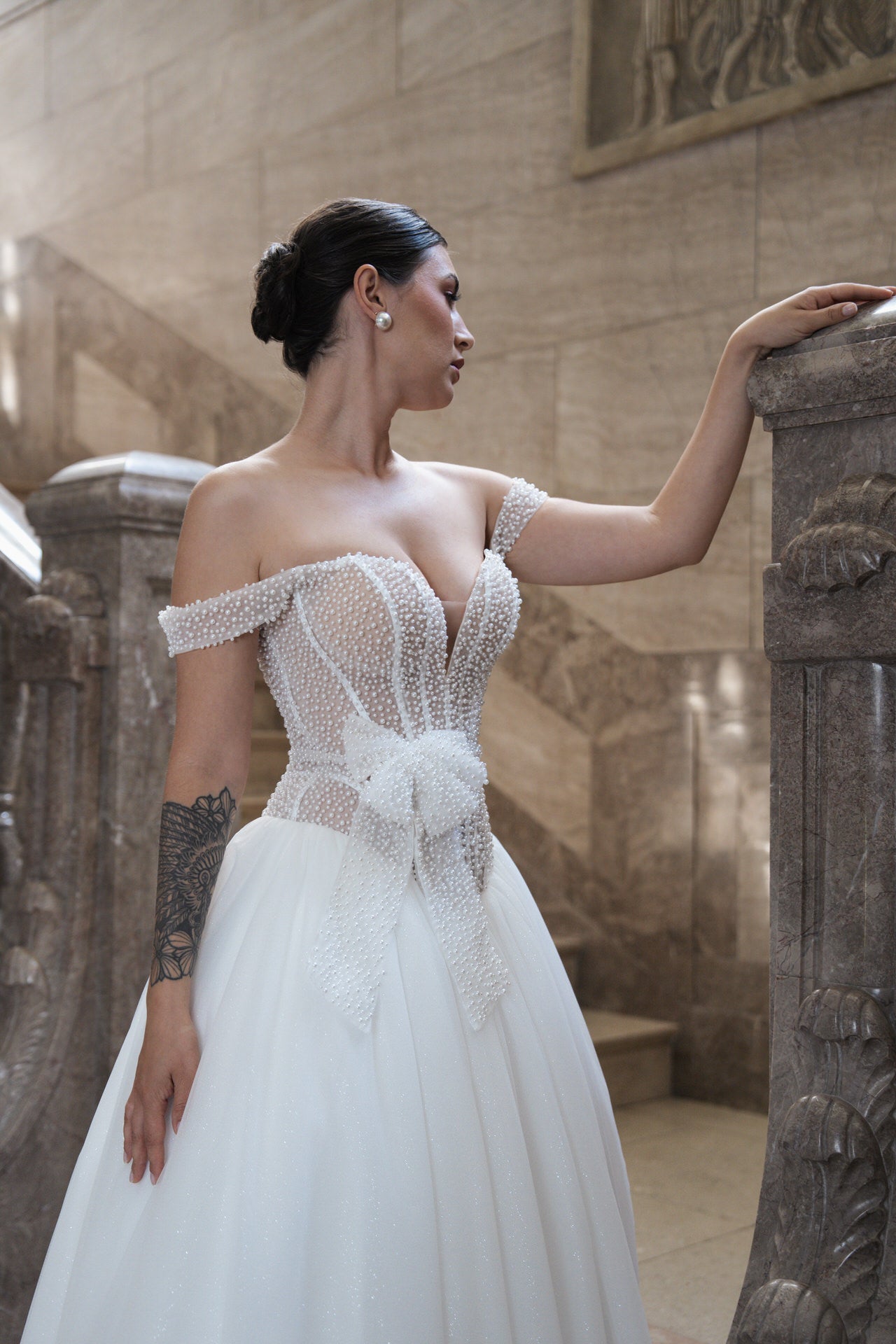 Off-the-Shoulder-Design: Die freiliegenden Schultern verleihen dir eine romantische und zugleich moderne Ausstrahlung, perfekt für dezenten Schmuck.