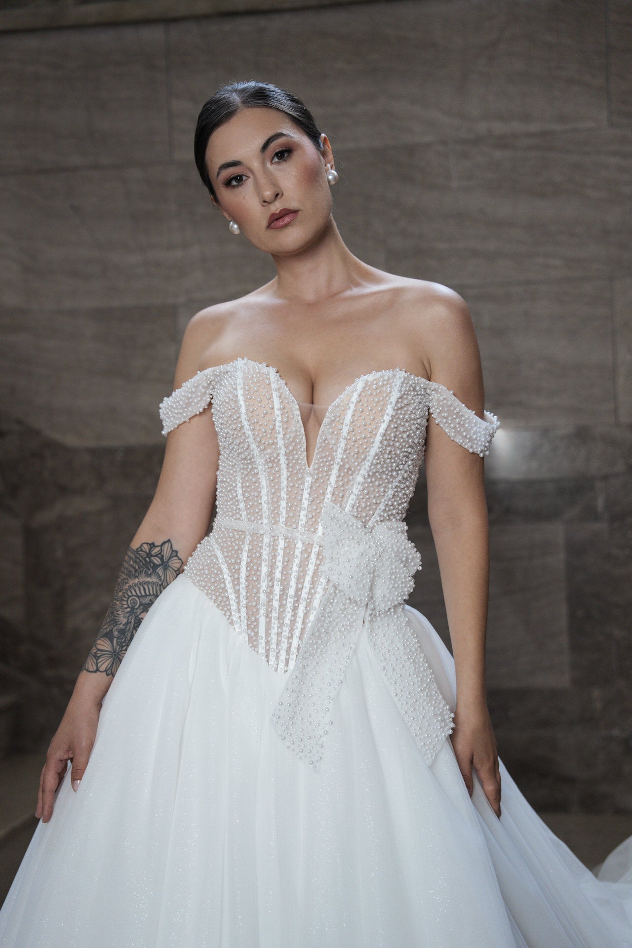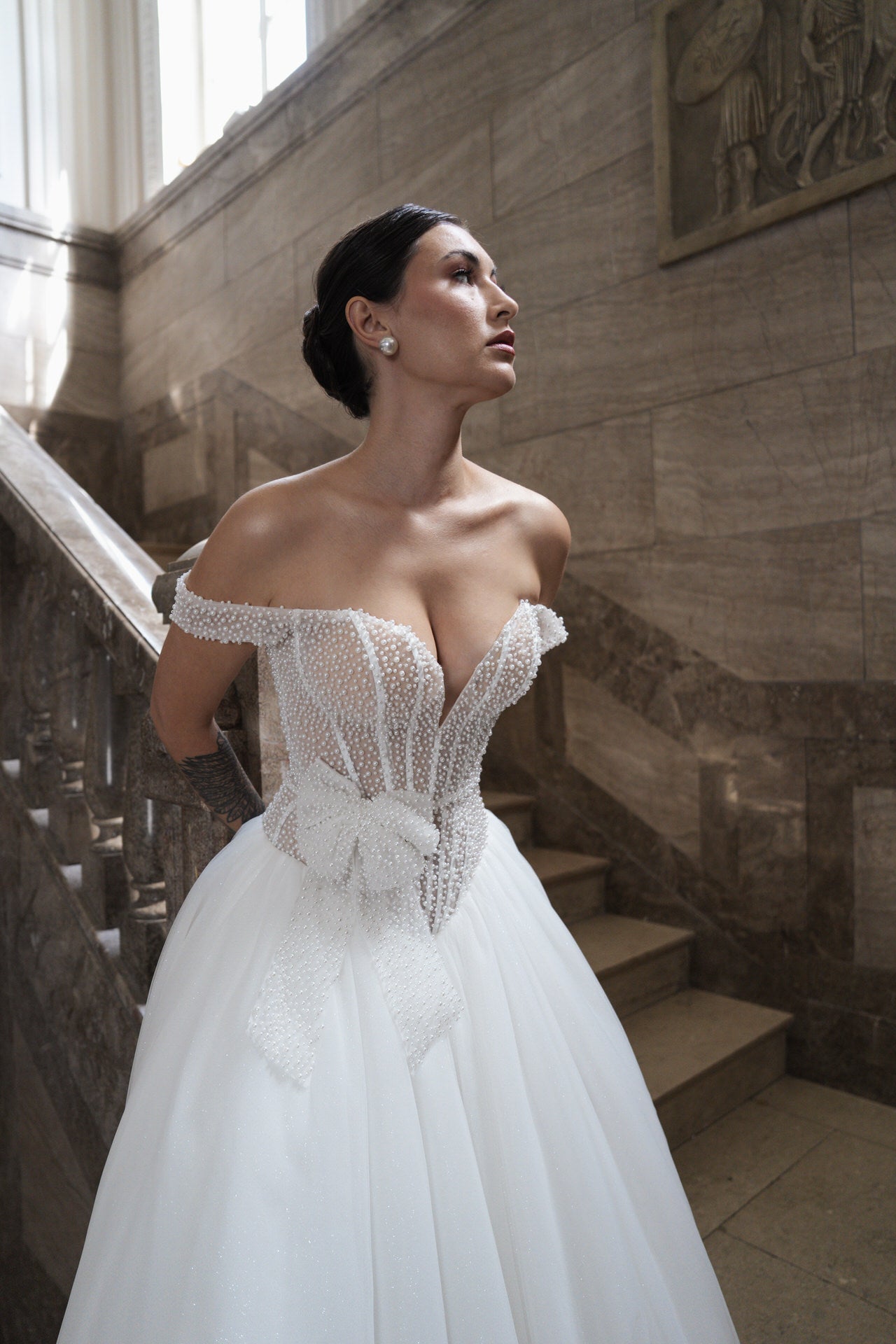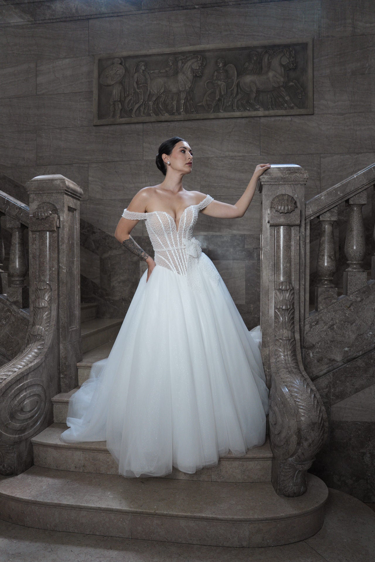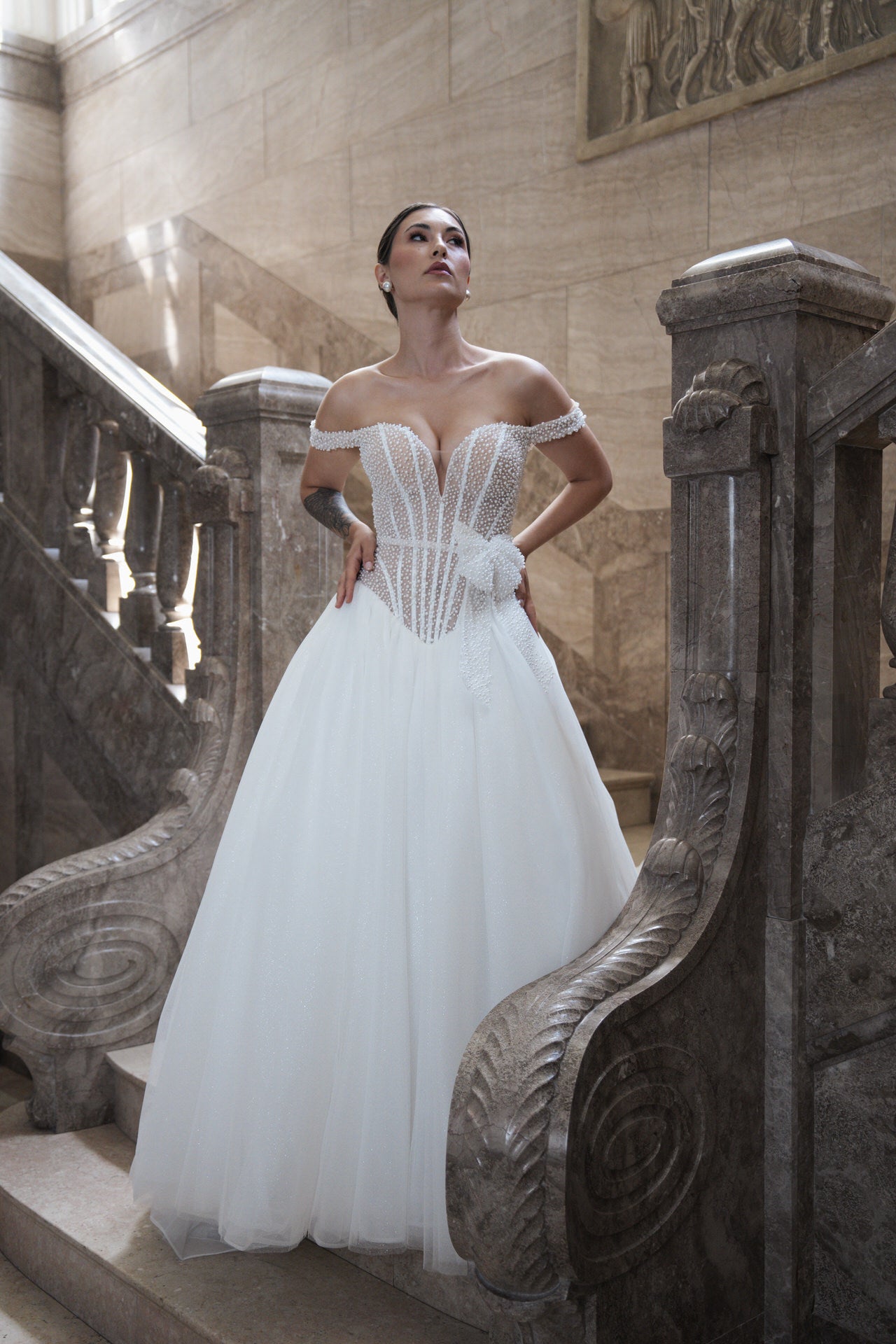 Träumst du von einem Hochzeitskleid, das königliche Eleganz mit romantischem Glanz vereint? Das Bridonista R2L26-C-B06 (+G) ist genau das Richtige für dich! Dieses atemberaubende Kleid kombiniert einen majestätischen Prinzessinnen-Schnitt mit modernen, sinnlichen Details und funkelndem Glitzer-Tüll. Mit seinem Lingerie-Look, zarten Perlen und kunstvoller Bestickung wirst du in diesem Kleid unvergesslich strahlen – ein echtes Märchen für deinen großen Tag.