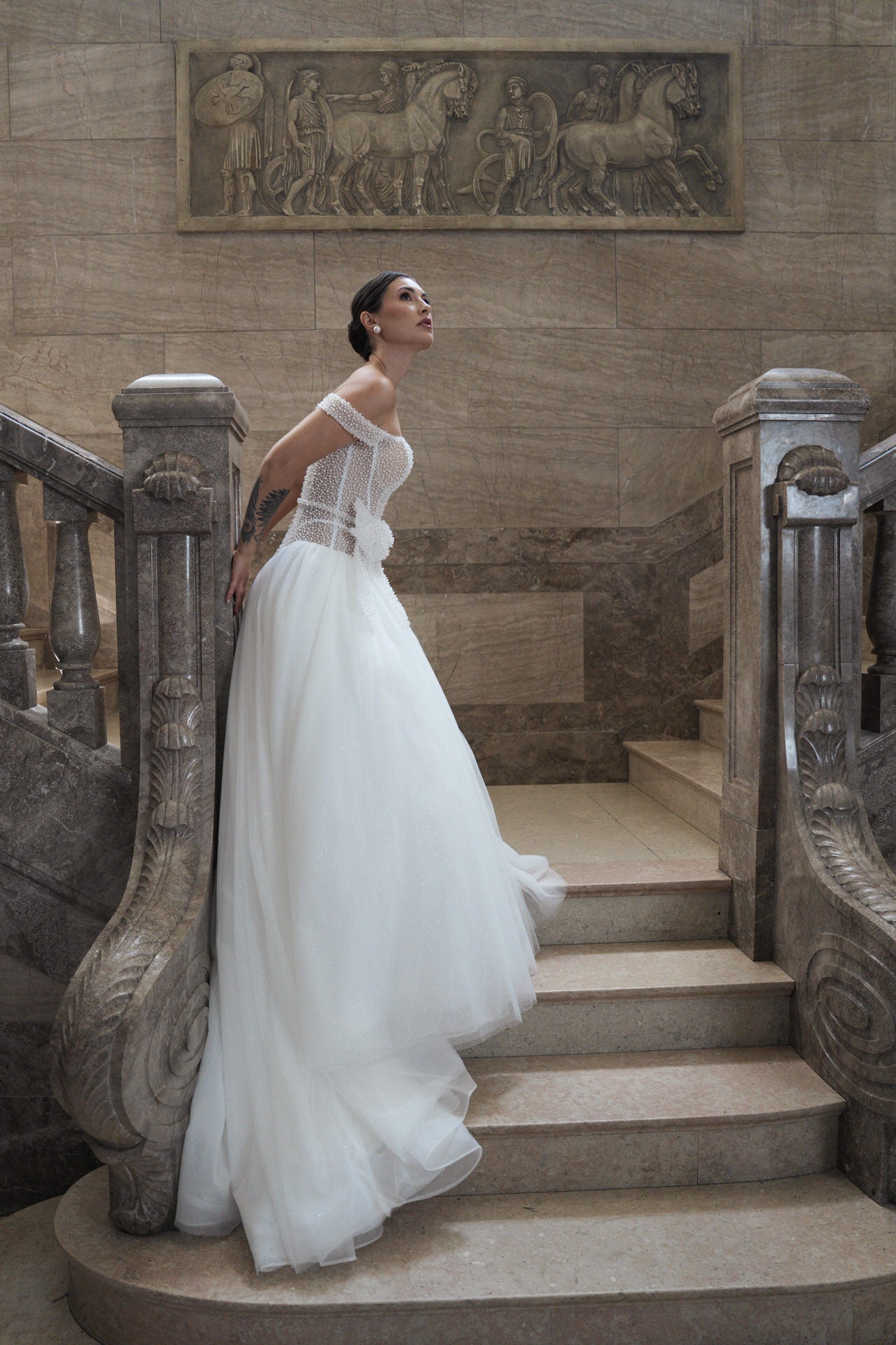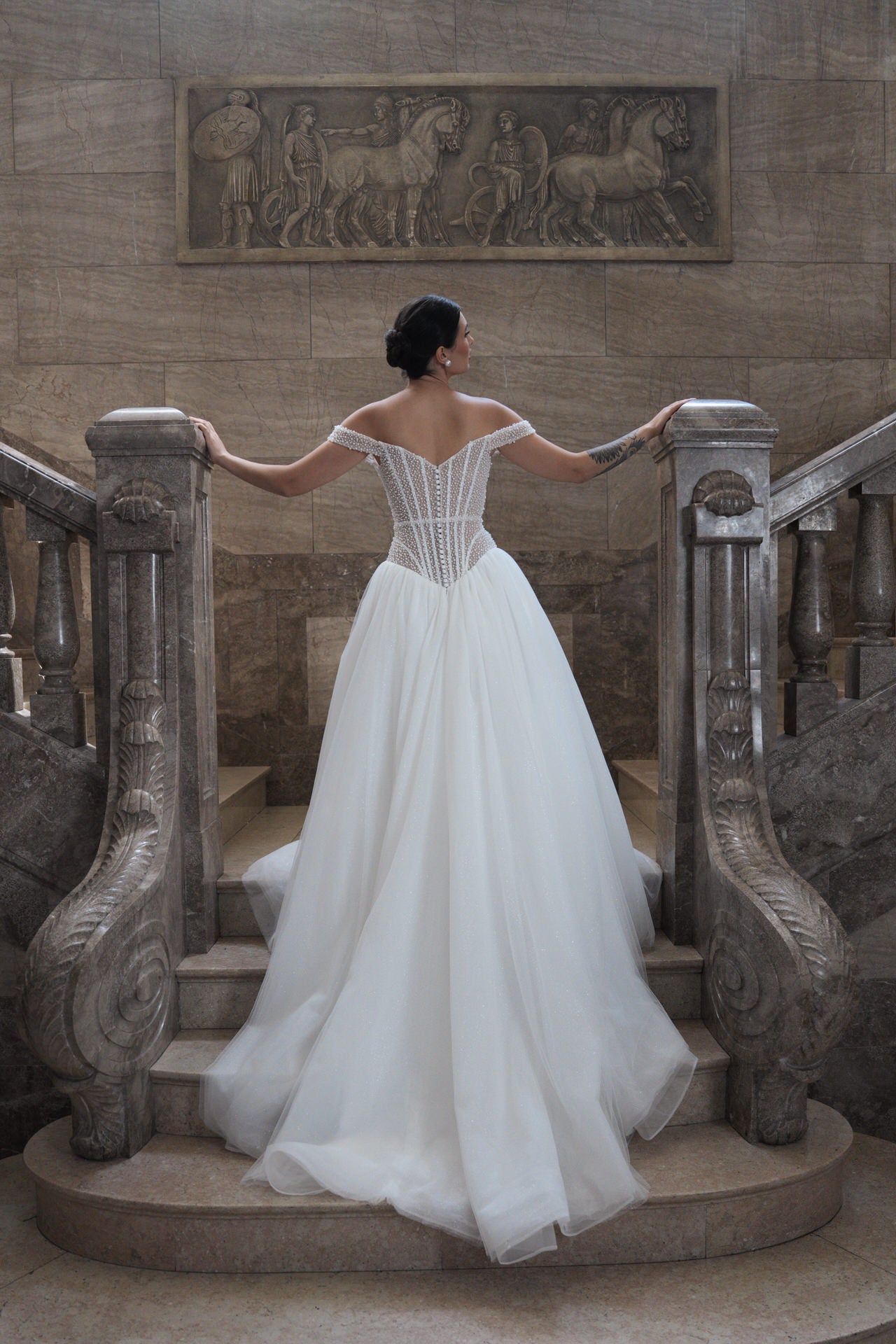 Das Bridonista R2L26-C-B06 (+G) besticht durch seinen royalen Princess-Schnitt, der deine Silhouette sanft umschmeichelt und in einen opulenten Rock mit langer Schleppe übergeht – perfekt für einen dramatischen Auftritt. Der elegante Carmen-Ausschnitt, kombiniert mit einem zarten Herzausschnitt und einem dezenten V-Ausschnitt, betont dein Dekolleté auf romantische Weise. Die Off-the-Shoulder-Ärmel setzen deine Schultern stilvoll in Szene und verleihen dir eine feminine, elegante Ausstrahlung. Der Rücken vereint klassische Raffinesse mit einem Hauch von Verführung: Ein hoher Rücken sorgt für zeitlose Eleganz, während ein tiefer V-Ausschnitt eine sinnliche Note hinzufügt.