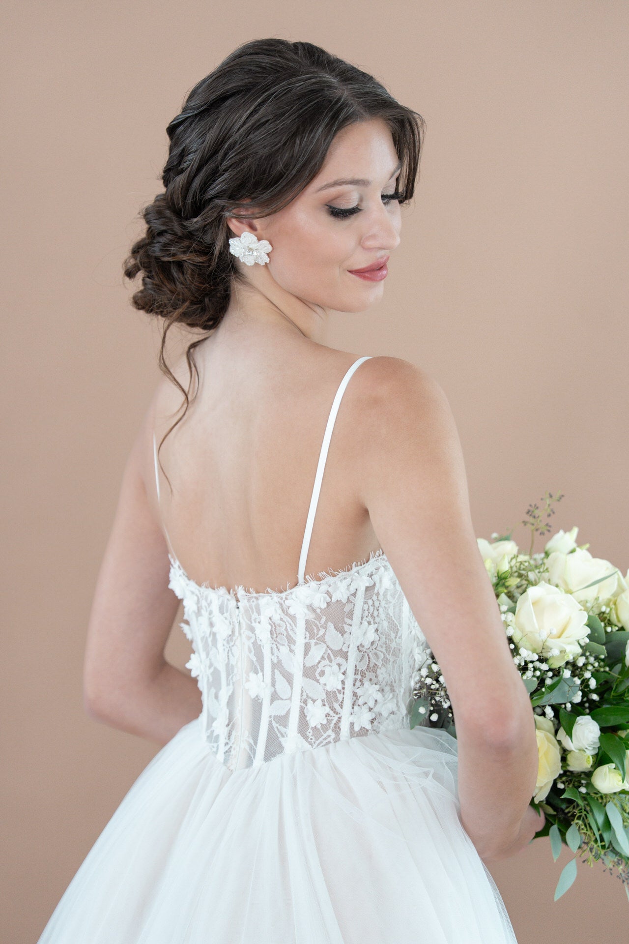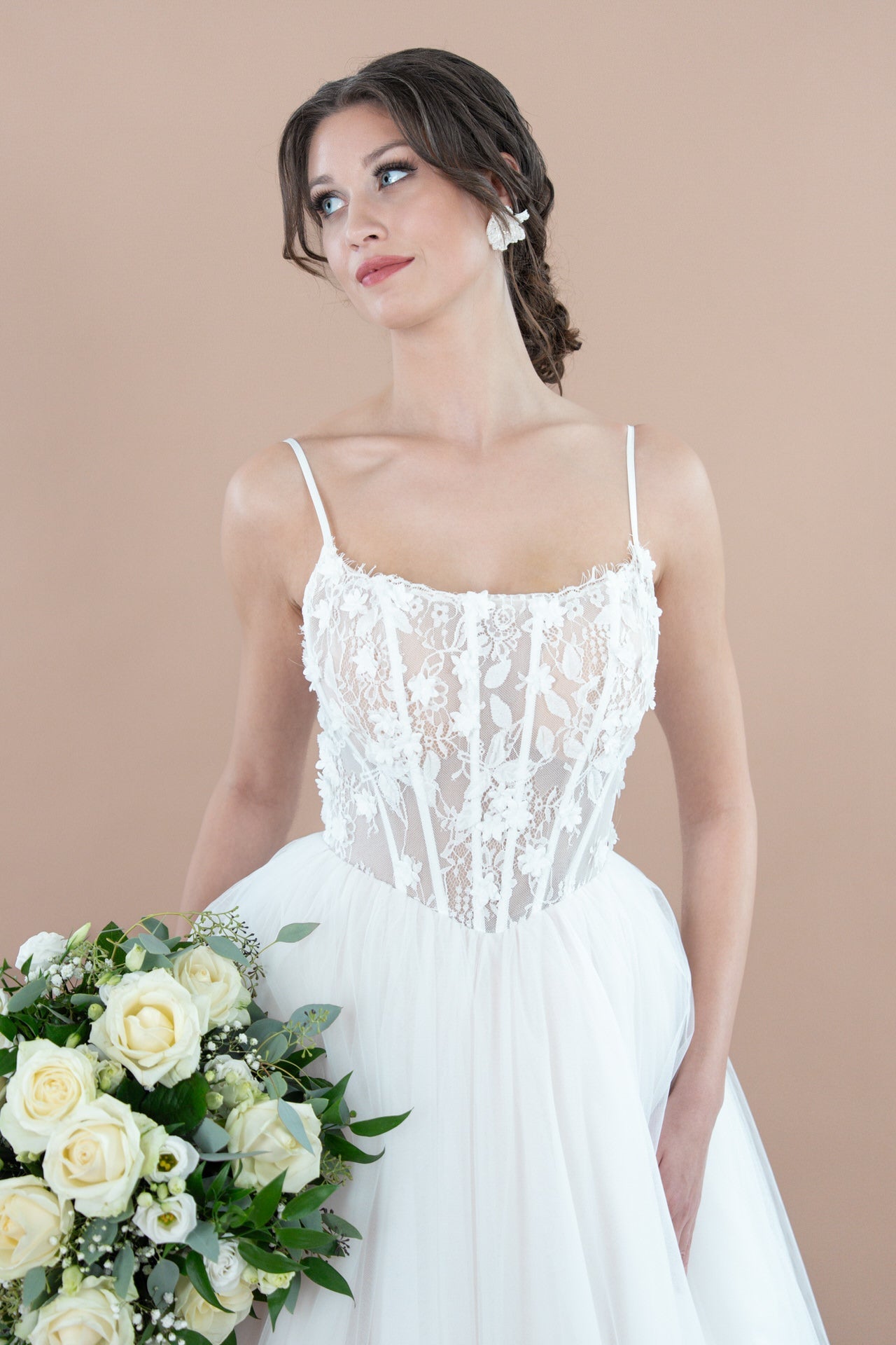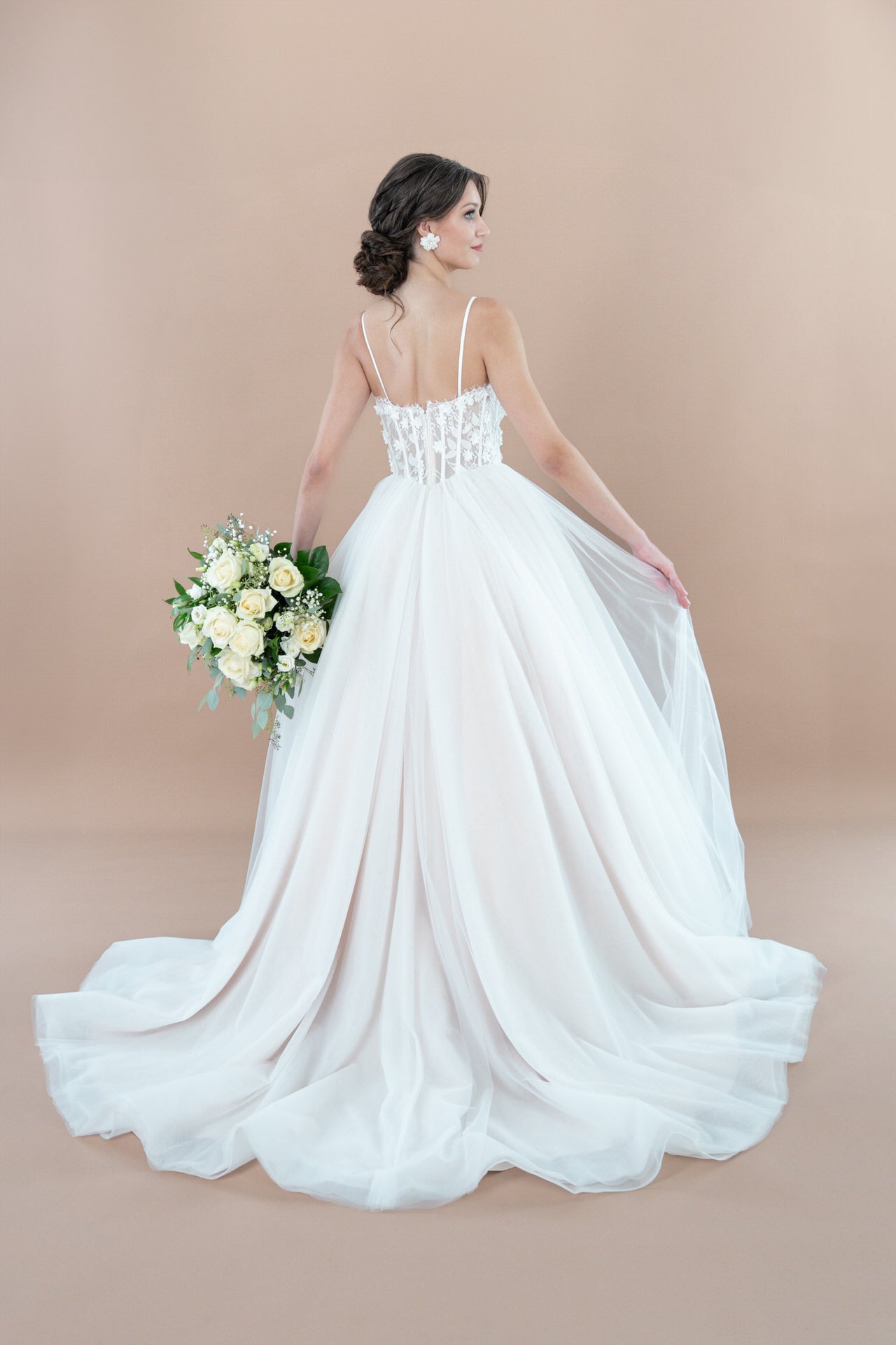 Träumst du von einem Hochzeitskleid, das romantische Eleganz mit natürlicher Leichtigkeit und floralem Charme vereint? Das Bridonista R2L26-C-B07 ist wie für dich geschaffen! Dieses bezaubernde Kleid kombiniert einen klassischen Prinzessinnen-Schnitt mit zarten Details aus Spitze und Tüll, einem verführerischen Lingerie-Look und einer romantischen floralen Ästhetik. Mit seiner mittellangen Schleppe und kunstvollen Verzierungen wirst du in diesem Kleid deinen großen Tag unvergesslich machen.