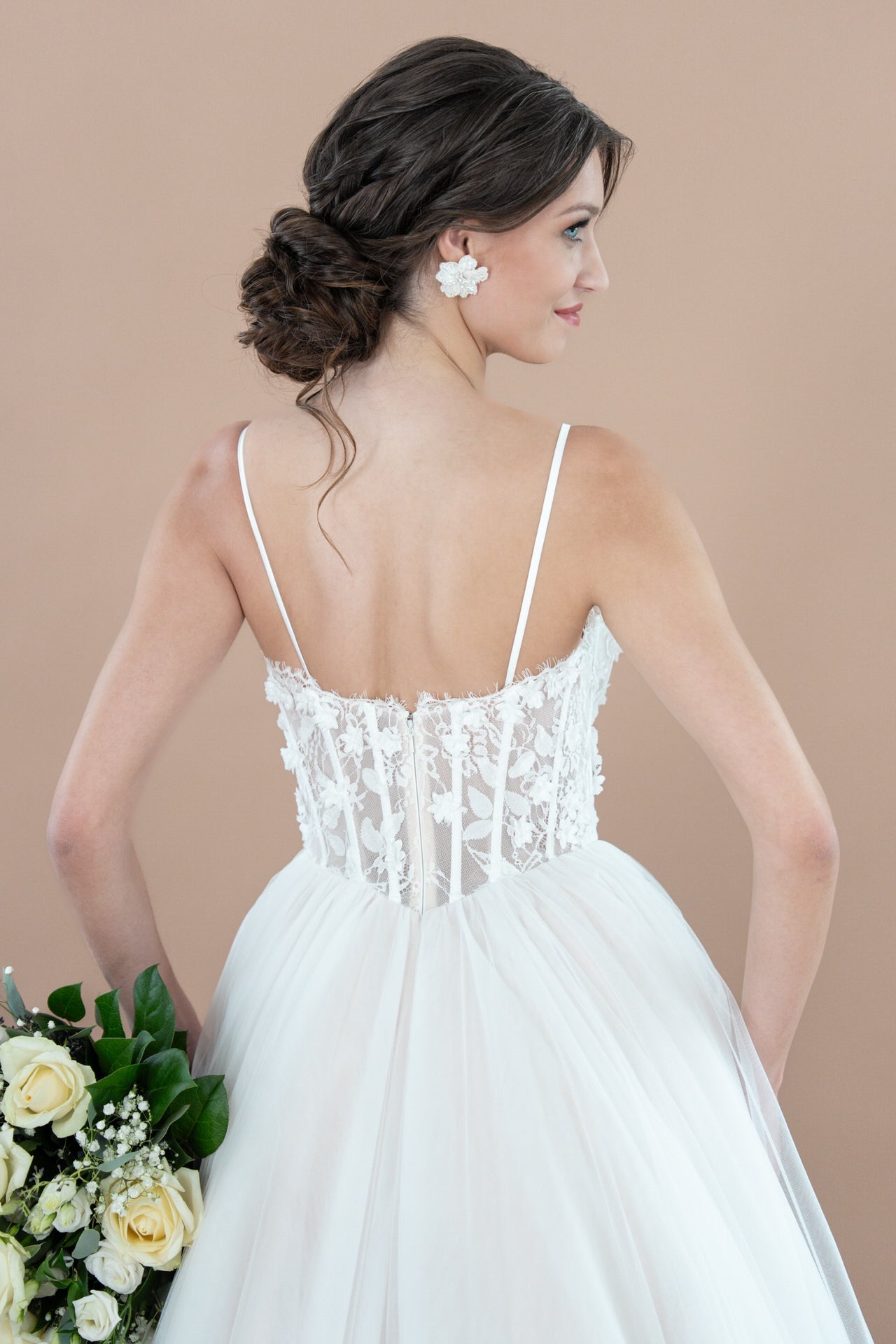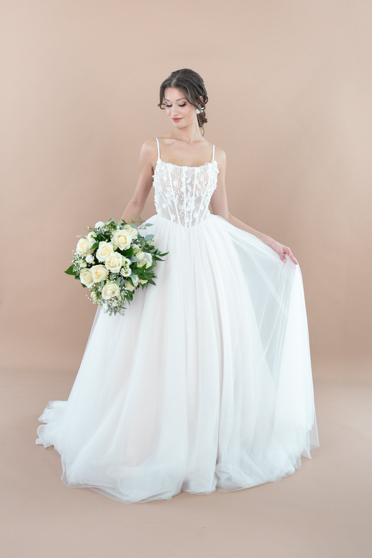 Träumst du von einem Hochzeitskleid, das romantische Eleganz mit floralem Charme und einem Hauch von Glamour vereint? Das Bridonista R2L26-C-B07 (+G) ist wie für dich gemacht! Dieses bezaubernde Kleid kombiniert einen klassischen Prinzessinnen-Schnitt mit zarten Details aus Spitze, Glitzer-Tüll und einem verführerischen Lingerie-Look. Mit seiner mittellangen Schleppe und funkelnden Verzierungen wirst du in diesem Kleid deinen großen Tag unvergesslich machen.