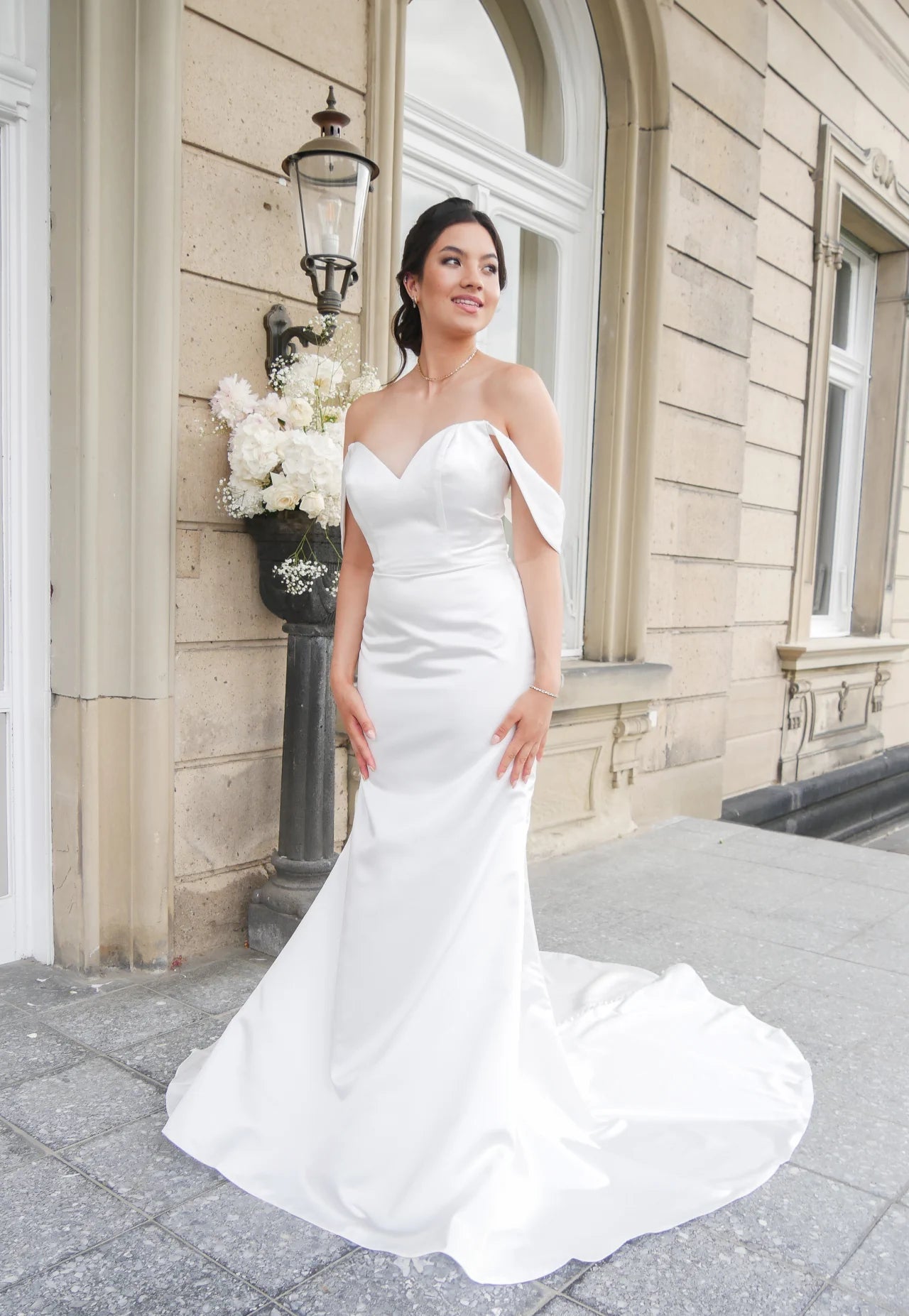 Sag "Ich will" (oder einfach nur "Ja") in diesem wunderschönen, modernen Hochzeitskleid. Mit seiner schlichten und schlichten Flare-Silhouette, den zart geknöpften Trägern und dem Herzchen-Ausschnitt wirst du an deinem großen Tag einfach umwerfend aussehen! Dieses wunderschöne Kleid aus hochwertigem Satin mit einer kurzen Schleppe ist so schlicht wie atemberaubend. (Und ja, du kannst die Knopfleiste für zusätzliche Sicherheit zuknöpfen!)