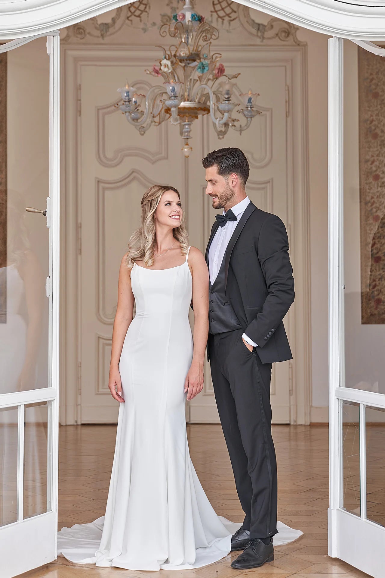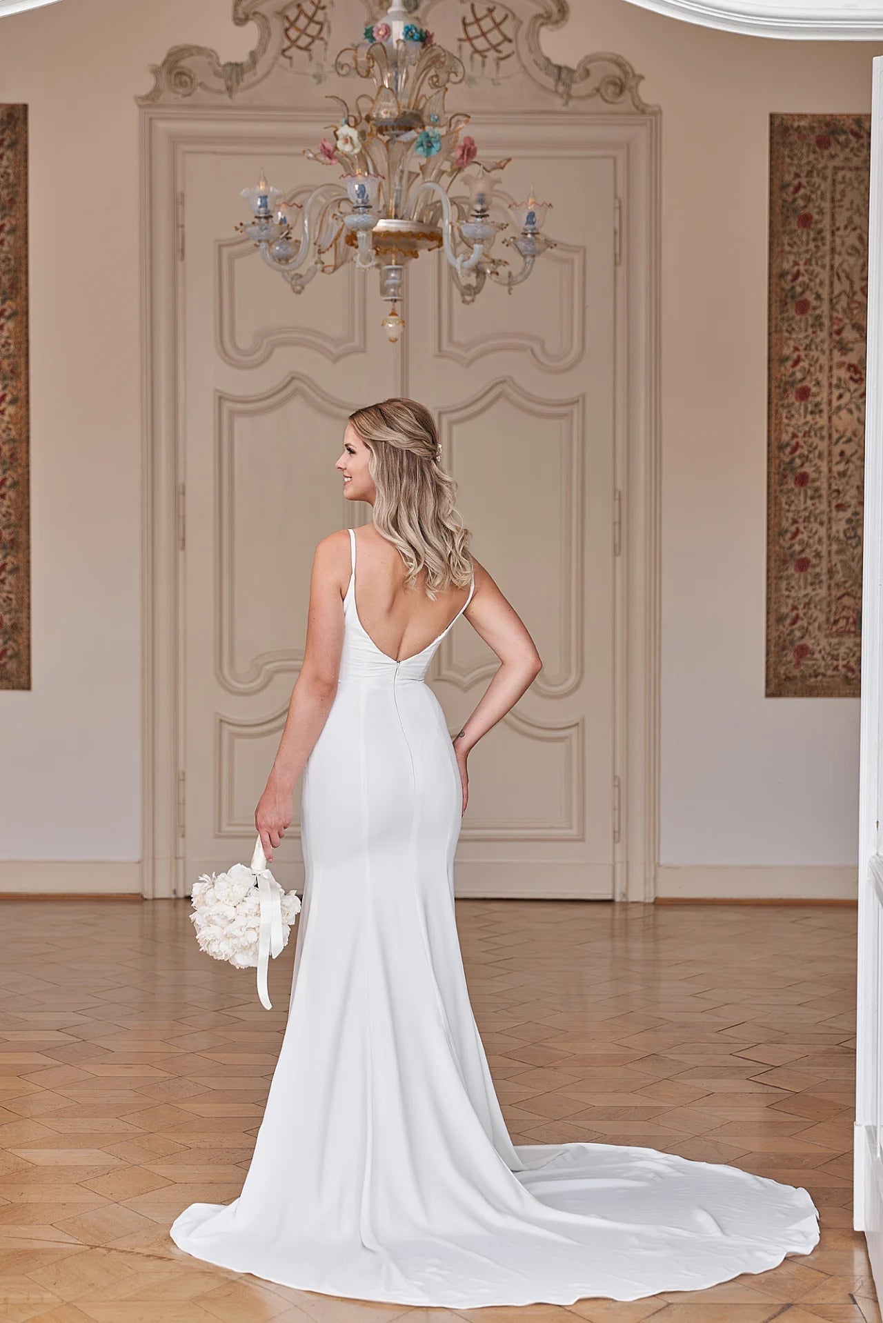 Entfessle die moderne Braut in dir mit S24-03! Dieses elegante Hochzeitskleid in Fit and Flare sorgt dafür, dass du genauso umwerfend aussiehst, wie du dich fühlst. Es ist zeitlos schlicht, aus einem luxuriösen Krepp Material gefertigt und sorgt mit einem geraden Ausschnitt und einem romantischen Rückenausschnitt in V-Form für einen wirklich schicken Brautlook. Außerdem kannst du dich mit einem stilvollen Spaghetti-Träger und einer feinen kurzen Schleppe sehen lassen. Verwöhne dich! Es ist Zeit, "Ja" zu diesem prächtigen Kleid zu sagen! ;)