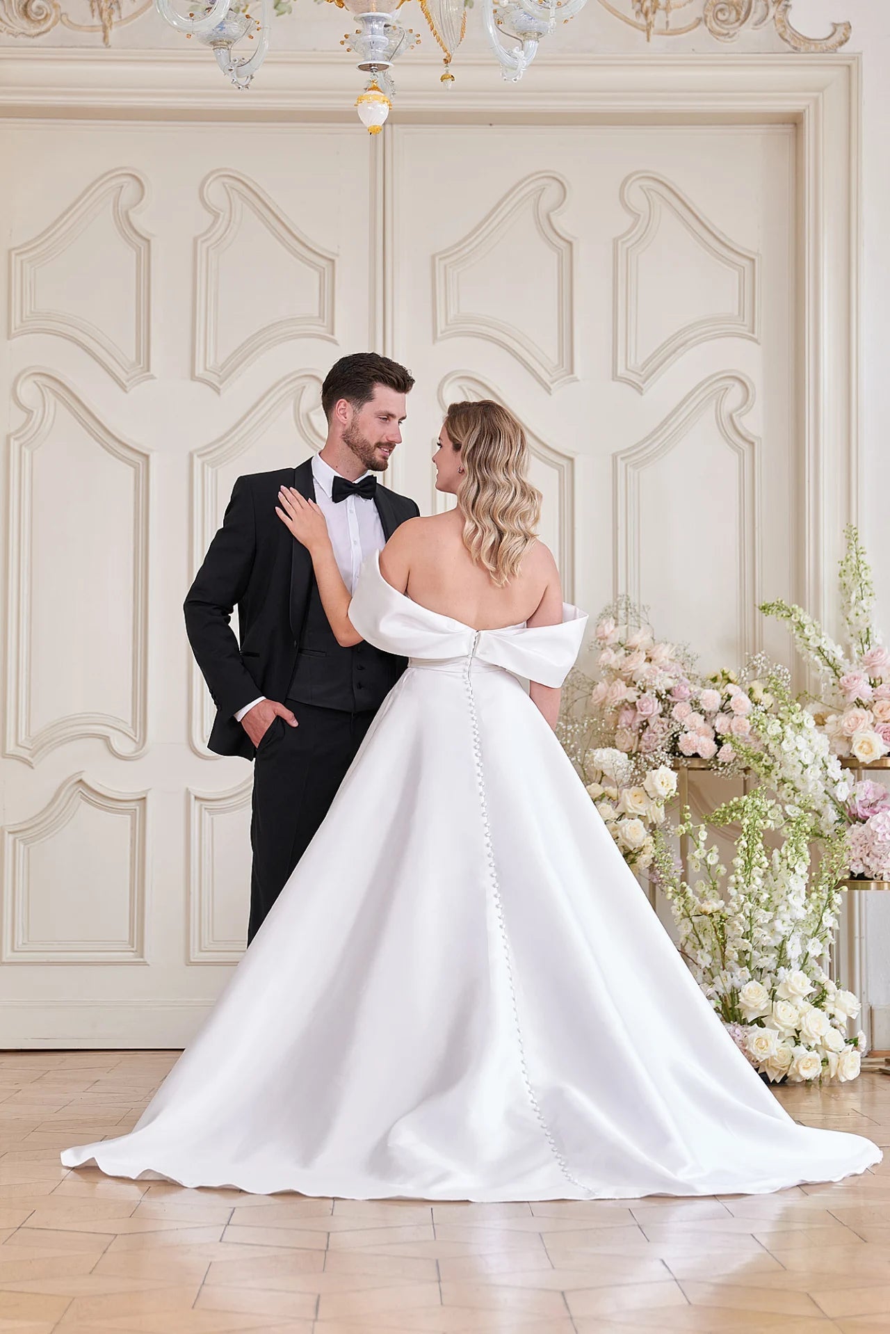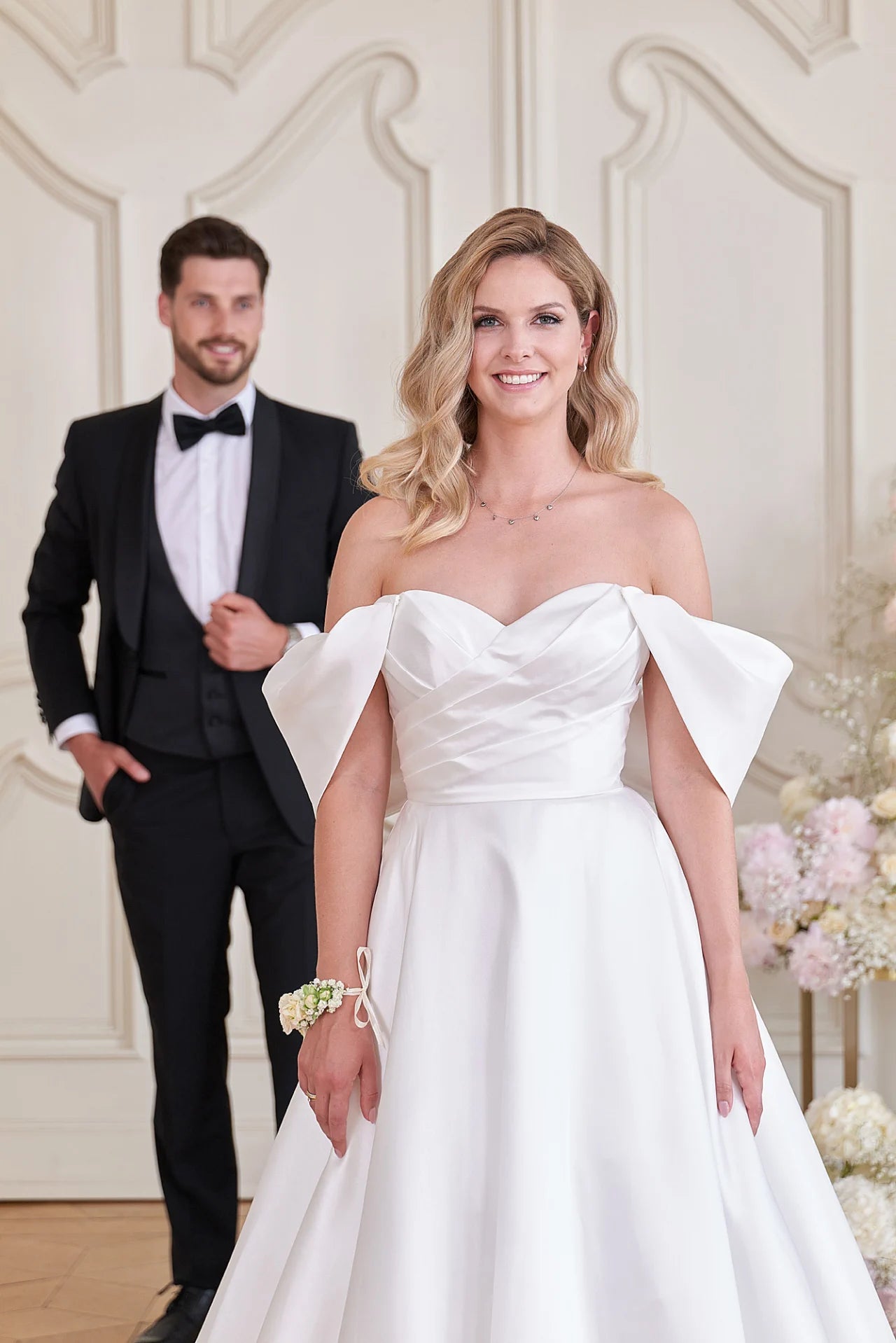 Corsage: Ivory Skiny Mikado, Ivory Lining; - Rock: Ivory Shiny Mikado, Ivory Lining; - Rock: Ivory Shiny Mikado, Ivory Lining. Dieses Modell wird nur mit Materialien in Ivory hergestellt. Dieses Modell ist nur in einer Farbe erhältlich.