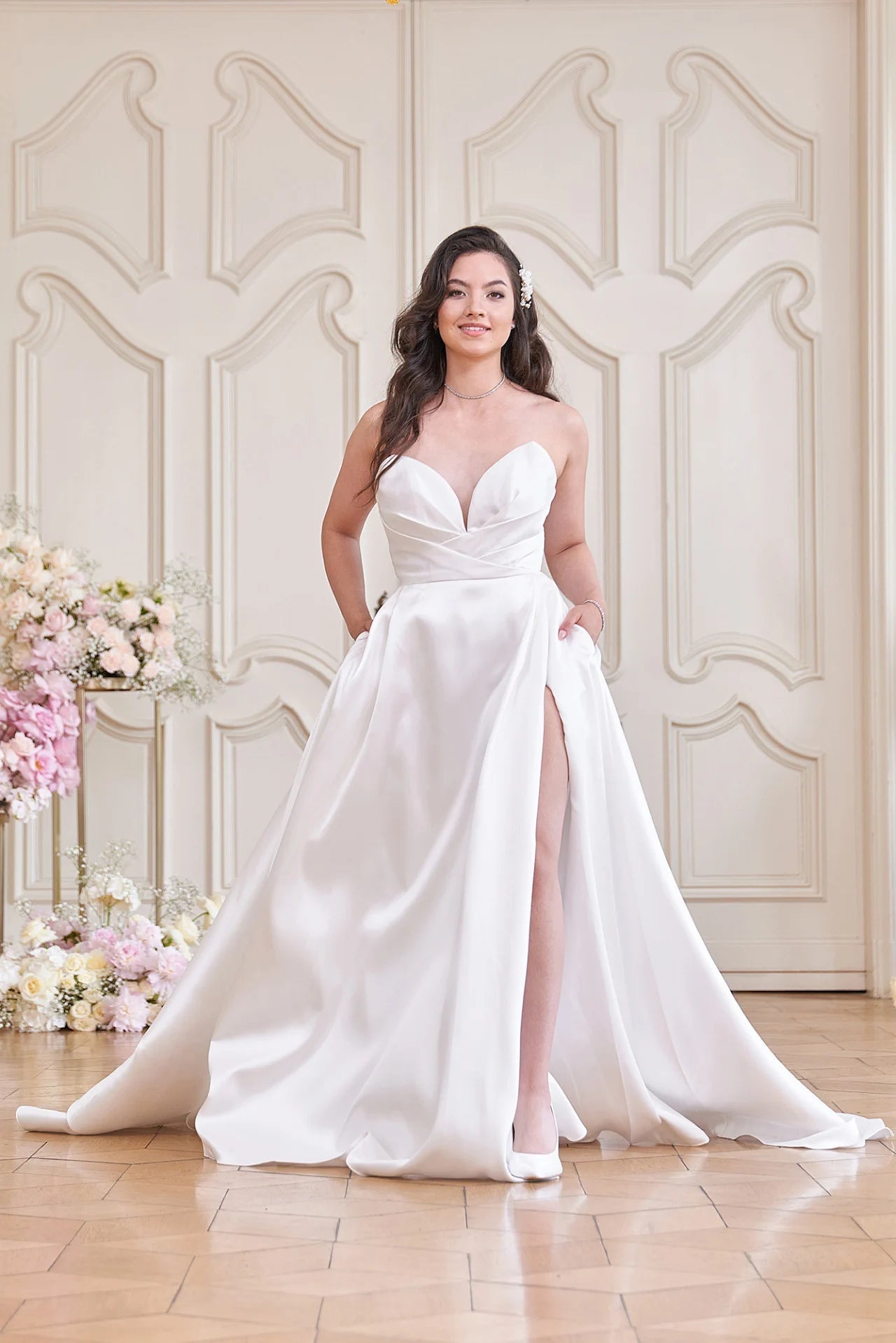 Mit dem Hochzeitskleid S24-07 siehst du an deinem besonderen Tag elegant und modern aus. Dieser schlichte, elegante Stunner in A-Linie aus Mikado hat einen Herzchen-Ausschnitt, schulterfreie Ärmel und einen geraden Rückenausschnitt, mit dem du genau den richtigen Ton triffst. Und die Taschen geben dir die Freiheit, deine wichtigsten Dinge zu verstauen. Groß rauskommen UND nach Hause gehen, ohne Kompromisse einzugehen? Das ist ein wahr gewordener Traum!