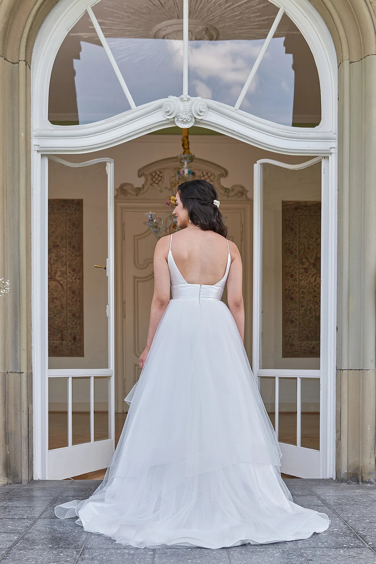 Sag "Ja" in unserem S24-14 Hochzeitskleid! Zeige einen modernen, verspielten Style mit einer A-Linien-Silhouette und schlichten Linien. Wähle zwischen einer Version aus Glitzertüll oder Tüll und entscheide, ob du es schlicht halten oder mit seitlichen Ausschnitten und einer kurzen Schleppe etwas Flare hinzufügen möchtest! Deine Gäste werden sich wünschen, dass sie geantwortet hätten.