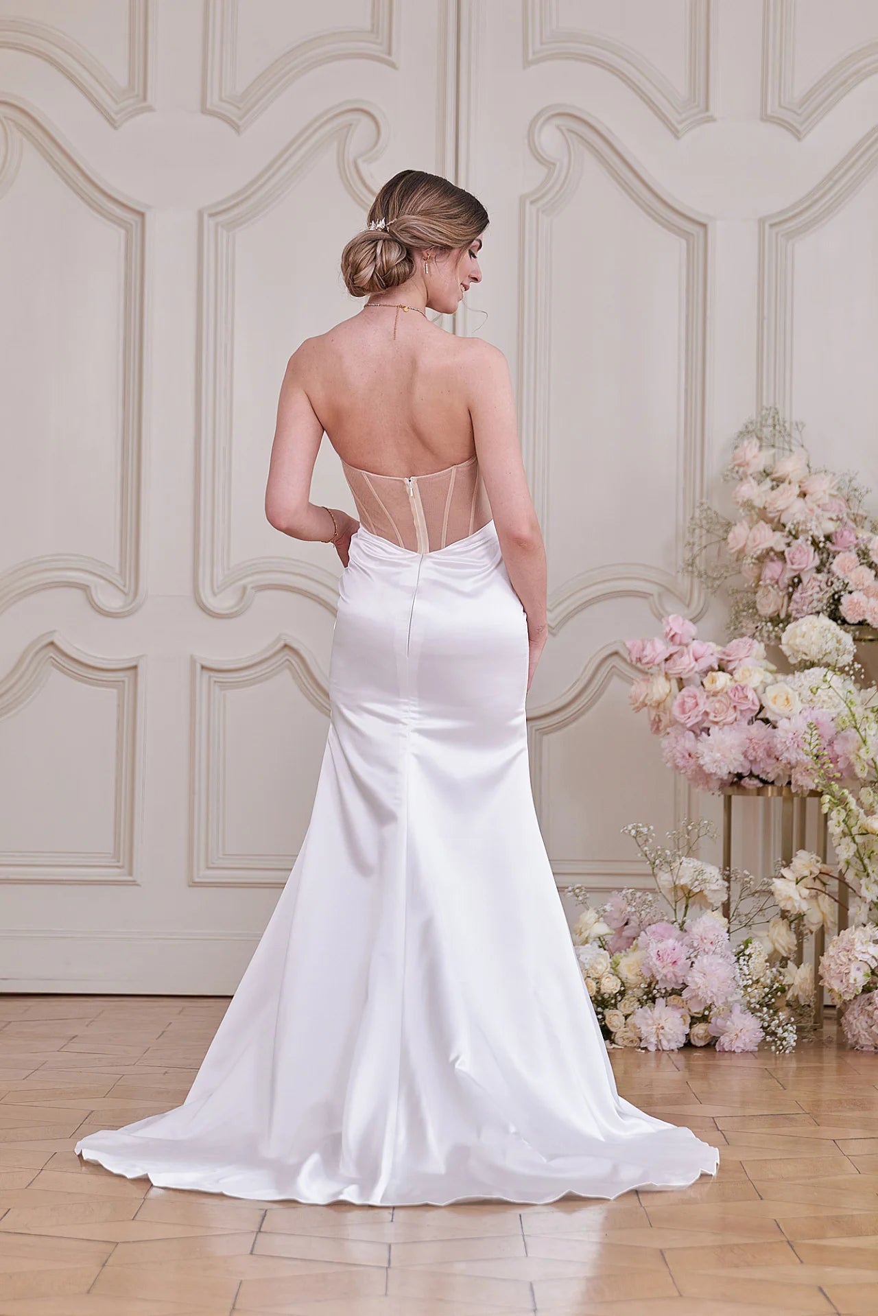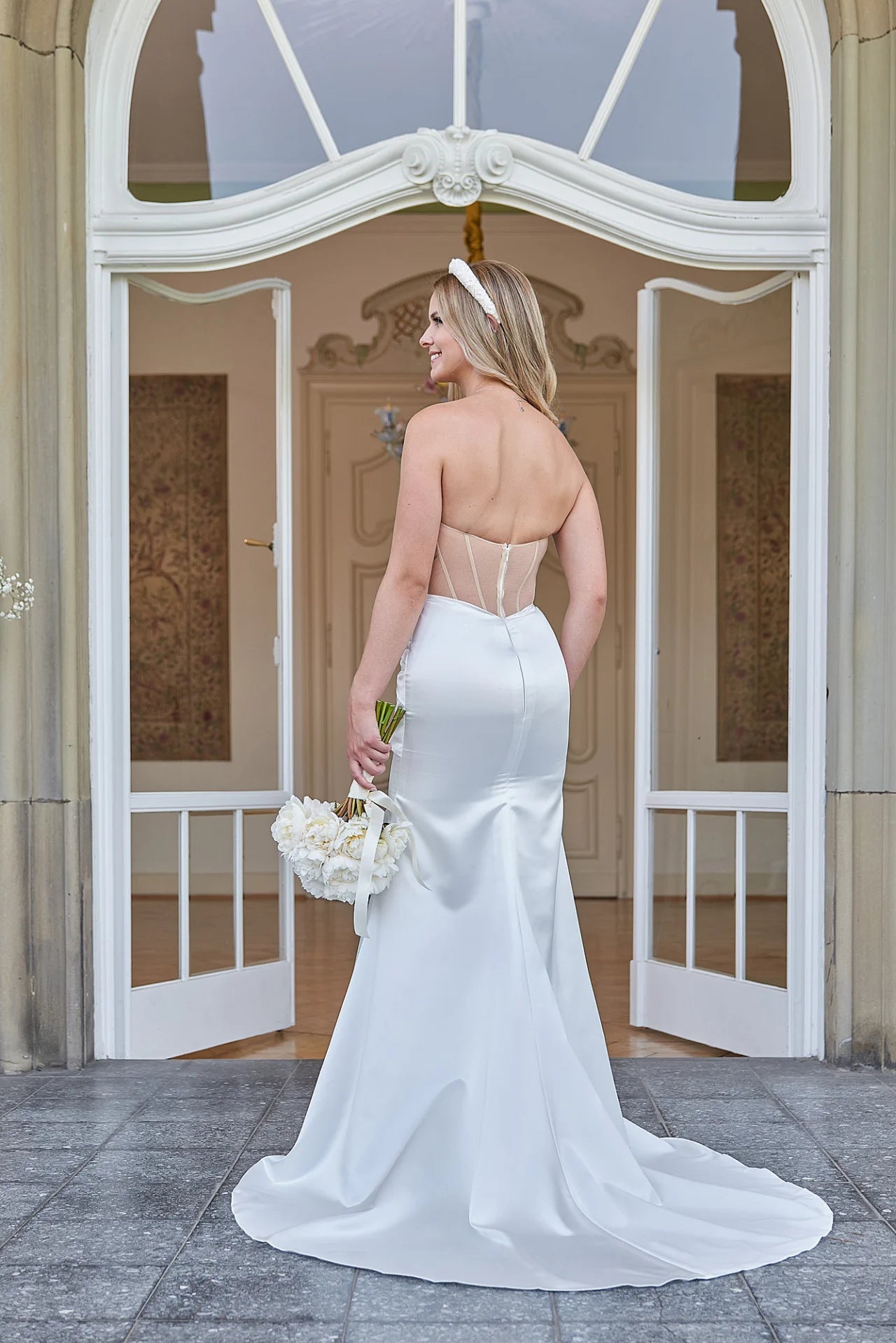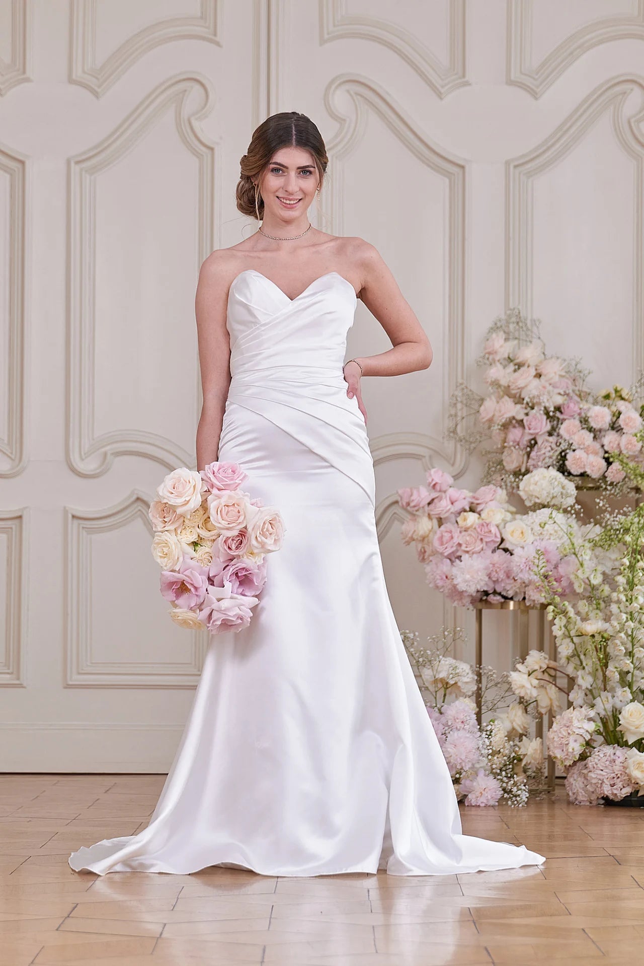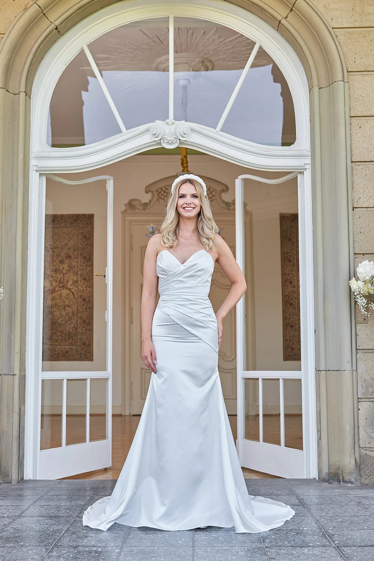 Tritt ins Rampenlicht mit diesem S24-21 Hochzeitskleid! Dieses Brautkleid aus luxuriösem Satin mit einer modernen und eleganten Fit-and-Flare-Silhouette besticht durch einen Herzchen-Ausschnitt, schulterfreie Ärmel, Raffungen in der Corsage, einen durchsichtigen Rücken und Raffungen im Rock sowie eine kurze Schleppe, die für das gewisse Etwas sorgt. Bist du bereit für dein Ja-Wort? Mit diesem Kleid bist du startklar!