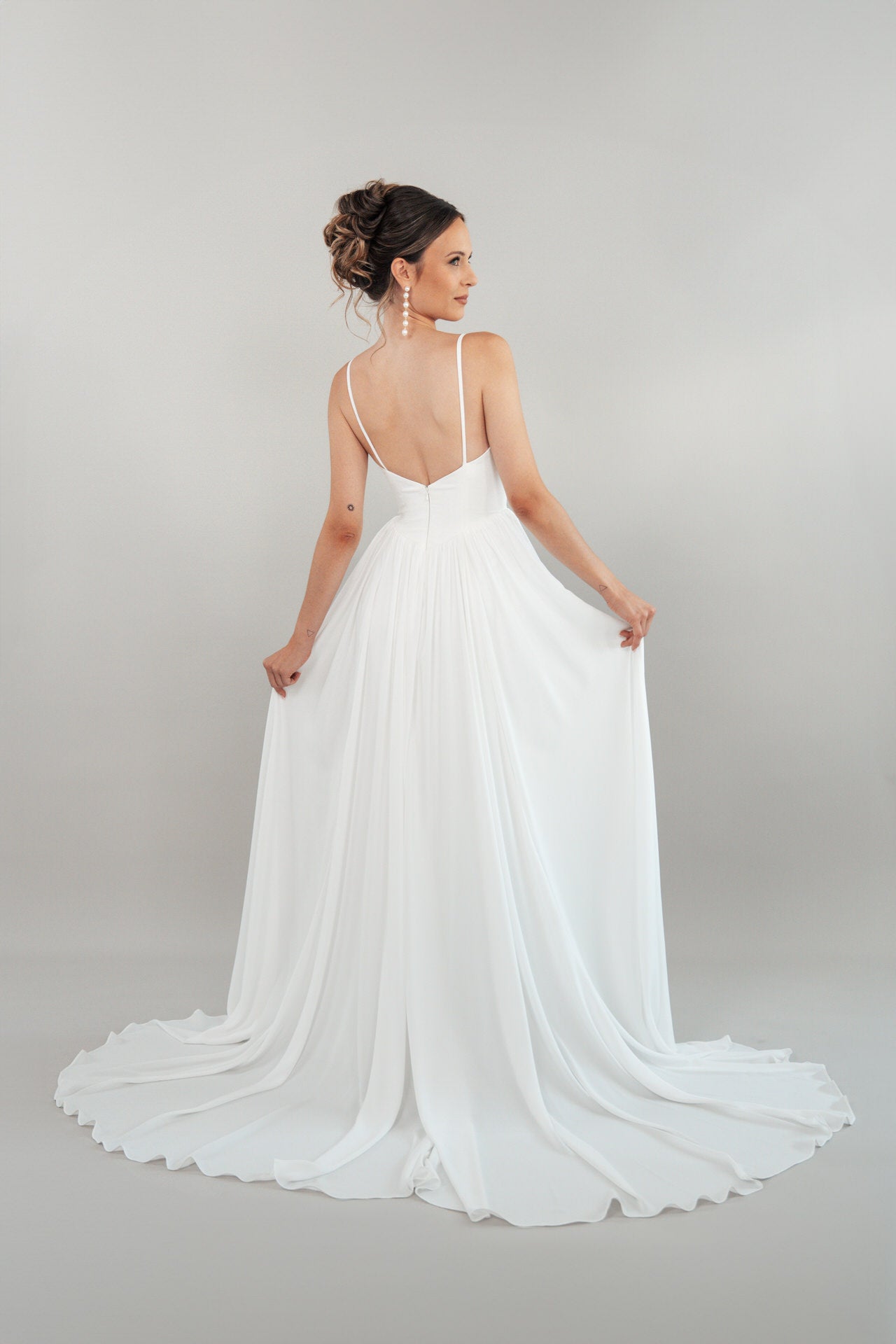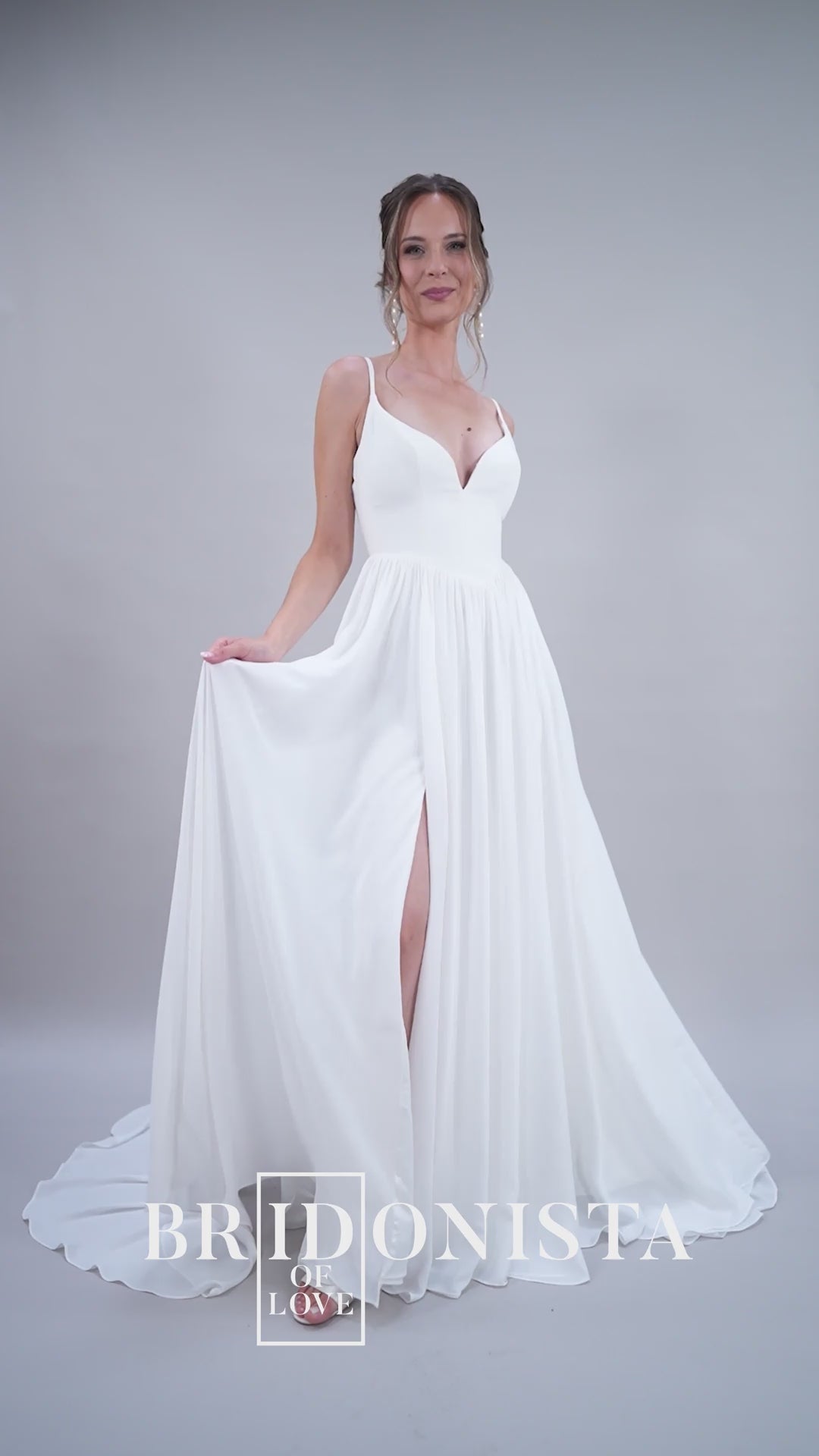Der Rücken des Kleides, mit einem tiefen V-Ausschnitt, verleiht dem minimalistischen Design eine elegante Tiefe, die den cleanen Stil perfekt abrundet. Jedes Detail des Bridonista S26-A03 ist darauf ausgelegt, deine Persönlichkeit mit purer Schlichtheit zu betonen. Der Chiffon-Stoff schimmert sanft im Licht, umspielt deine Silhouette wie ein zarter Wind und verleiht dem Kleid eine moderne, doch romantische Ausstrahlung.