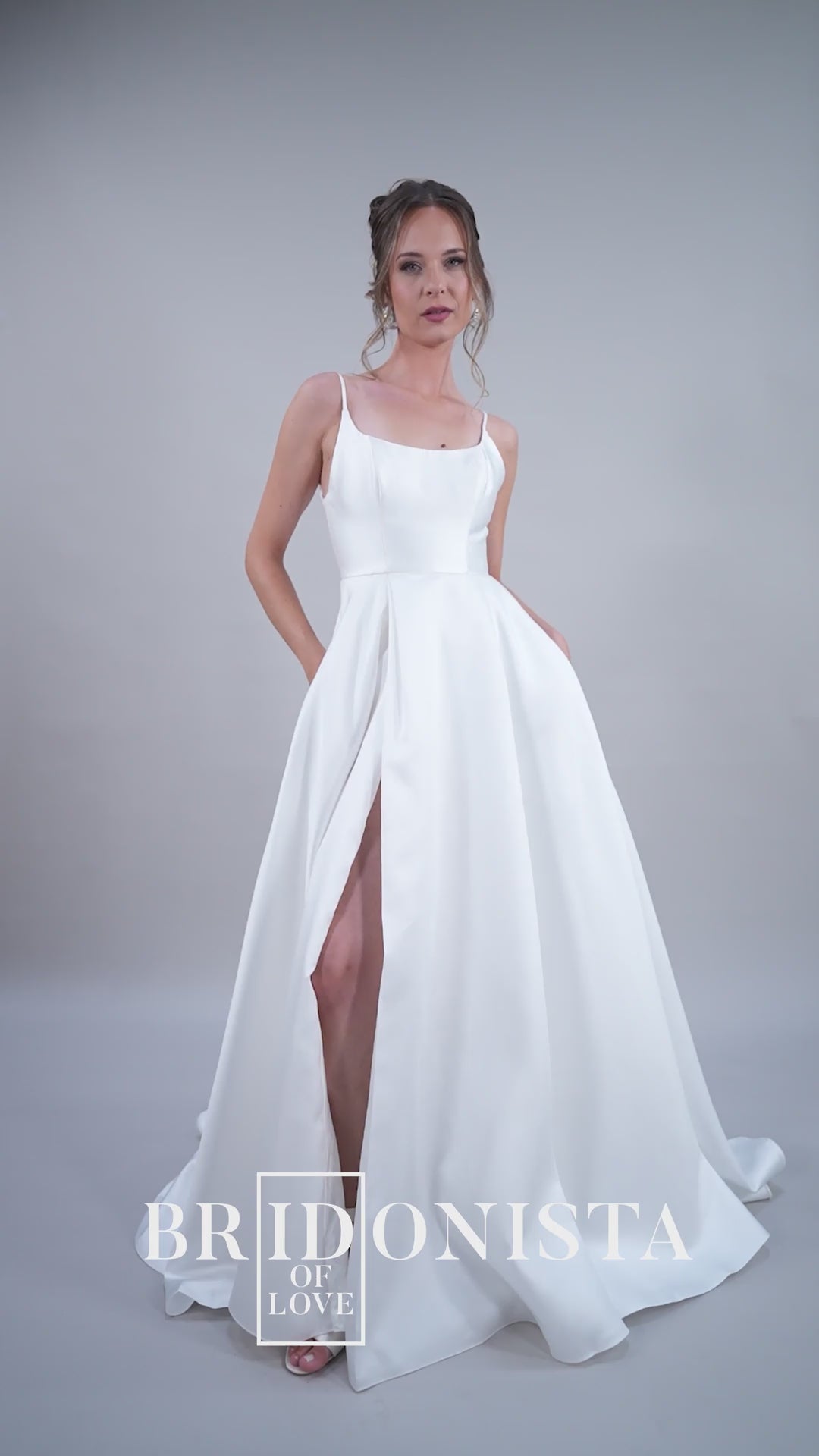 Spüre die seidige Glätte des Mikado-Stoffs, der deine Bewegungen wie eine sanfte Umarmung begleitet, und lass dich von der klaren, eleganten Linienführung dieses Kleides tragen. Mit dem Bridonista S26-A08 wirst du nicht nur eine Braut sein – du wirst eine Vision, die die Herzen aller berührt und deinen Hochzeitstag in ein zeitloses Meisterwerk verwandelt.
