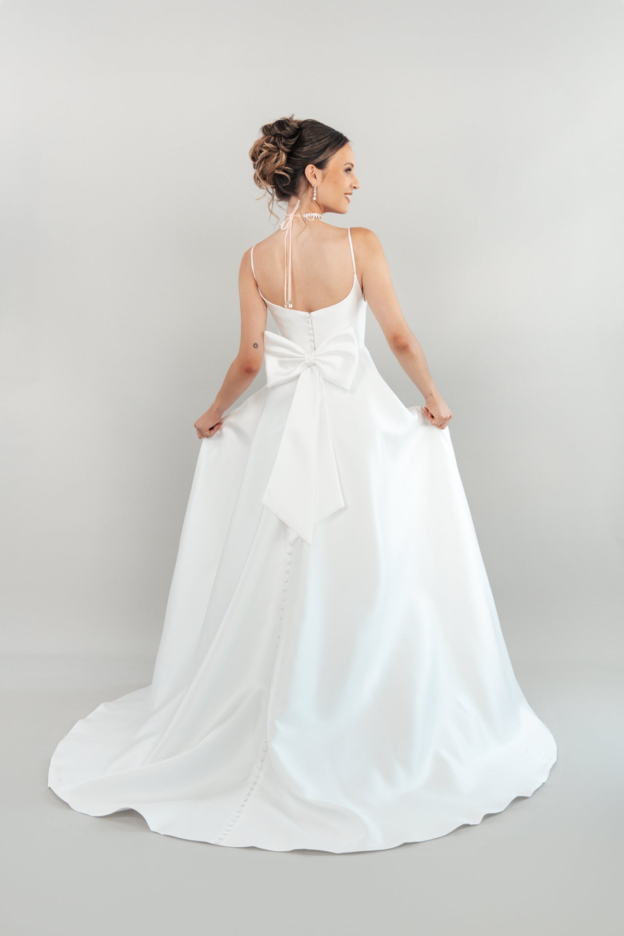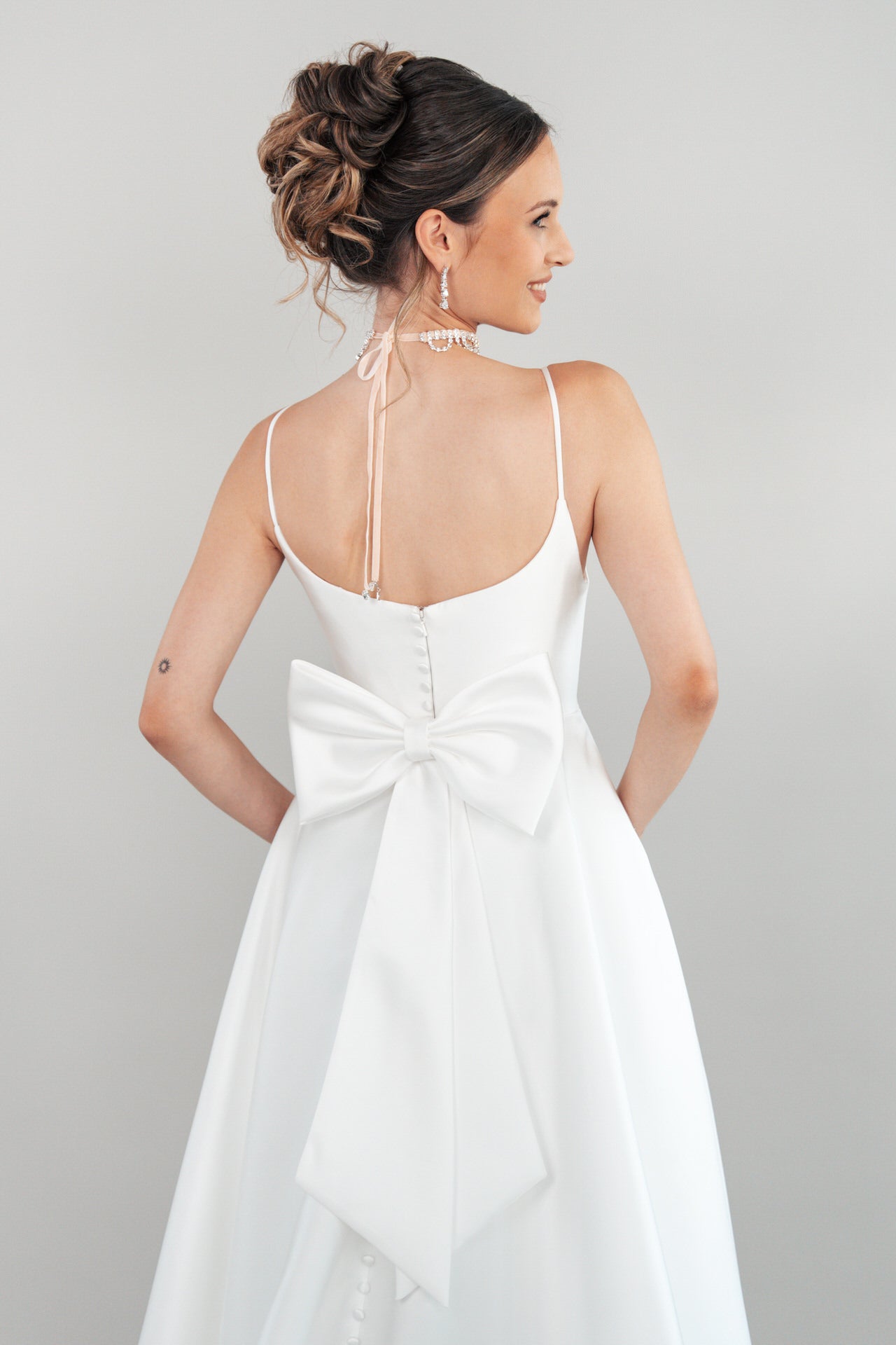 Der Rücken des Kleides, mit einem tiefen U-Ausschnitt, ist ein echter Blickfang: Er kombiniert Offenheit mit einer eleganten Knopfleiste, die dem schlichten Design eine klassische Note hinzufügt. Jedes Detail des Bridonista S26-A08 ist darauf ausgelegt, deine Persönlichkeit mit purer Eleganz zu unterstreichen. Der Mikado-Stoff schimmert sanft im Licht, umspielt deine Silhouette wie ein zarter Wind und verleiht dem Kleid eine moderne, doch majestätische Ausstrahlung.
