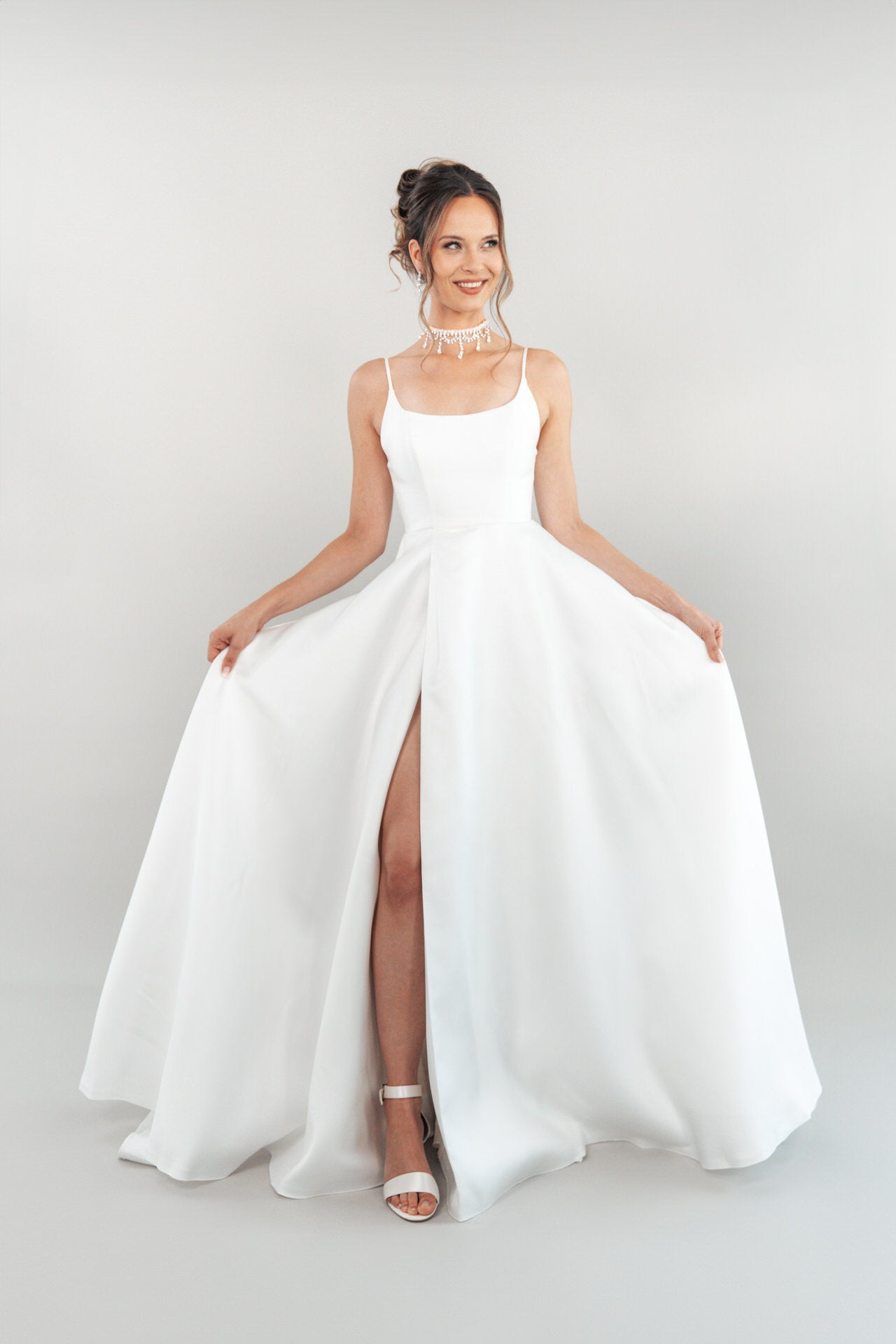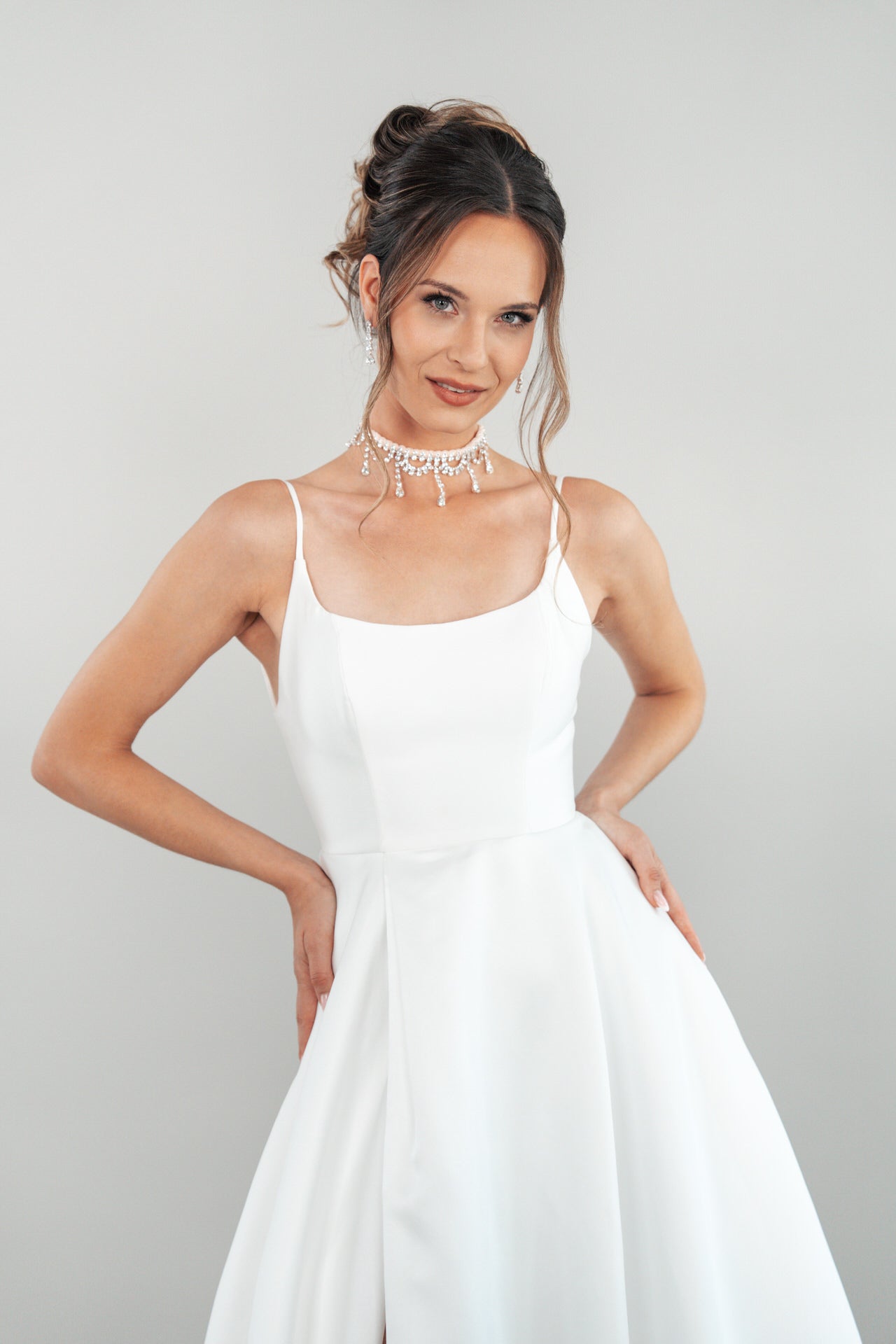 Der gerade Ausschnitt des Kleides rahmt dein Dekolleté mit einer klaren, cleanen Linie ein, die pure Raffinesse ausstrahlt und dein Strahlen hervorhebt. Die zarten Spaghetti-Träger verleihen dem Kleid eine subtile Leichtigkeit, die deine Schultern mit einer modernen, doch zeitlosen Eleganz betont. Der glatte Mikado-Rock, luxuriös und fließend, fällt in sanften Wellen und mündet in eine mittellange Schleppe, die deinem Auftritt eine königliche Dramatik verleiht. Ein dezenter Schlitz im Rock fügt eine verspielte Note hinzu, die Bewegungsfreiheit garantiert und deinem Look eine moderne Lebendigkeit schenkt.