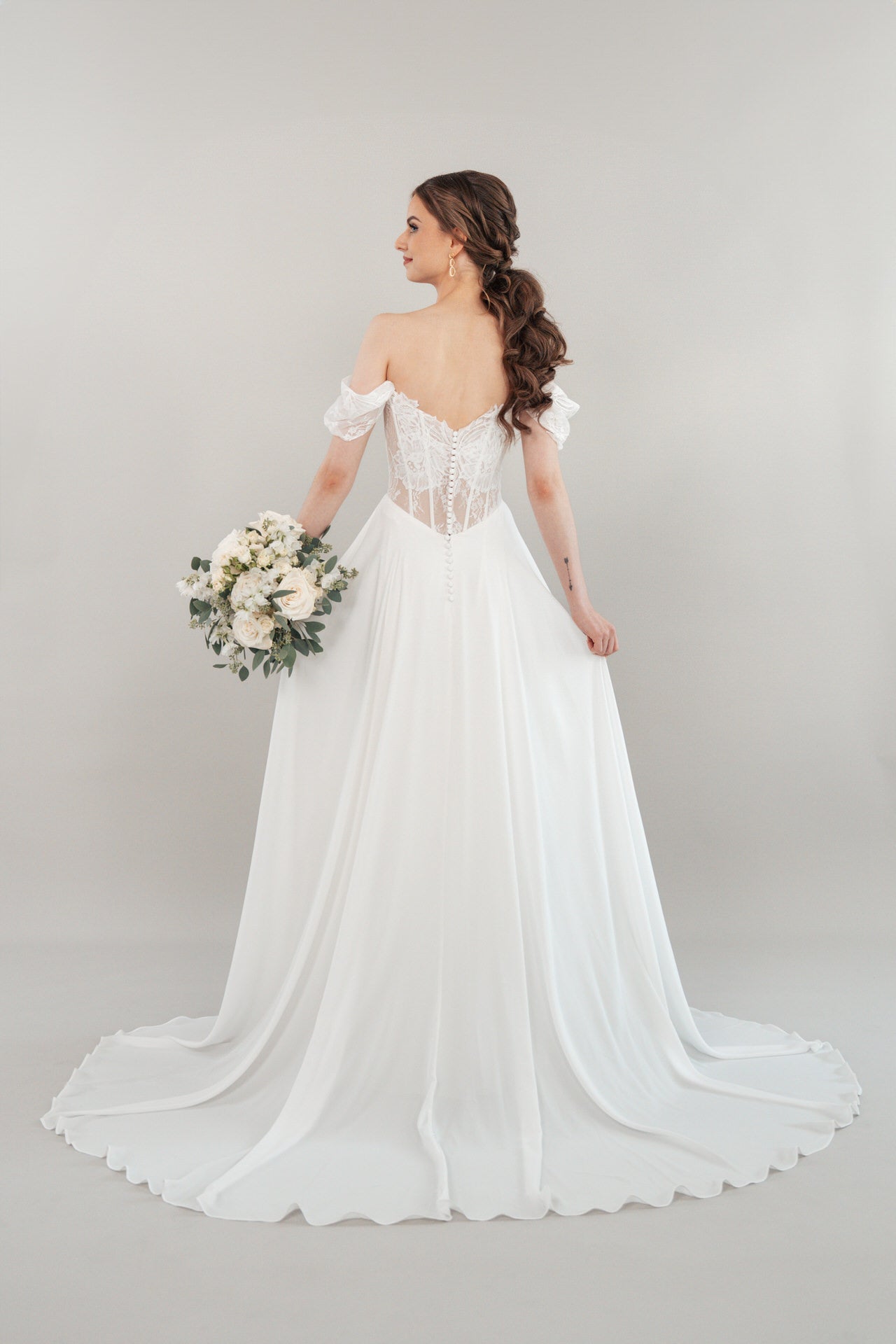 Der Rücken des Kleides, mit einem tiefen V-Ausschnitt, ist ein wahres Highlight: Er kombiniert Offenheit mit einer eleganten Knopfleiste, die dem schlichten Design eine klassische Raffinesse verleiht. Jedes Detail des Bridonista S26-A10 ist darauf ausgelegt, deine Persönlichkeit mit purer Eleganz zu unterstreichen. Die zarte Chantilly-Spitze schimmert im Licht, während der Chiffon deine Bewegungen wie ein sanfter Wind umspielt und dem Kleid eine luftige, romantische Ausstrahlung verleiht.