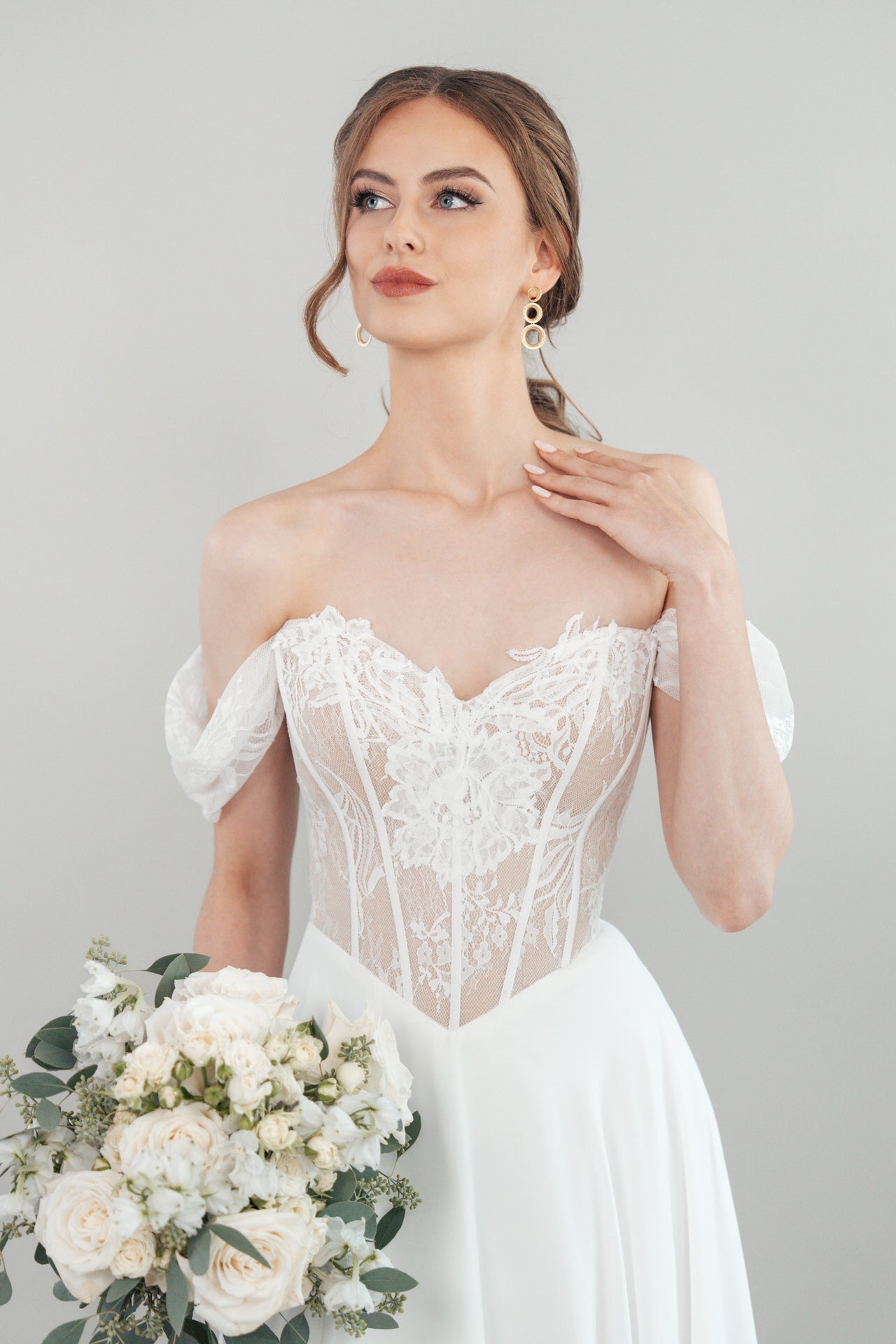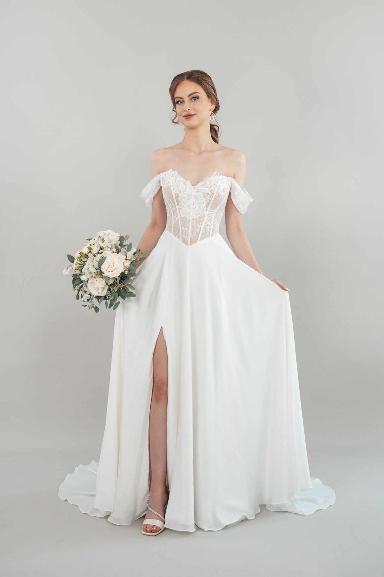 Der herzförmige Carmen-Ausschnitt, gestaltet im off-the-shoulder-Stil, rahmt dein Dekolleté mit einer zarten, romantischen Linie ein, die deine Schultern und dein Schlüsselbein auf subtile Weise betont. Die filigrane Chantilly-Spitze verleiht dem Kleid einen Tattoo-Look, der wie ein kunstvolles Muster auf deiner Haut liegt, während der Lingerie-Look einen Hauch von Verführung einbringt, der dennoch geschmackvoll bleibt. Der fließende Chiffon-Rock, luftig und leicht, fällt in sanften Wellen und mündet in eine mittellange Schleppe, die deinem Auftritt eine romantische Dramatik verleiht. Ein dezenter Schlitz im Rock fügt eine verspielte Note hinzu, die Bewegungsfreiheit schenkt und deinen Look mit Lebendigkeit erfüllt.
