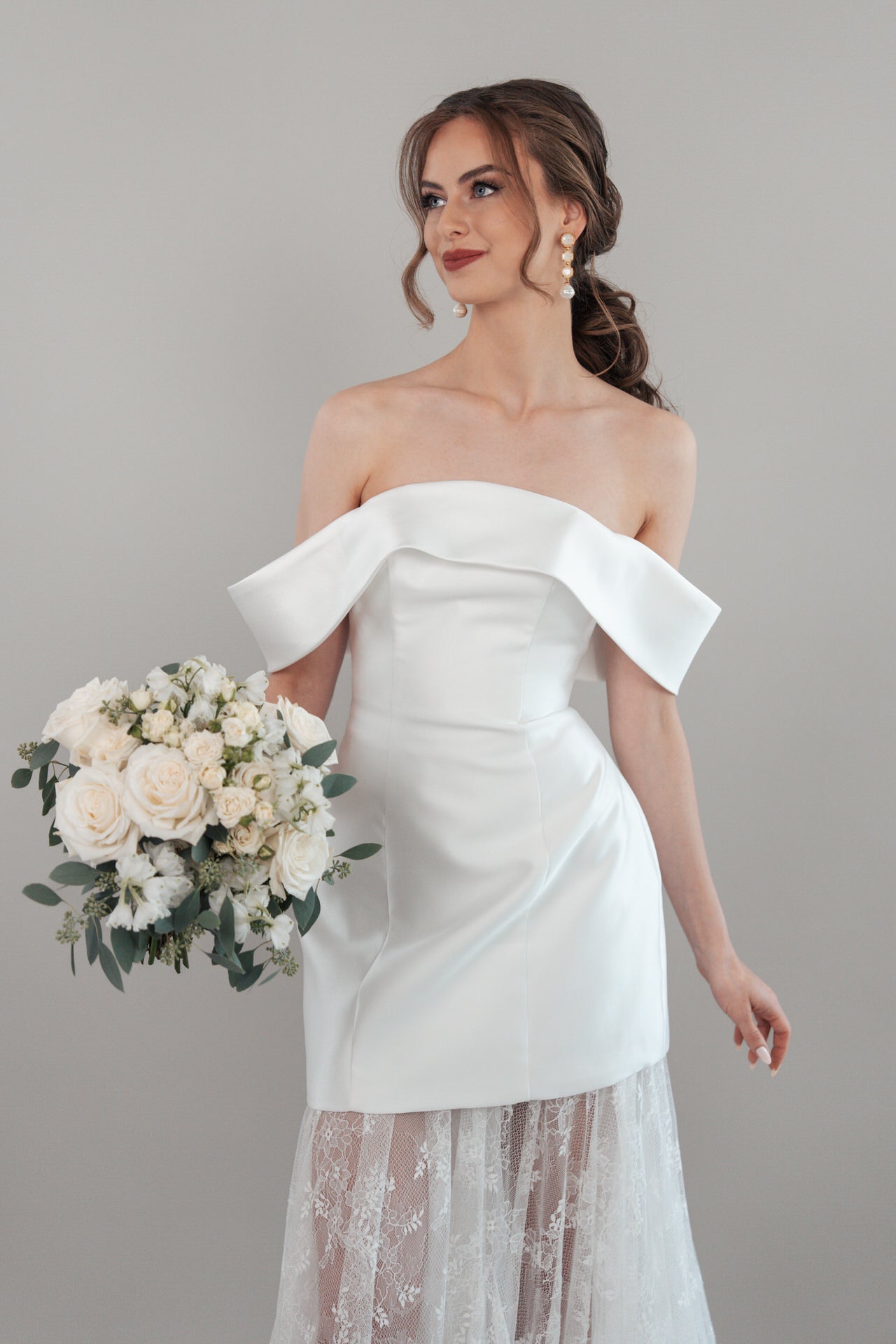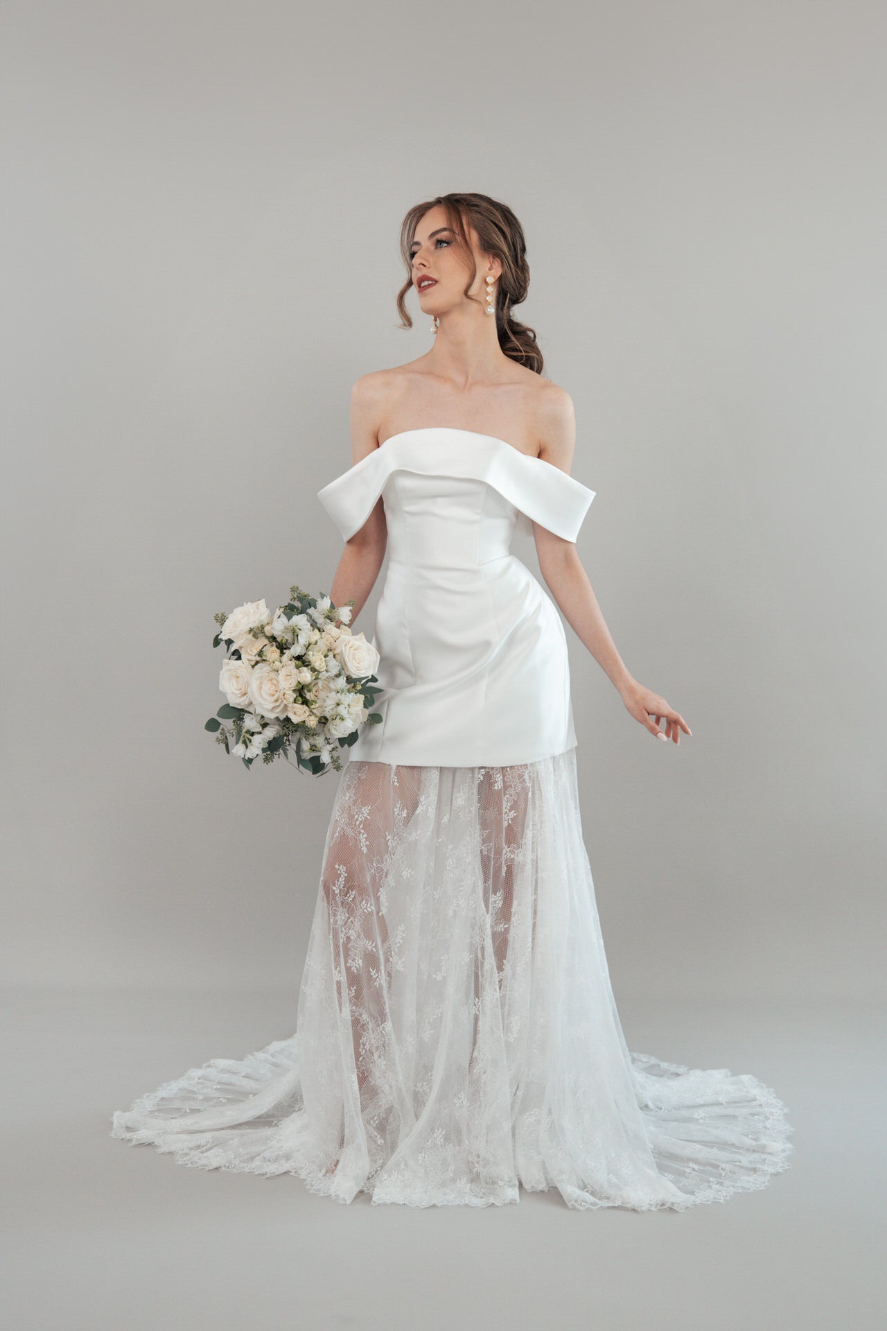 Der gerade Carmen-Ausschnitt, gestaltet im off-the-shoulder-Stil, rahmt dein Dekolleté mit einer zarten, elegante Linie ein, die deine Schultern und dein Schlüsselbein auf eine anmutige Weise hervorhebt. Die glatte Mikado-Oberfläche verleiht dem Kleid eine cleane, moderne Ausstrahlung, während der Überrock aus feiner Chantilly-Spitze einen romantischen Kontrast schafft, der deinen Look verfeinert. Der knielange Rock, kombiniert mit einer kurzen Schleppe, verleiht deinem Auftritt eine subtile Dramatik, die sowohl elegant als auch praktisch ist, ideal für eine Zeremonie im Freien oder in einem festlichen Saal.