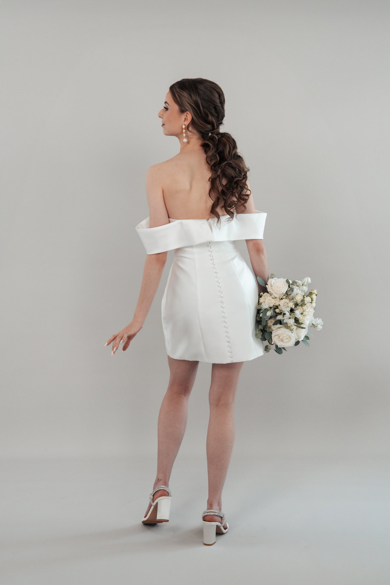 Der gerade Carmen-Ausschnitt, gestaltet im off-the-shoulder-Stil, rahmt dein Dekolleté mit einer zarten, anmutigen Linie ein, die deine Schultern und dein Schlüsselbein auf eine elegante Weise betont. Die glatte Mikado-Oberfläche verleiht dem Kleid einen cleanen, modernen Look, der deine Silhouette mit purer Raffinesse umspielt. Der knielange Rock, kurz und praktisch, wird durch eine dezente Knopfleiste am Rücken akzentuiert, die dem Design eine klassische Note verleiht und den geraden Rückenausschnitt harmonisch abrundet.