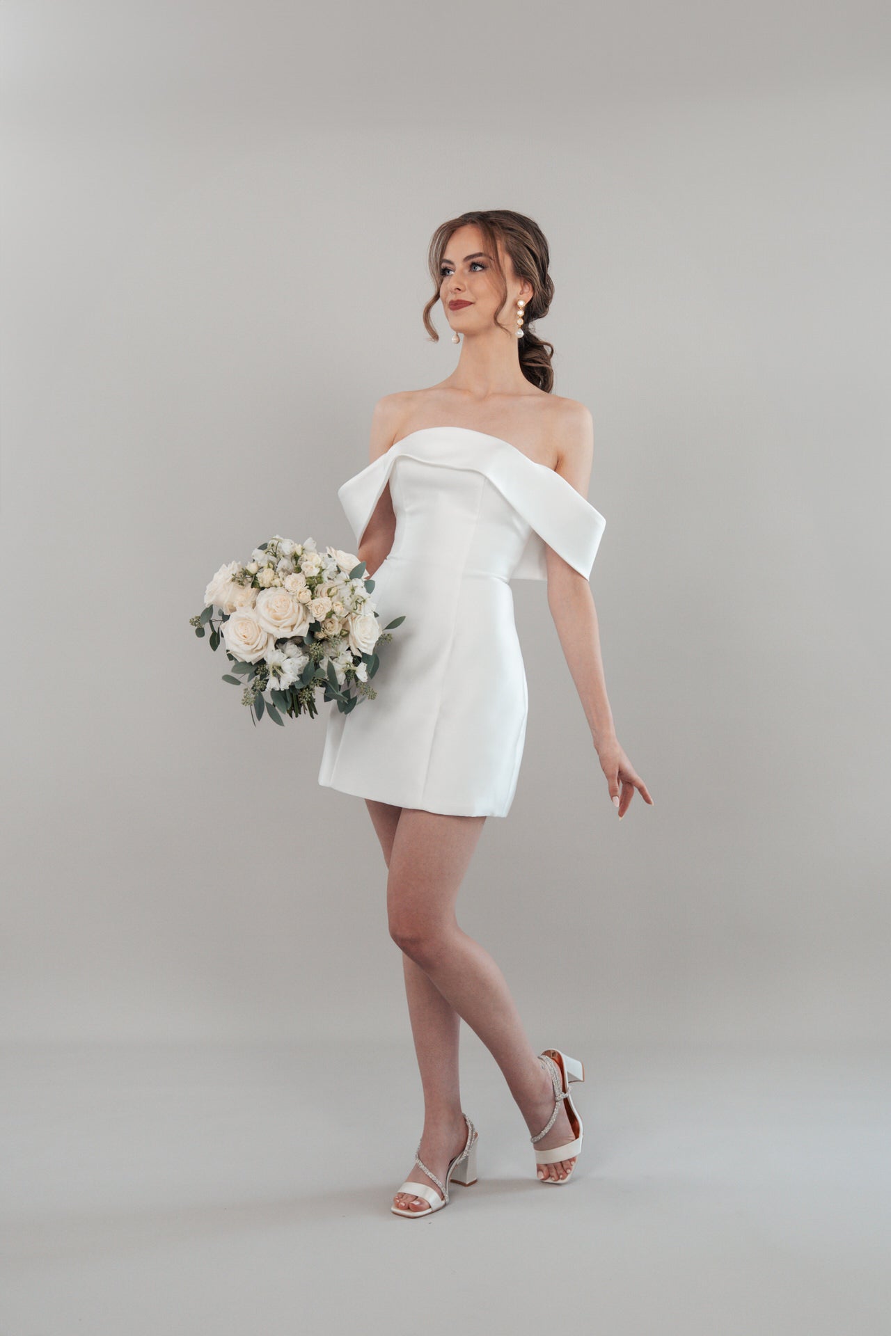 Spüre die seidige Glätte des Mikado-Stoffs, der deine Bewegungen wie eine sanfte Umarmung begleitet, und lass dich von der klaren, eleganten Linienführung dieses Kleides tragen. Mit dem Bridonista S26-A11(D) wirst du nicht nur eine Braut sein – du wirst eine Vision, die die Herzen aller berührt und deinen Standesamts-Tag in ein zeitloses Meisterwerk verwandelt.