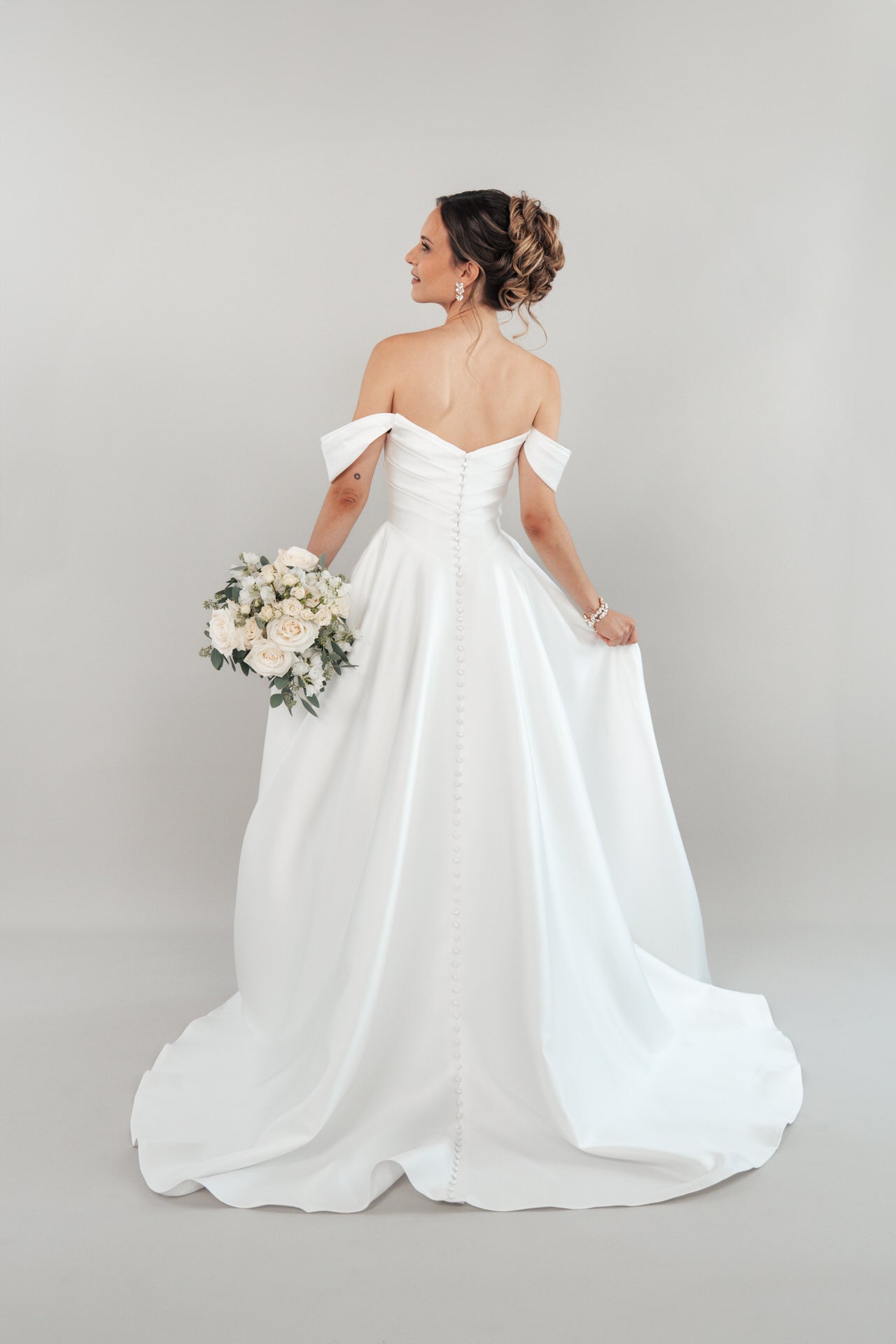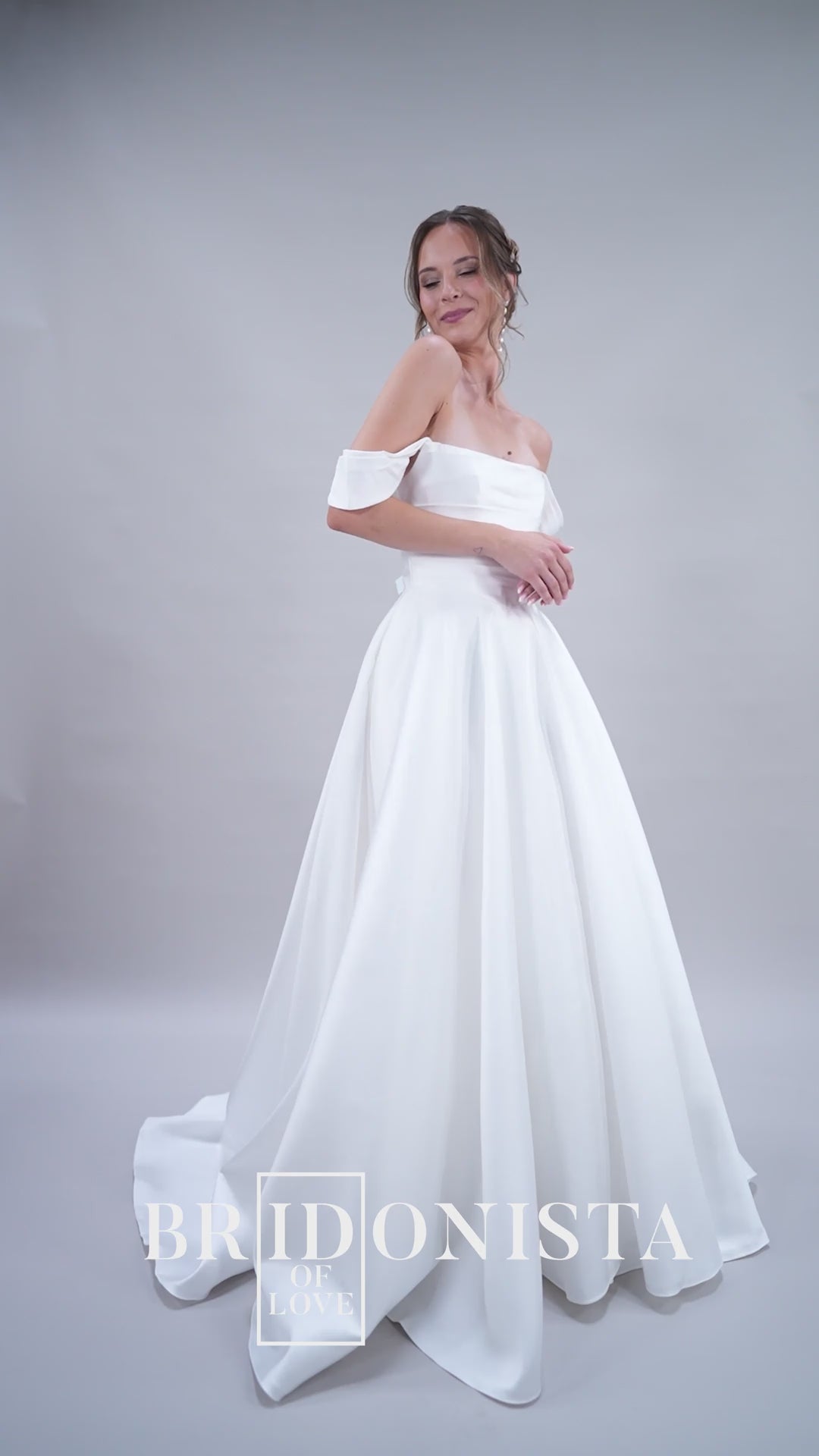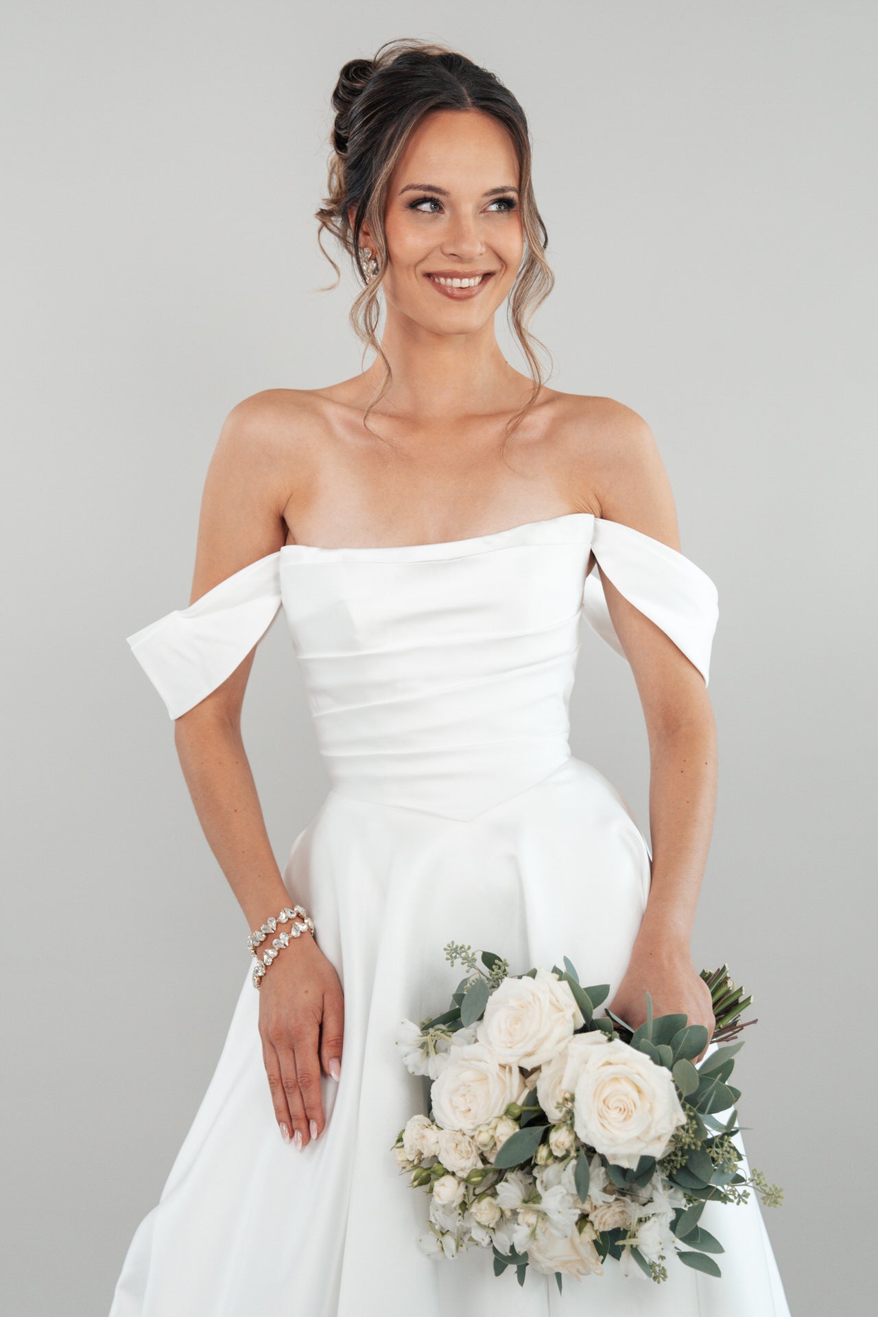 Der gerade Carmen-Ausschnitt, mit einer off-the-shoulder-Gestaltung, rahmt dein Dekolleté mit einer eleganten, schulterfreien Linie ein, die eine perfekte Balance zwischen Romantik und moderner Schlichtheit schafft. Diese Gestaltung betont deine Schultern und Schlüsselbeine auf eine Weise, die sowohl anmutig als auch selbstbewusst wirkt, und verleiht dem Kleid eine subtile, königliche Ausstrahlung. Der glatte Mikado-Rock, luxuriös und fließend, fällt in sanften Wellen und mündet in eine mittellange Schleppe, die deinem Auftritt eine royale Dramatik verleiht, ohne dich einzuschränken.
