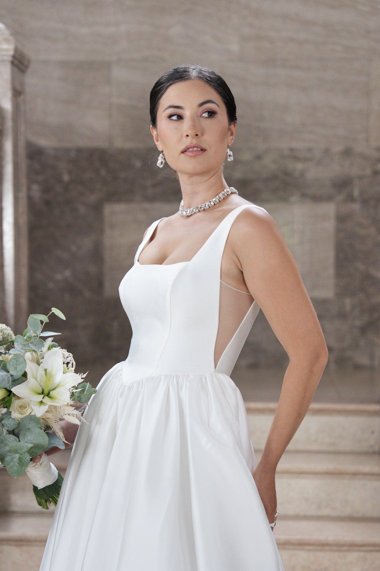 Der quadratische Ausschnitt des Kleides rahmt dein Dekolleté mit einer klaren, cleanen Linie ein, die eine moderne, doch elegante Ausstrahlung verleiht und dein Strahlen hervorhebt. Die schlichte Gestaltung wird durch subtile Cutouts an den Seiten der Corsage bereichert, die dem Kleid eine moderne Note verleihen, ohne die minimalistische Ästhetik zu stören. Der glatte Mikado-Rock, luxuriös und fließend, fällt in sanften Wellen und mündet in eine mittellange Schleppe, die deinem Auftritt eine royale Dramatik verleiht, ohne dich einzuschränken.