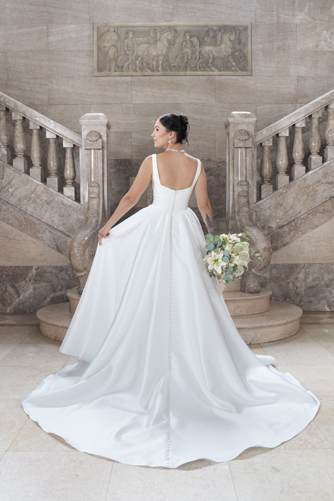 Der Rücken des Kleides, mit einem tiefen U-Ausschnitt, ist ein echter Blickfang: Er kombiniert Offenheit mit einer zarten Knopfleiste, die dem cleanen Look eine klassische, königliche Note hinzufügt. Jedes Detail des Bridonista S26-B02 ist darauf ausgelegt, deine Persönlichkeit mit purer Eleganz zu unterstreichen. Der Mikado-Stoff schimmert sanft im Licht, umspielt deine Silhouette wie eine sanfte Brise und verleiht dem Kleid eine moderne, doch majestätische Ausstrahlung.