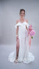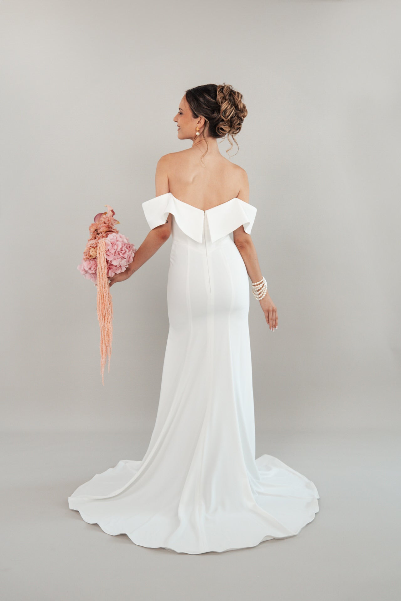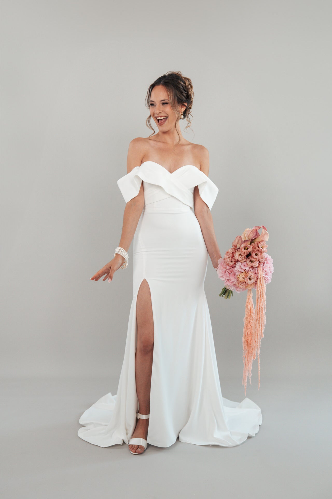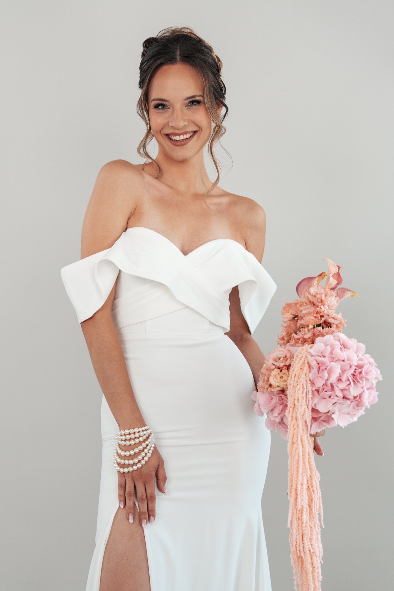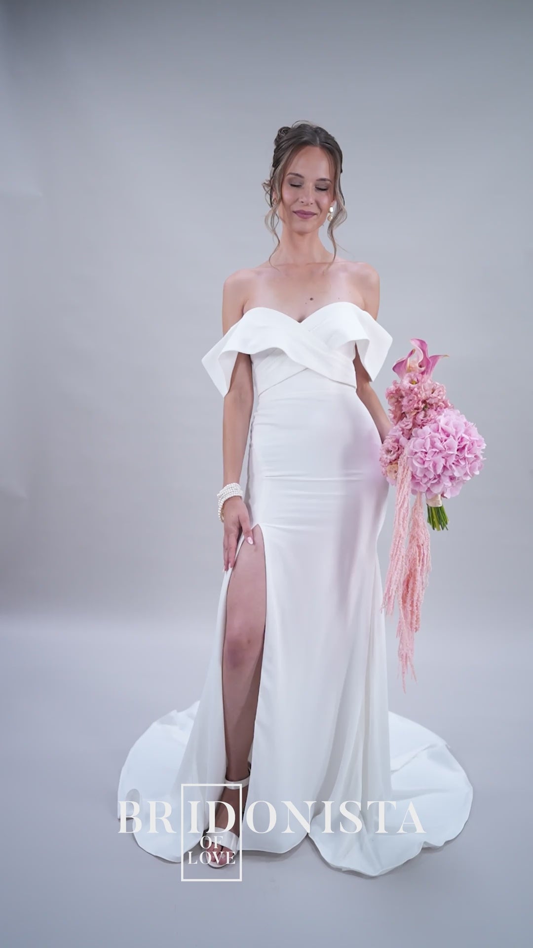 Der aufregende Schlitz an der Vorderseite ist ein besonderes Detail, das Bewegungsfreiheit und einen modernen Twist einbringt. Er erlaubt dir, mit jedem Schritt eine selbstbewusste Eleganz zu zeigen, während der glatte Crepe-Stoff im Licht sanft schimmert und deine Figur sanft umschmeichelt. Die perfekte Verbindung aus Schlichtheit und Stil macht dieses Kleid zu einem Begleiter, der dich in jedem Moment deines besonderen Tages begleitet.