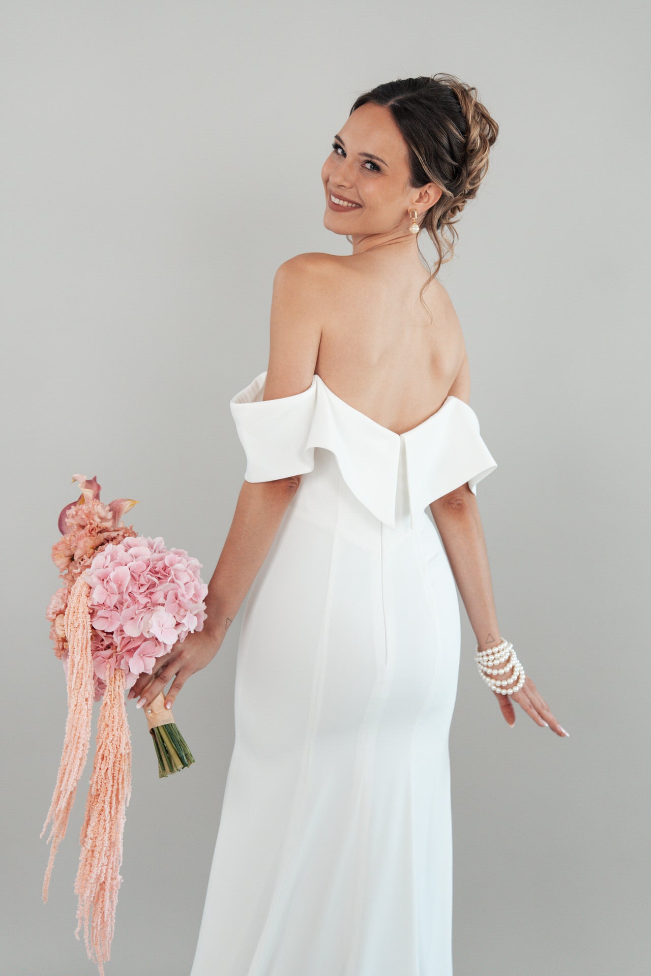 Tauche ein in die zeitlose Schönheit des Bridonista S26-F02, ein Kleid, das deine Eleganz auf einzigartige Weise hervorhebt. Gefertigt aus glattem Crepe, umhüllt der Stoff deinen Körper mit einer sanften, fließenden Haptik, die sich wie eine zweite Haut anfühlt. Der Fit-and-Flare-Schnitt betont deine Taille mit einer klaren Linie und erweitert sich zu einer kurzen Schleppe, die bei jedem Schritt eine elegante Note hinzufügt – ideal für eine stilvolle Standesamtszeremonie, die auf Minimalismus setzt.