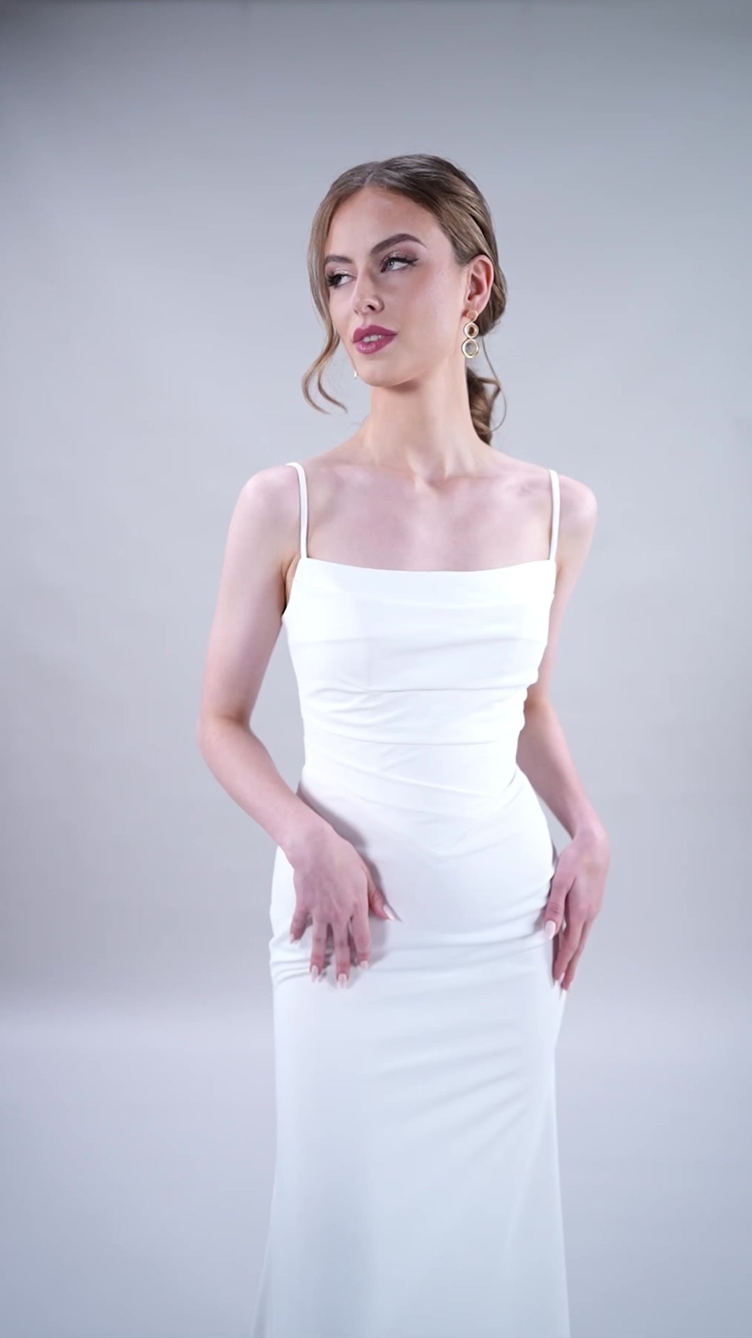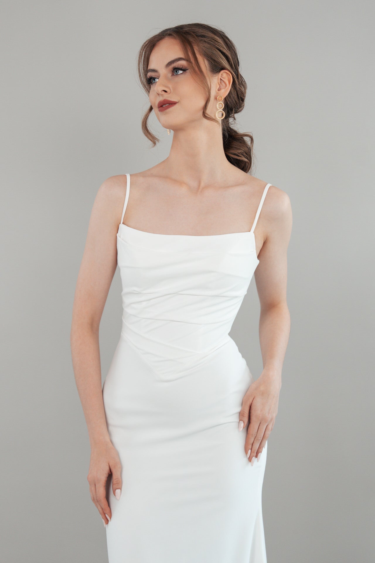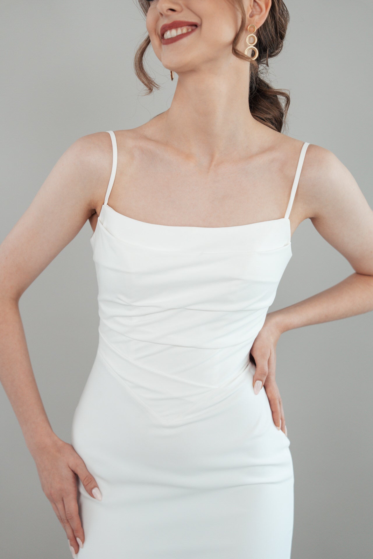 Entdecke die pure Eleganz des Bridonista S26-F04, ein Kleid, das deine Schönheit auf subtile Weise zum Strahlen bringt. Hergestellt aus glattem Crepe, schmiegt sich der Stoff sanft an deine Haut und schenkt dir ein Gefühl von Leichtigkeit und Komfort. Der Fit-and-Flare-Schnitt betont deine Taille mit raffinierten Raffungen und erweitert sich zu einer kurzen Schleppe, die bei jedem Schritt eine elegante Note hinzufügt – perfekt für eine stilvolle Standesamtszeremonie, die auf Minimalismus setzt.