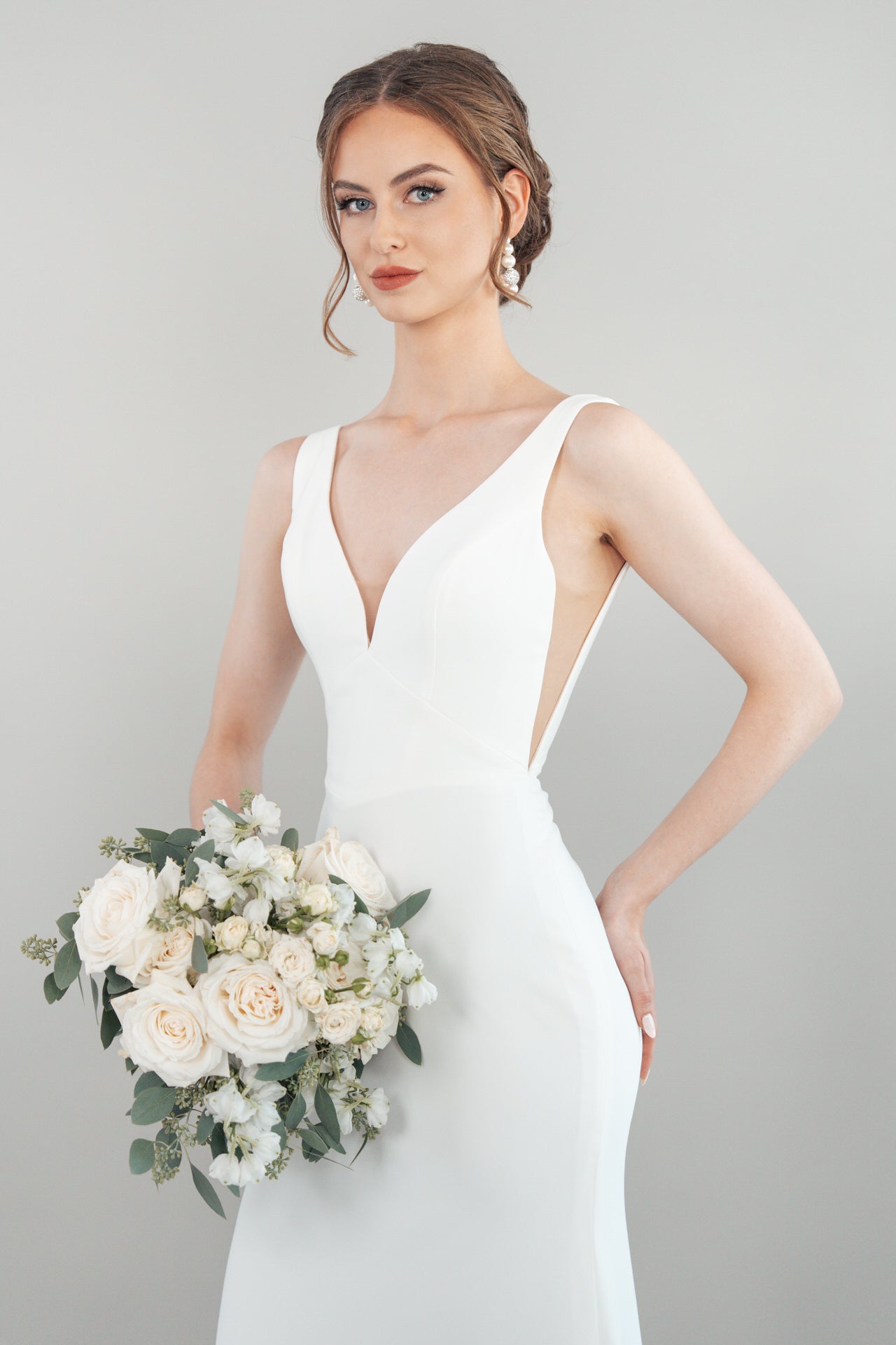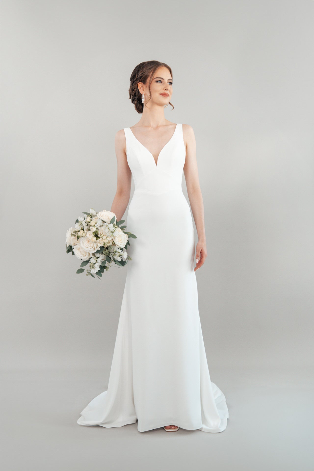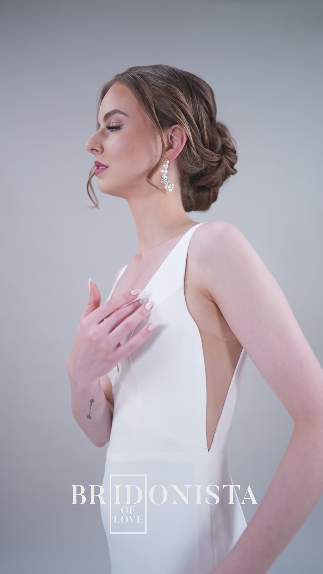 Lass dich von der zeitlosen Anmut des Bridonista S26-F05 verzaubern, einem Kleid, das Schlichtheit und Eleganz auf eine Weise vereint, die dich in den Mittelpunkt stellt. Gefertigt aus glattem Crepe, schmiegt sich der Stoff sanft an deine Silhouette und schenkt dir ein Gefühl von Leichtigkeit und Komfort. Der Fit-and-Flare-Schnitt umarmt deine Taille mit einer klaren Linie und geht in eine kurze Schleppe über, die bei jedem Schritt eine elegante Bewegung erzeugt – perfekt für eine stilvolle Standesamtszeremonie, wo Minimalismus im Vordergrund steht.