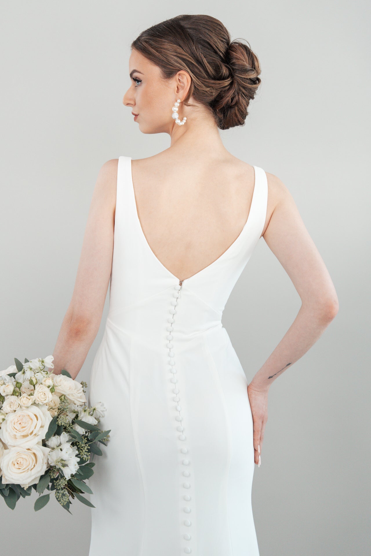 Die Knopfleiste am Rücken ist ein besonderes Merkmal, das das Design aufwertet. Diese feinen Knöpfe ziehen sich entlang des Crepe-Stoffes und verleihen dem Kleid eine handwerkliche Präzision, die sowohl traditionell als auch zeitgemäß wirkt. Jeder Knopf sitzt perfekt und sorgt dafür, dass das Kleid sich angenehm an deine Haut schmiegt, während es deine Haltung mit Grazie unterstreicht.