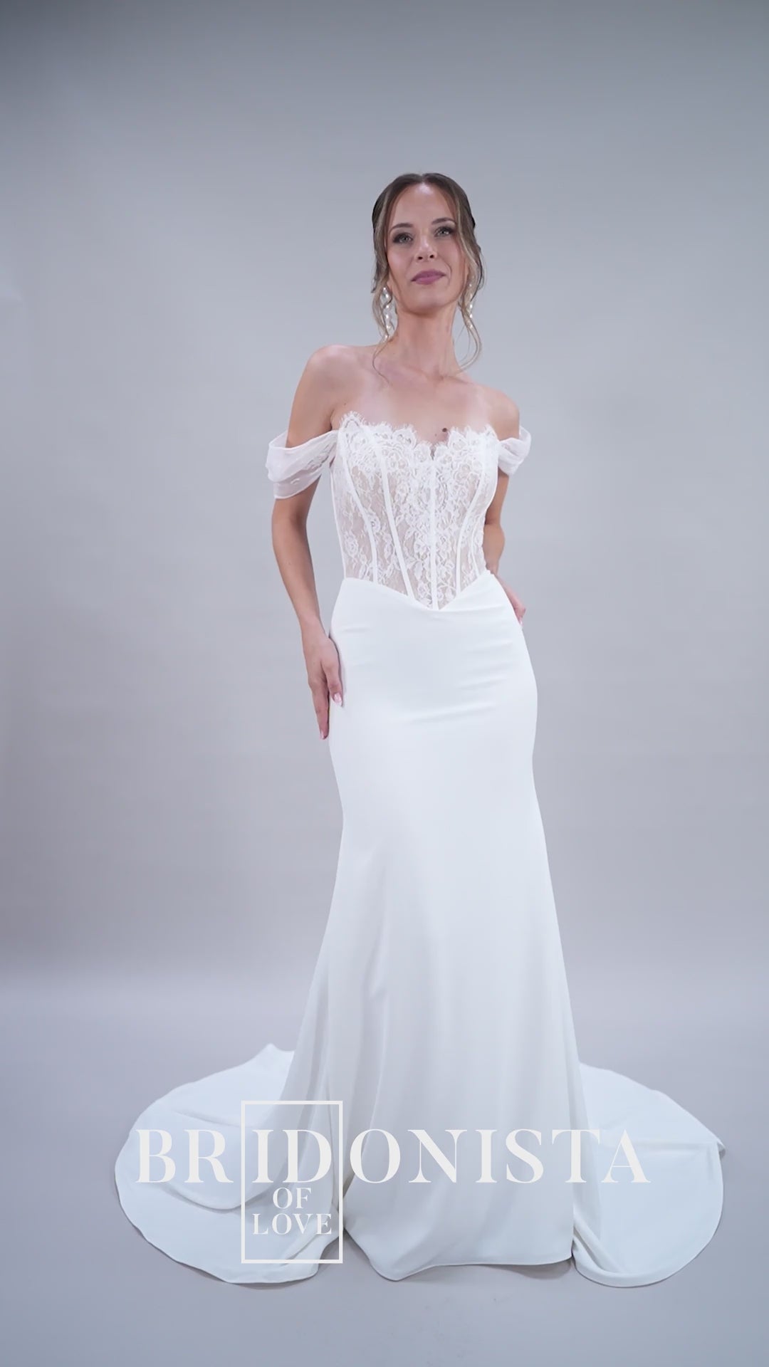 Der Rücken des Kleides, mit einem tiefen V-Ausschnitt, ist ein echter Blickfang: Er kombiniert Offenheit mit einer zarten Knopfleiste, die dem romantischen Design eine klassische Eleganz hinzufügt. Jedes Detail des Bridonista S26-F07 ist darauf ausgelegt, deine Persönlichkeit mit purer Anmut zu unterstreichen. Der glatte Crepe-Stoff schimmert sanft im Licht, während die Chantilly-Spitze deine Silhouette wie ein zarter Schleier umspielt und dem Kleid eine zeitlose, elegante Ausstrahlung verleiht.
