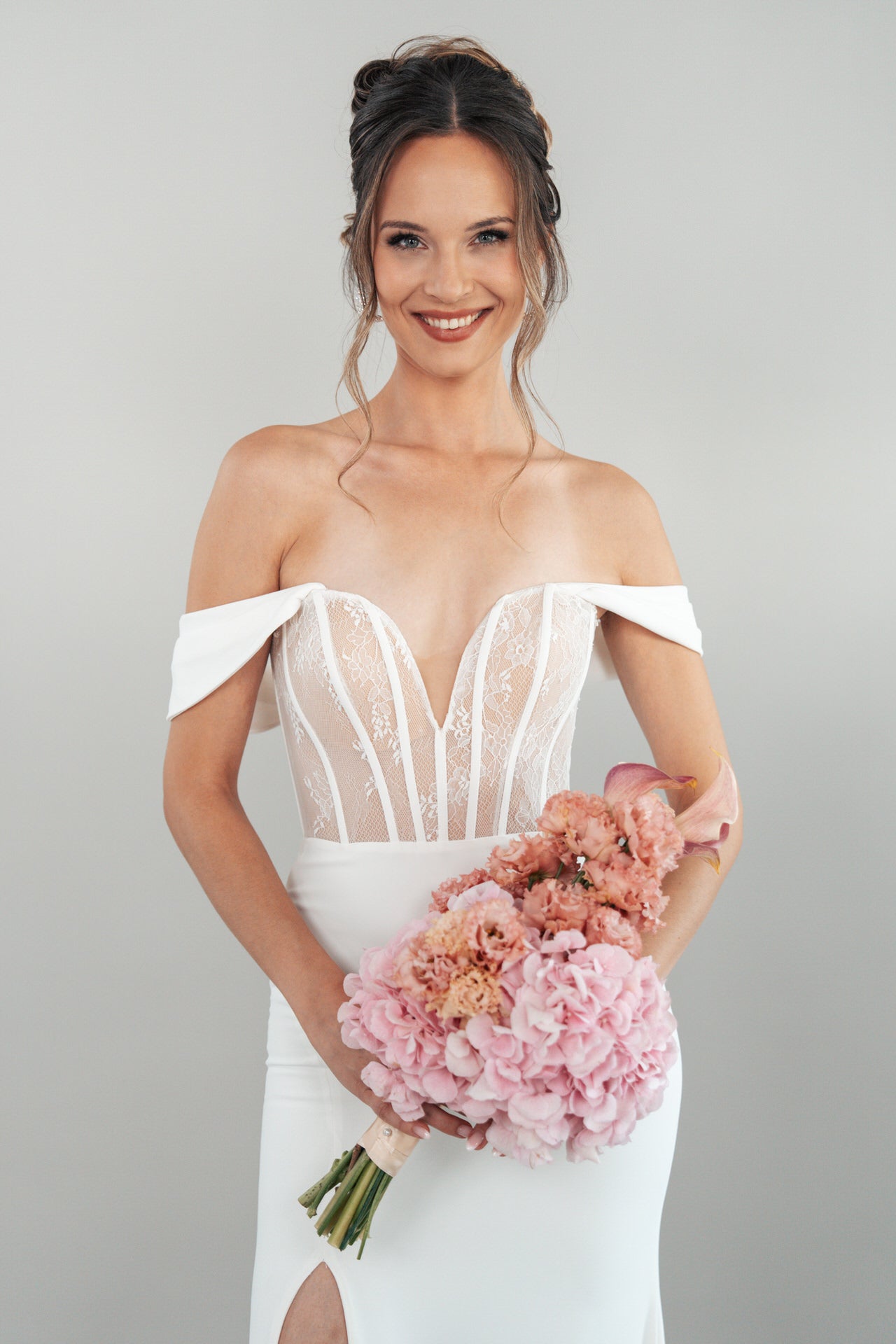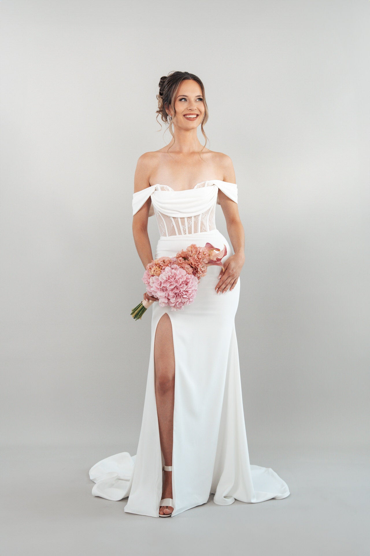 Der herzförmige Carmen-Ausschnitt, gestaltet im off-the-shoulder-Stil, rahmt dein Dekolleté mit einer zarten, romantischen Linie ein, die deine Schultern und dein Schlüsselbein auf eine verführerische Weise betont. Die feine Chantilly-Spitze verleiht dem Kleid einen Lingerie-Look, der wie ein hauchdünnes Kunstwerk über deine Haut gleitet und einen Hauch von Sinnlichkeit mit romantischem Charme verbindet. Der glatte Crepe-Rock, luftig und geschmeidig, fällt in sanften Wellen und mündet in eine mittellange Schleppe, die deinem Auftritt eine anmutige Dramatik verleiht. Ein dezenter Schlitz im Rock fügt eine verspielte Note hinzu, die Bewegungsfreiheit gewährleistet und deinen Look mit Lebendigkeit erfüllt.