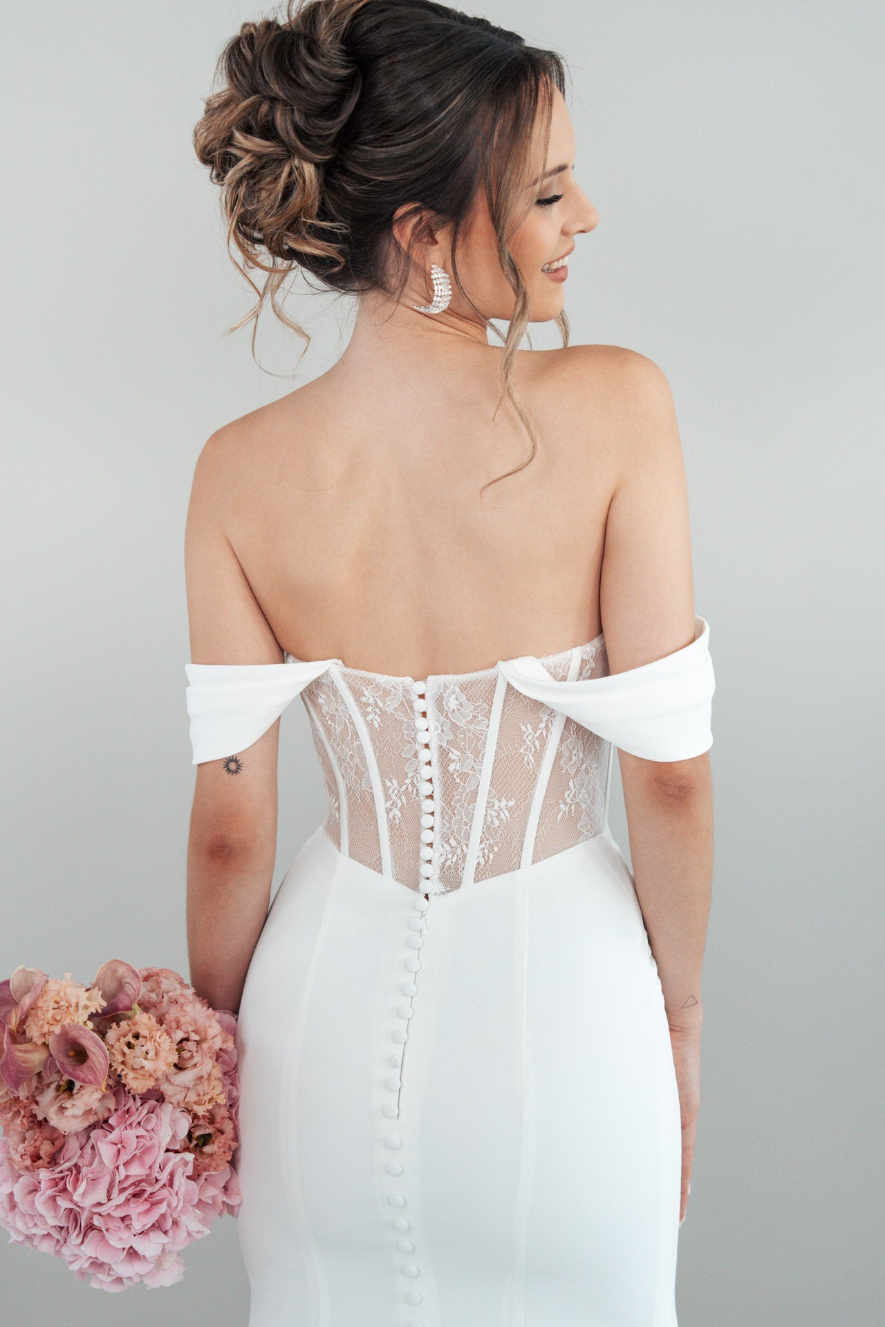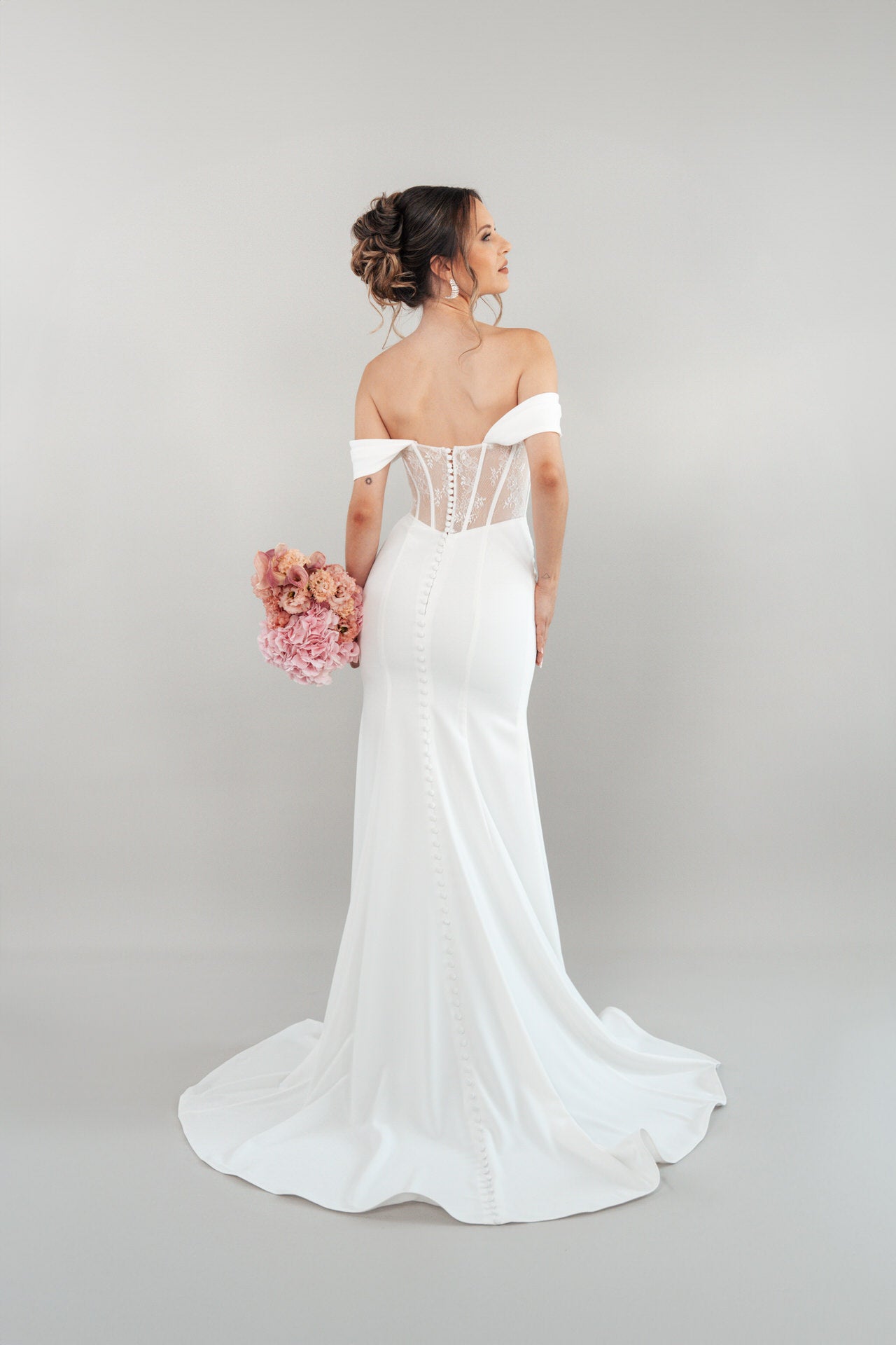 Der Rücken des Kleides, gerade geschnitten, wird durch eine zarte Knopfleiste veredelt, die dem romantischen Design eine klassische Eleganz hinzufügt. Jedes Detail des Bridonista S26-F08 ist darauf ausgelegt, deine Persönlichkeit mit purer Anmut zu unterstreichen. Der glatte Crepe-Stoff schimmert sanft im Licht, während die Chantilly-Spitze deine Silhouette wie ein zarter Schleier umspielt und dem Kleid eine zeitlose, elegante Ausstrahlung verleiht.
