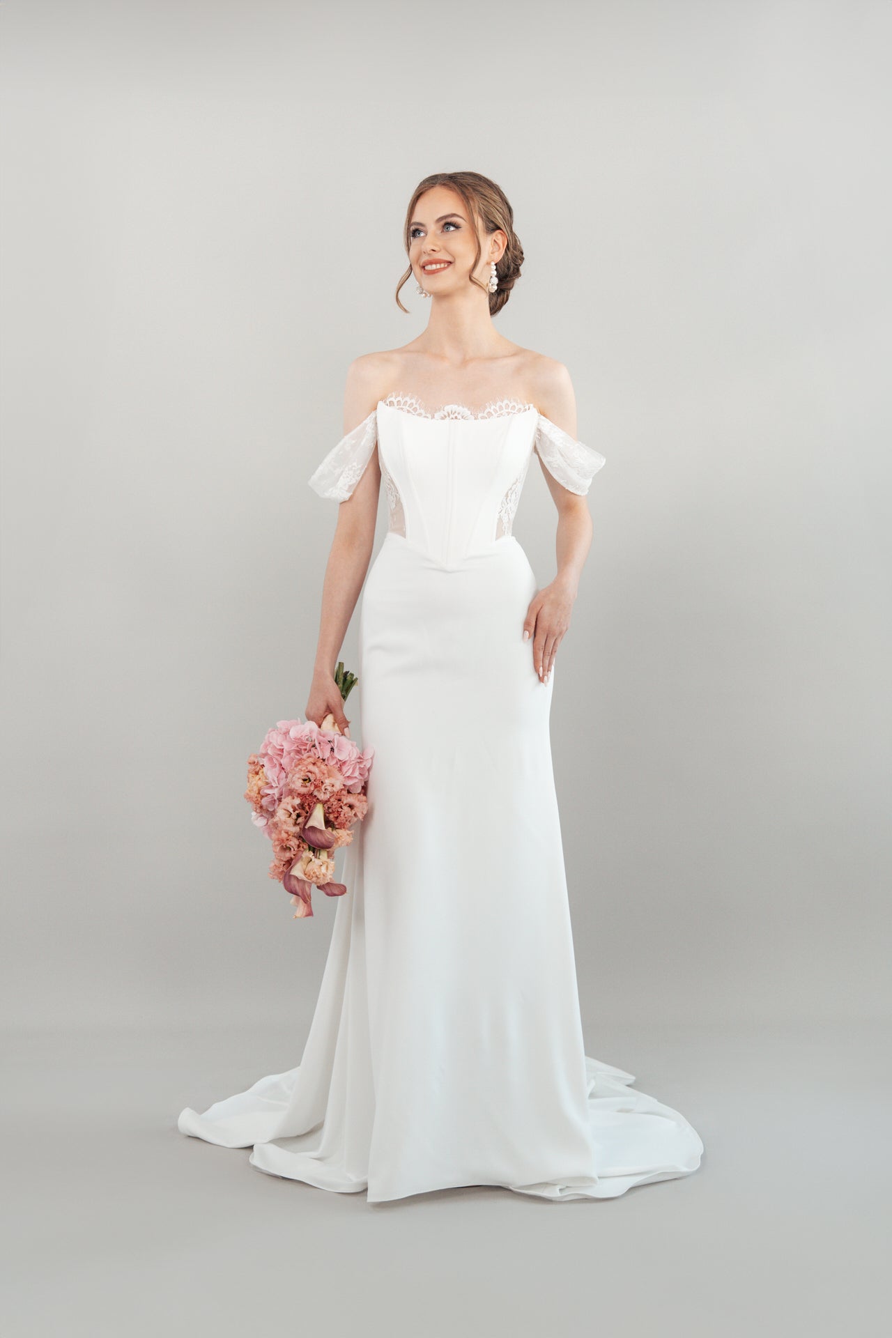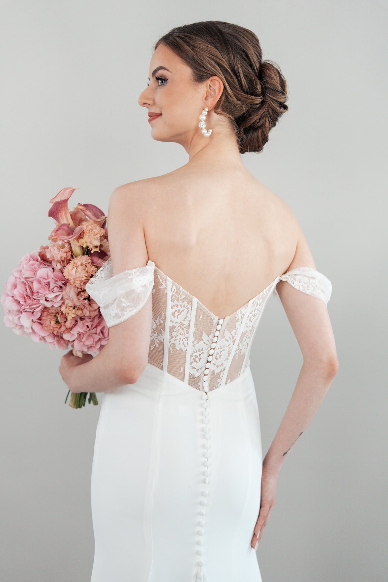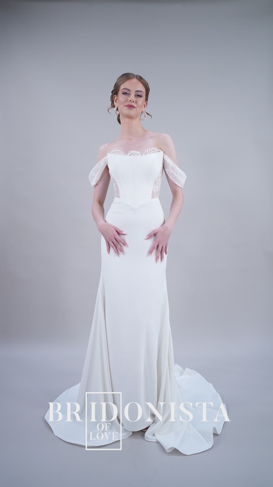 Der Rücken des Kleides, mit einem tiefen V-Ausschnitt, ist ein wahres Highlight: Der Tattoo-Effekt aus zarter Spitze kombiniert mit einer eleganten Knopfleiste verleiht dem romantischen Design eine kunstvolle Tiefe. Der glatte Crepe-Rock, luftig und geschmeidig, fällt in sanften Wellen und mündet in eine mittellange Schleppe, die deinem Auftritt eine anmutige Dramatik verleiht, ohne dich einzuschränken. Jedes Detail des Bridonista S26-F09 ist darauf ausgelegt, deine Persönlichkeit mit purer Eleganz zu unterstreichen. Der glatte Crepe-Stoff schimmert sanft im Licht, während die Chantilly-Spitze deine Silhouette wie ein zarter Schleier umspielt und dem Kleid eine zeitlose, romantische Ausstrahlung verleiht.