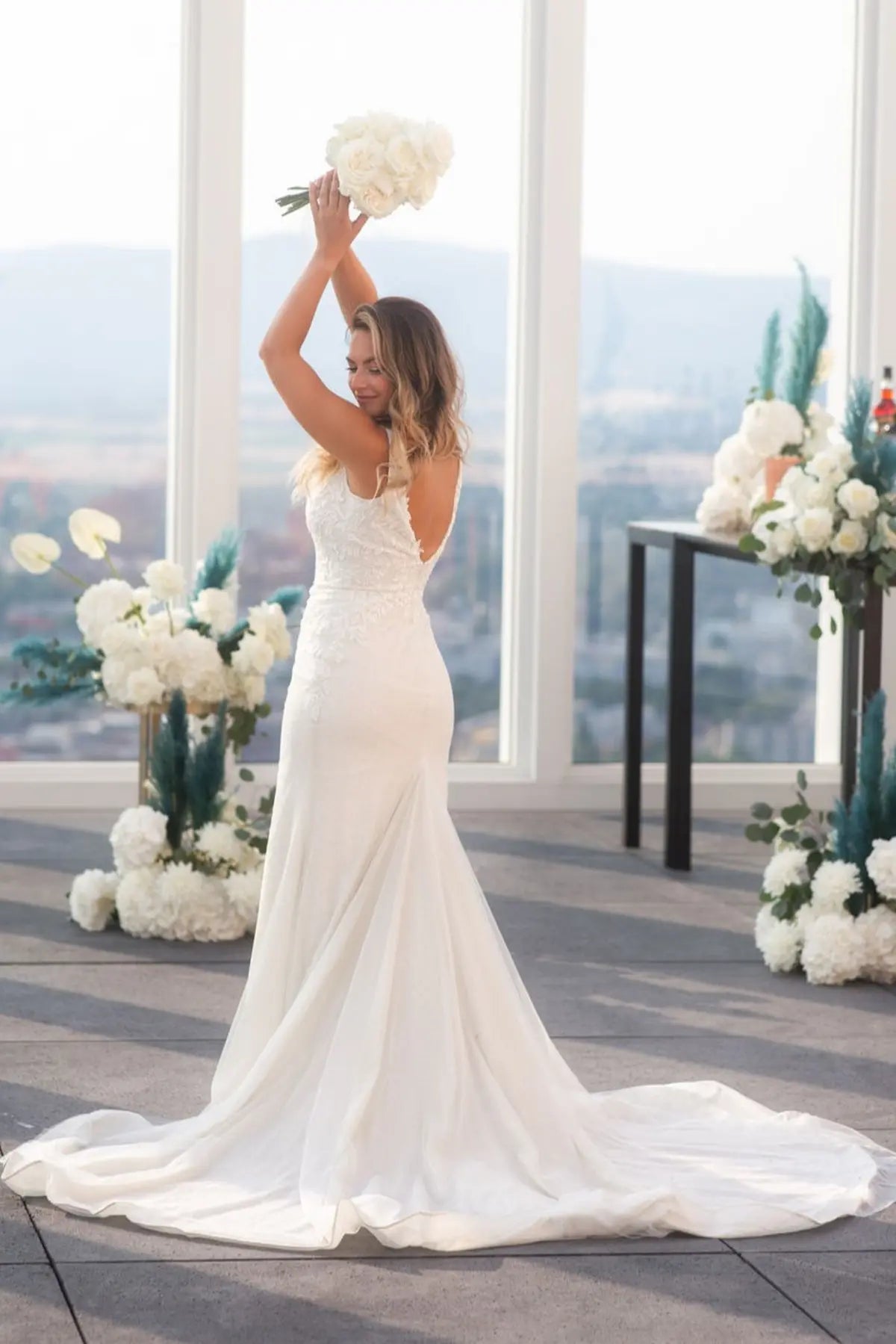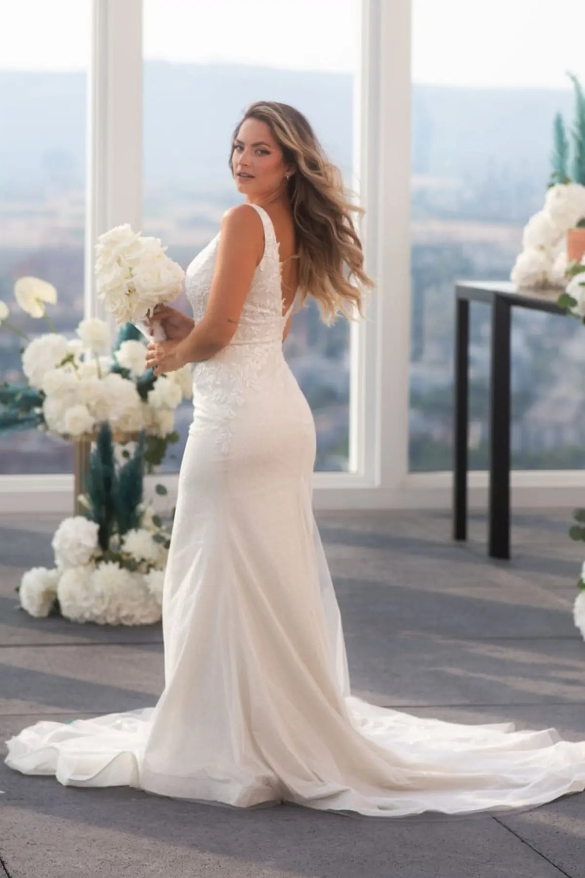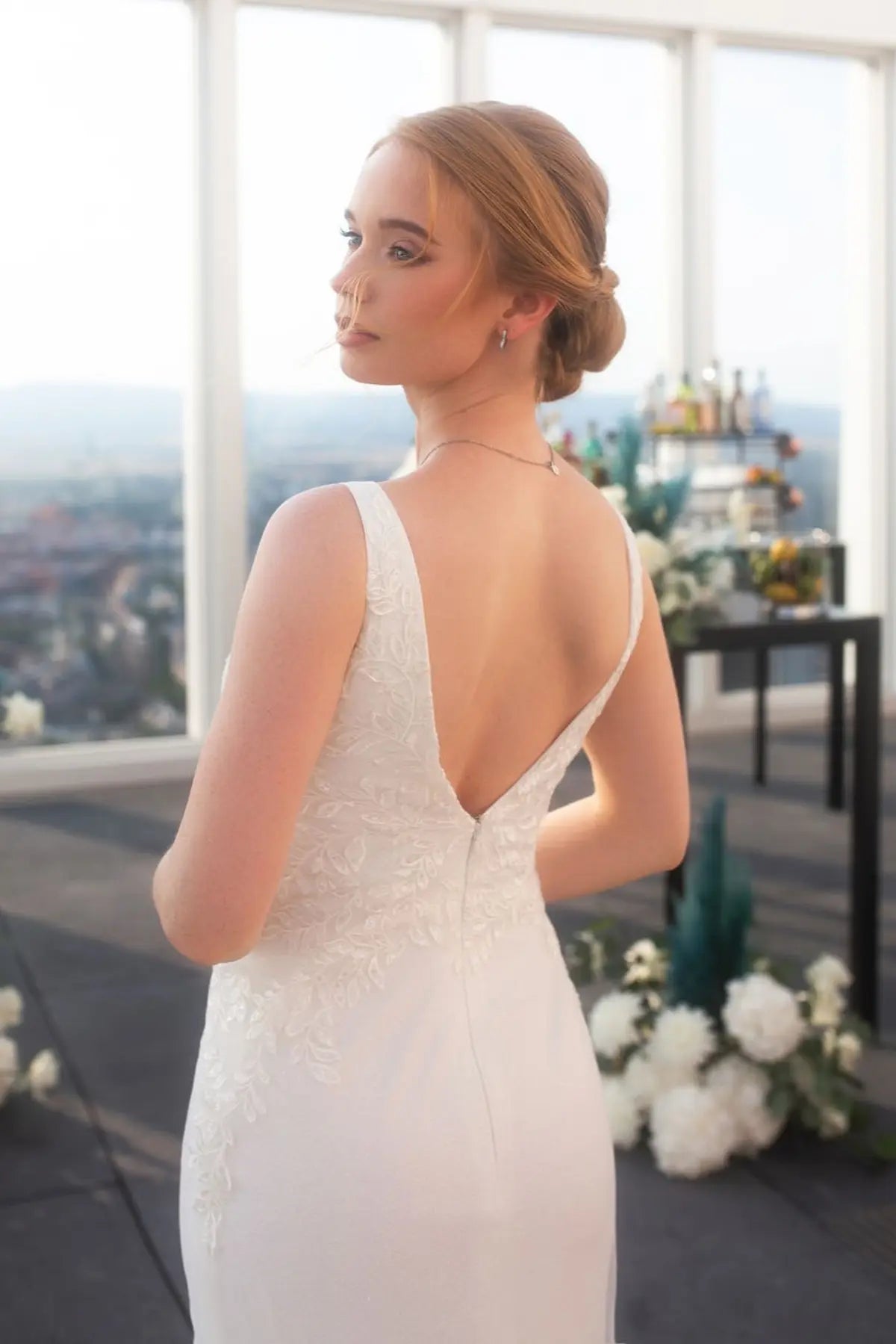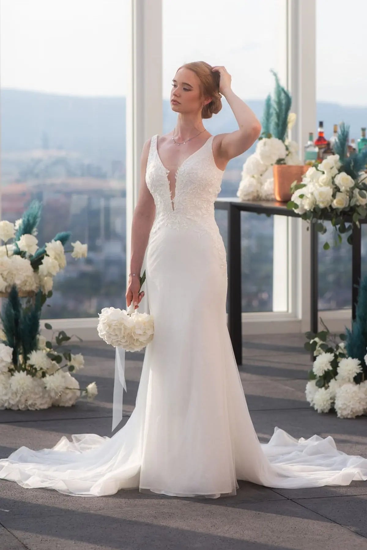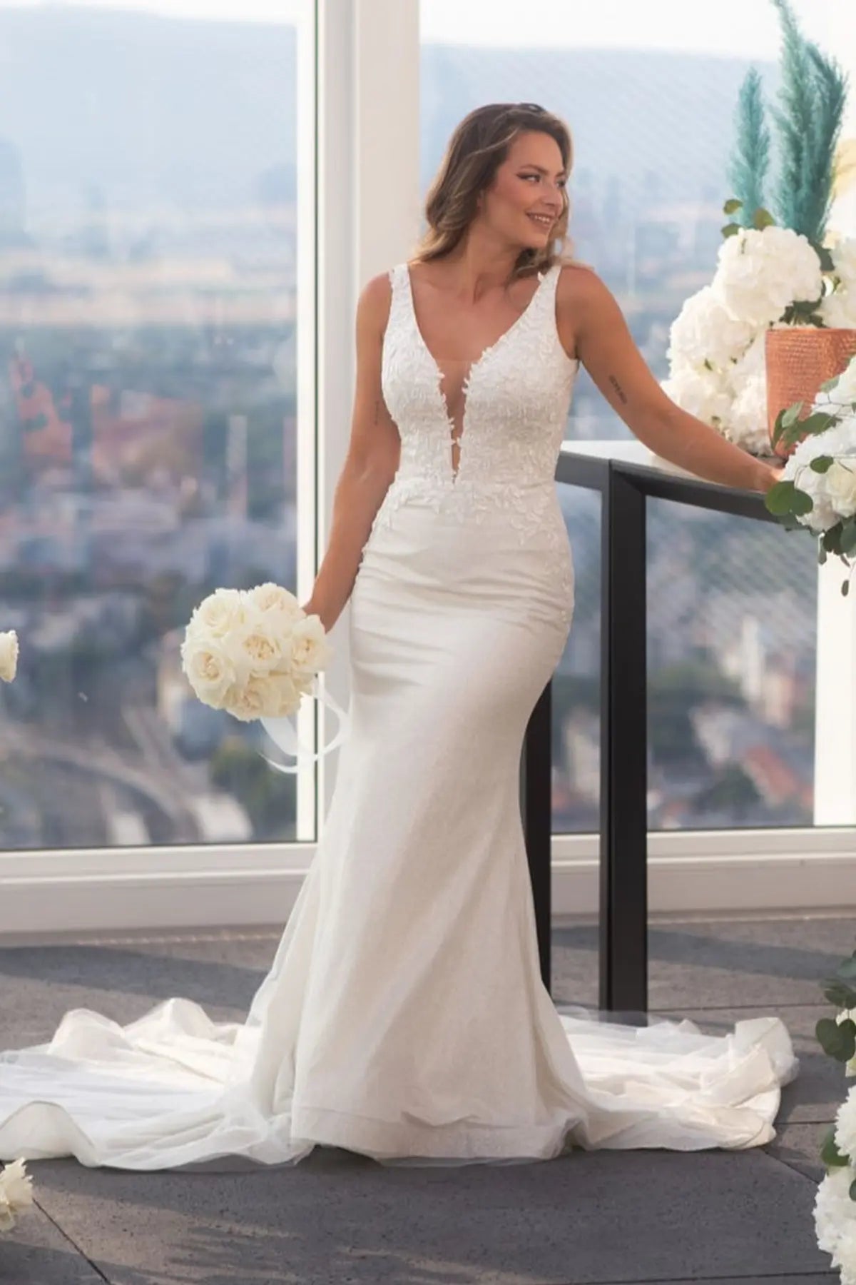 Sorge mit dem Bridonista Spark24-02 Hochzeitskleid für ein Statement! Diese luxuriöse, glitzernde Kreation kombiniert einen modernen V-Ausschnitt mit einer mittellangen Schleppe, einem Material aus Spitze, glamourösen Fit-and-Flare-Ausschnitten und einem Hauch von Frechheit aus der Sparkly Collection. Mach es glamourös und sei unvergesslich!