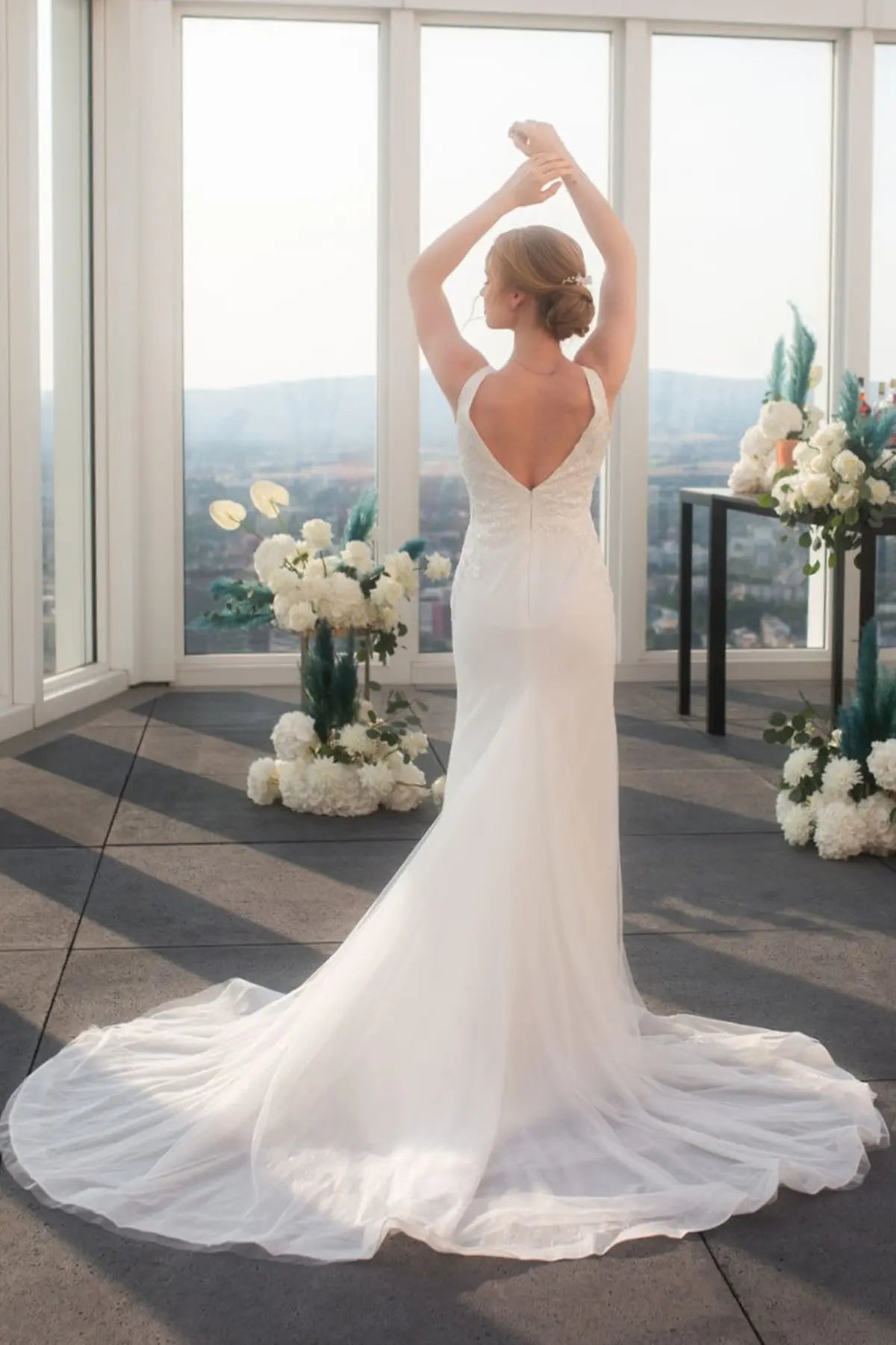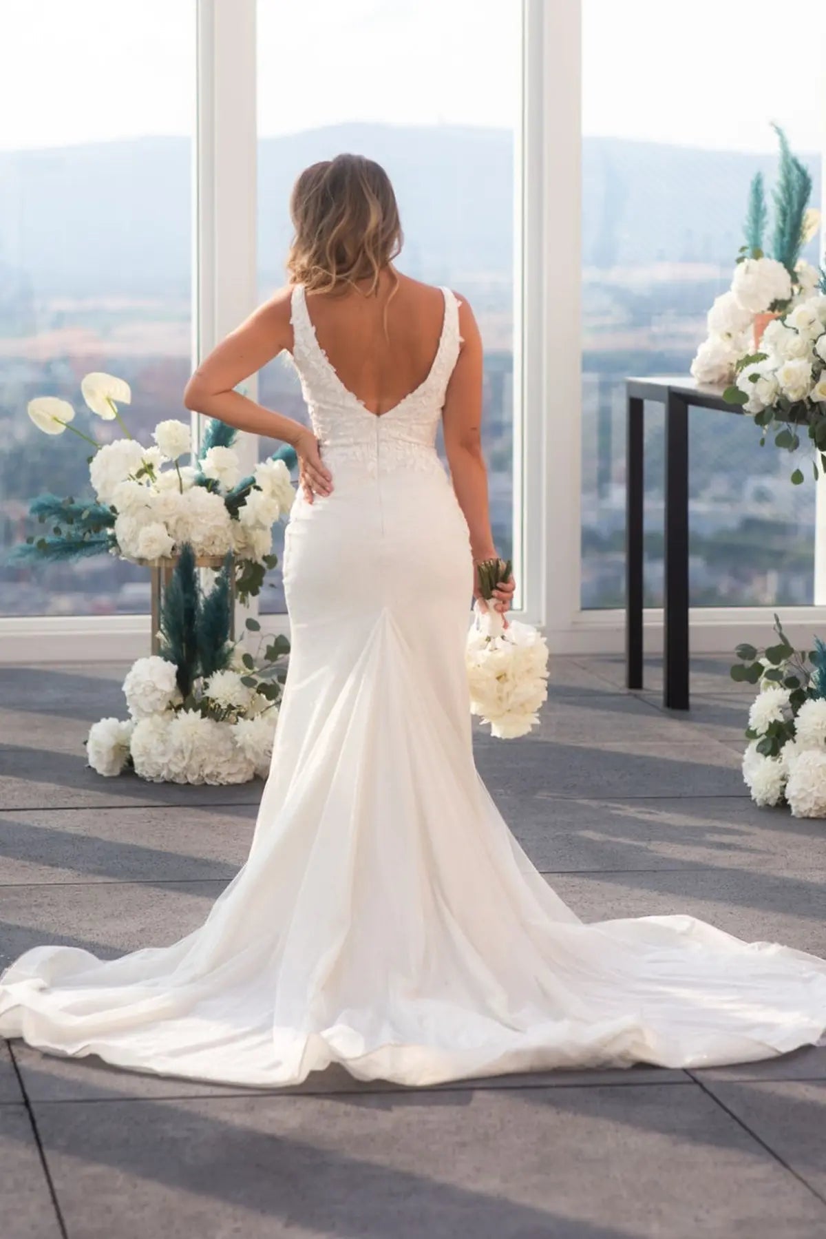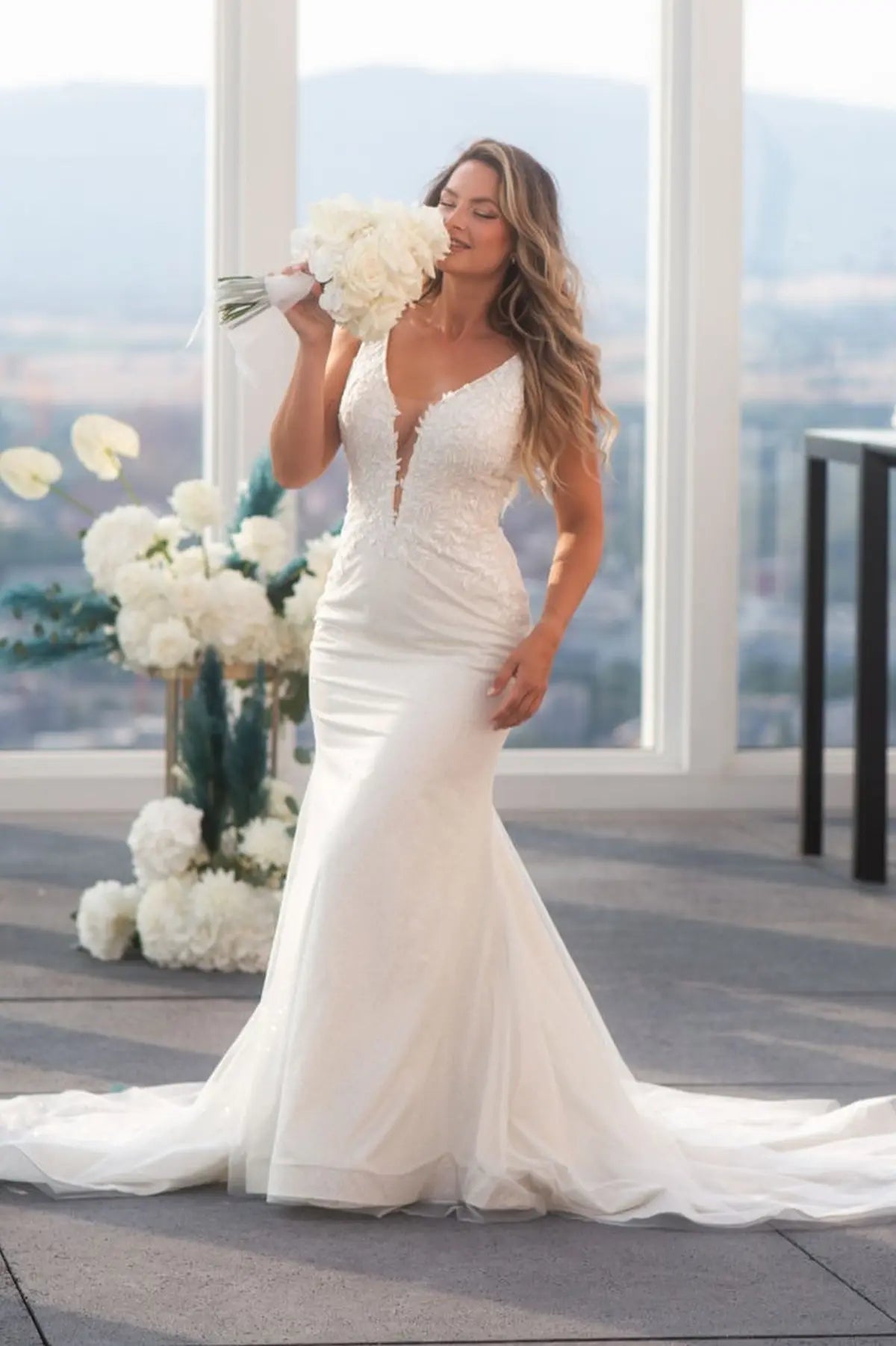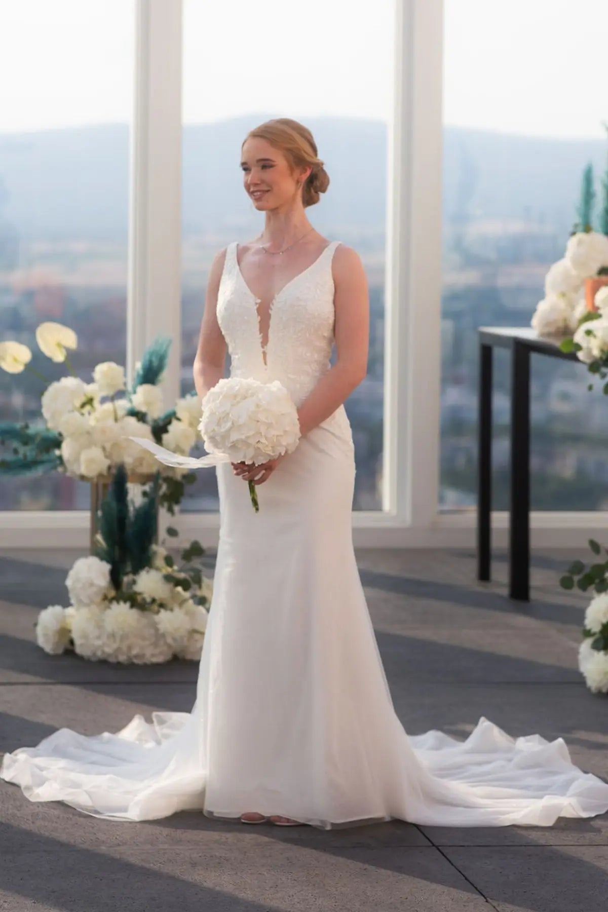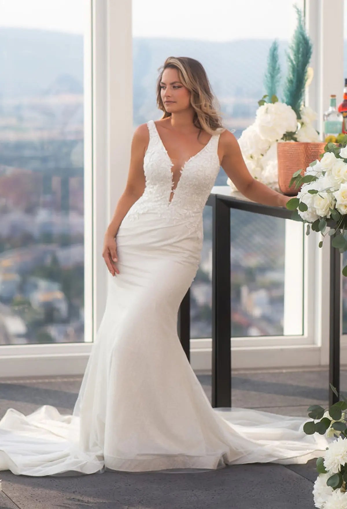 Sorge mit dem Bridonista Spark24-02 Hochzeitskleid für ein Statement! Diese luxuriöse, glitzernde Kreation kombiniert einen modernen V-Ausschnitt mit einer mittellangen Schleppe, einem Material aus Spitze, glamourösen Fit-and-Flare-Ausschnitten und einem Hauch von Frechheit aus der Sparkly Collection. Mach es glamourös und sei unvergesslich!