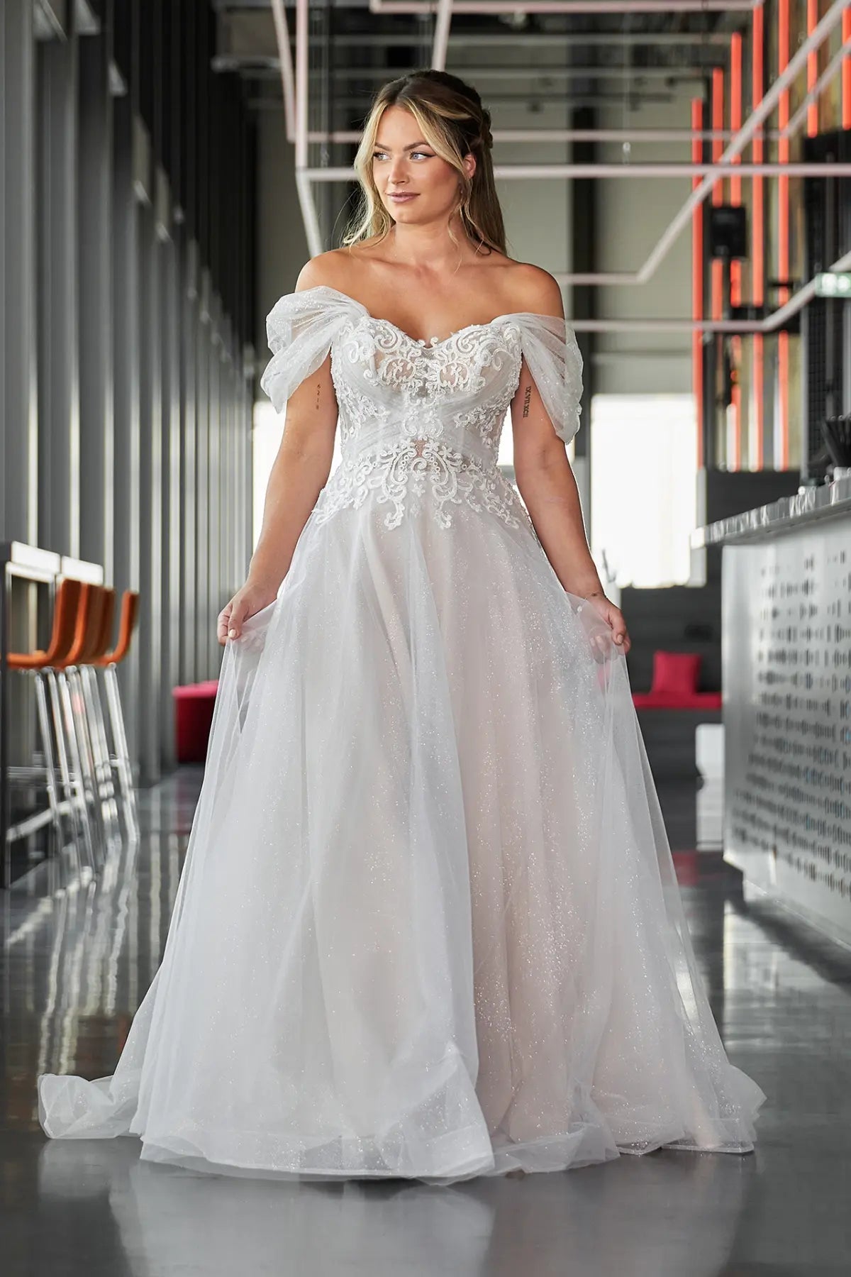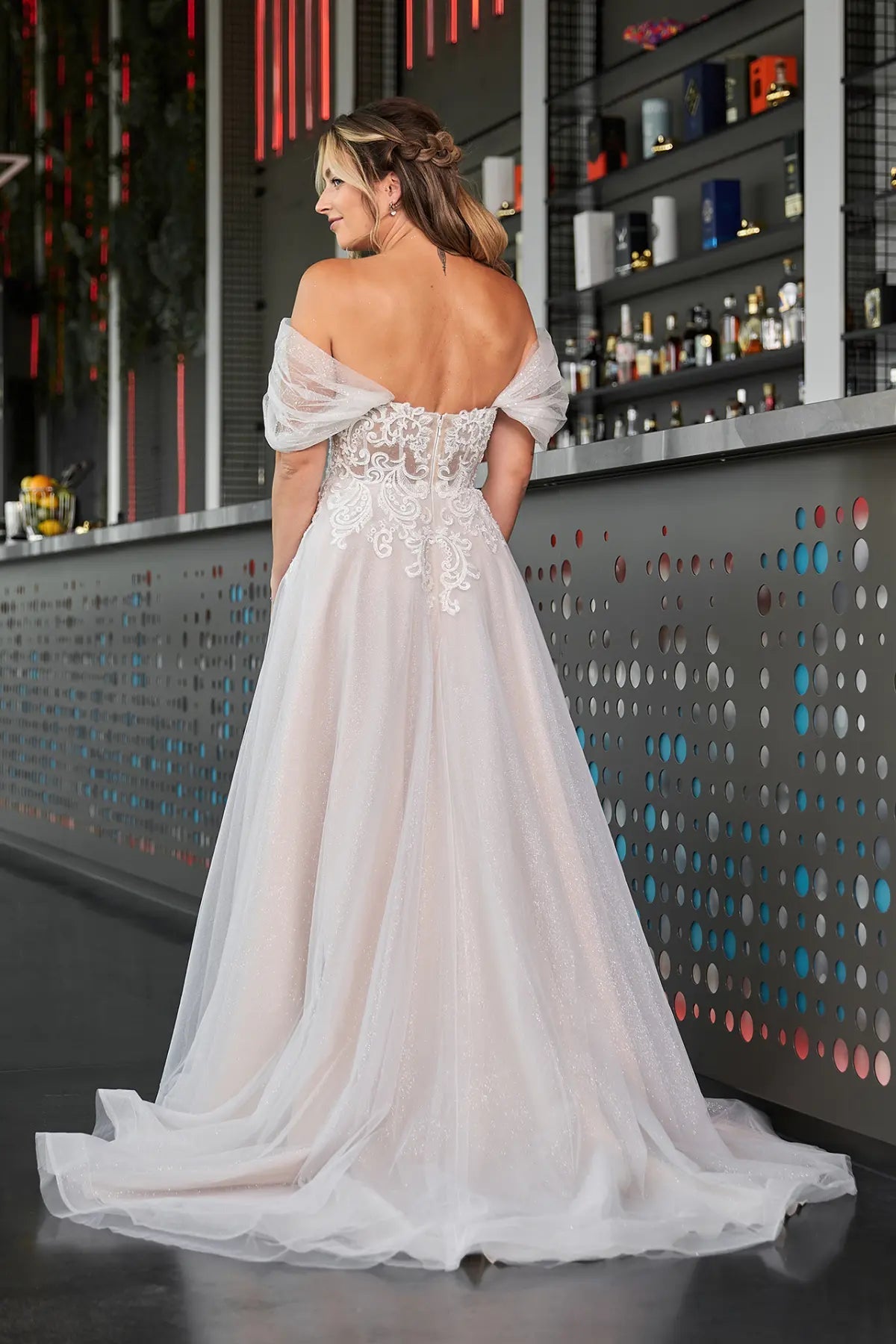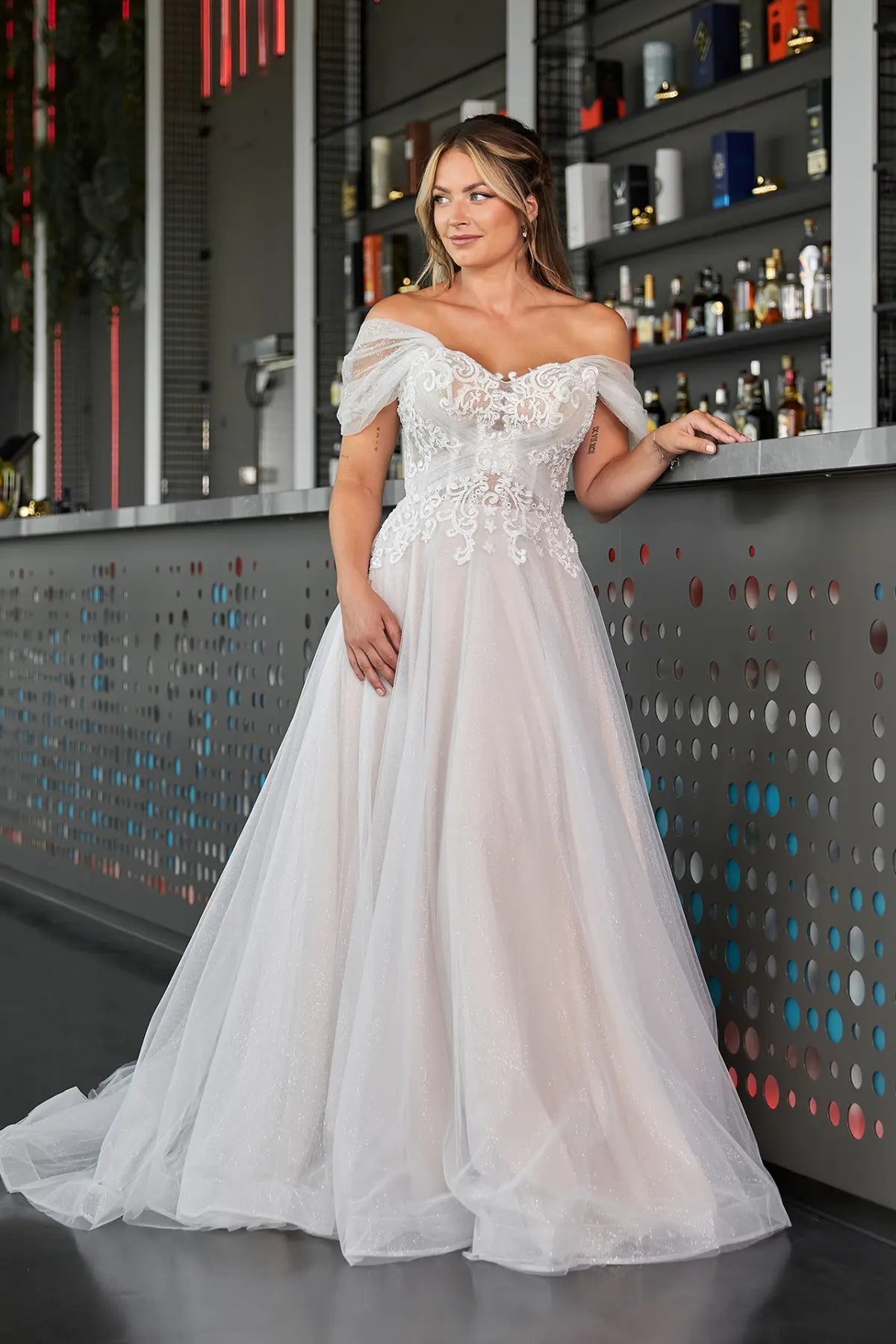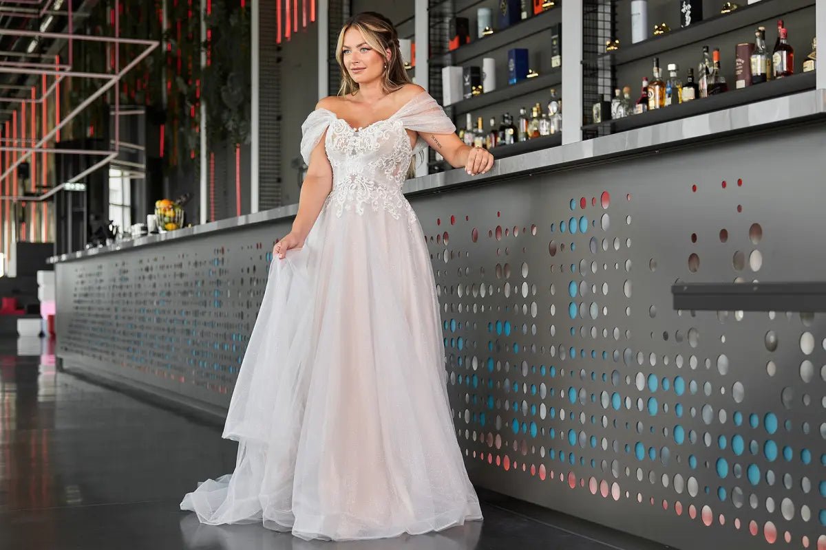 Sorge für einen "funkelnden" Auftritt im Bridonista Spark24-04! Dieses glamouröse Hochzeitskleid ist mit seinem Herzchen-Ausschnitt, dem funkelnden Material, der kurzen Schleppe und der schulterfreien Spitze wie für eine Prinzessin gemacht. Die A-Linie und das von Aschenputtel inspirierte Design sorgen für einen wahrhaft magischen Auftritt in der Sparkle Collection!