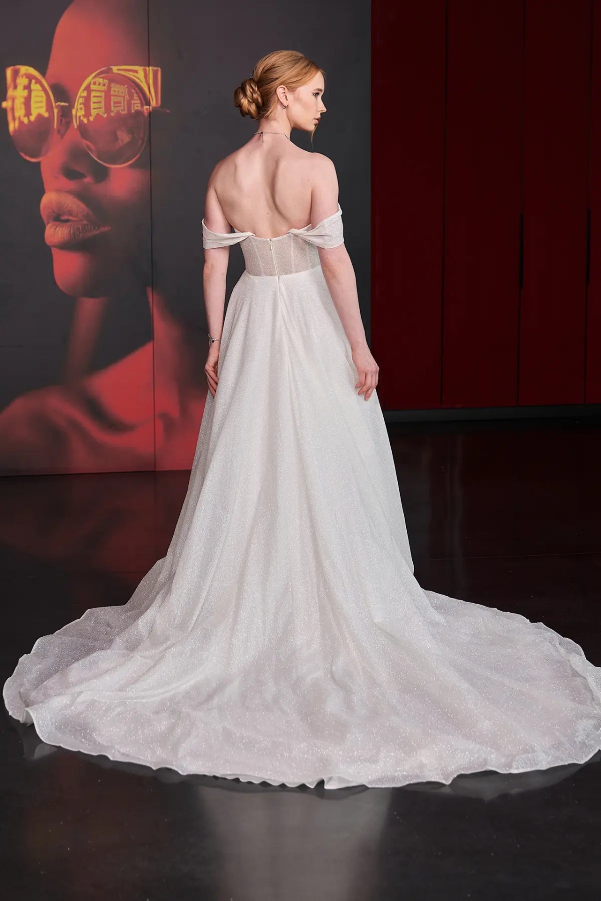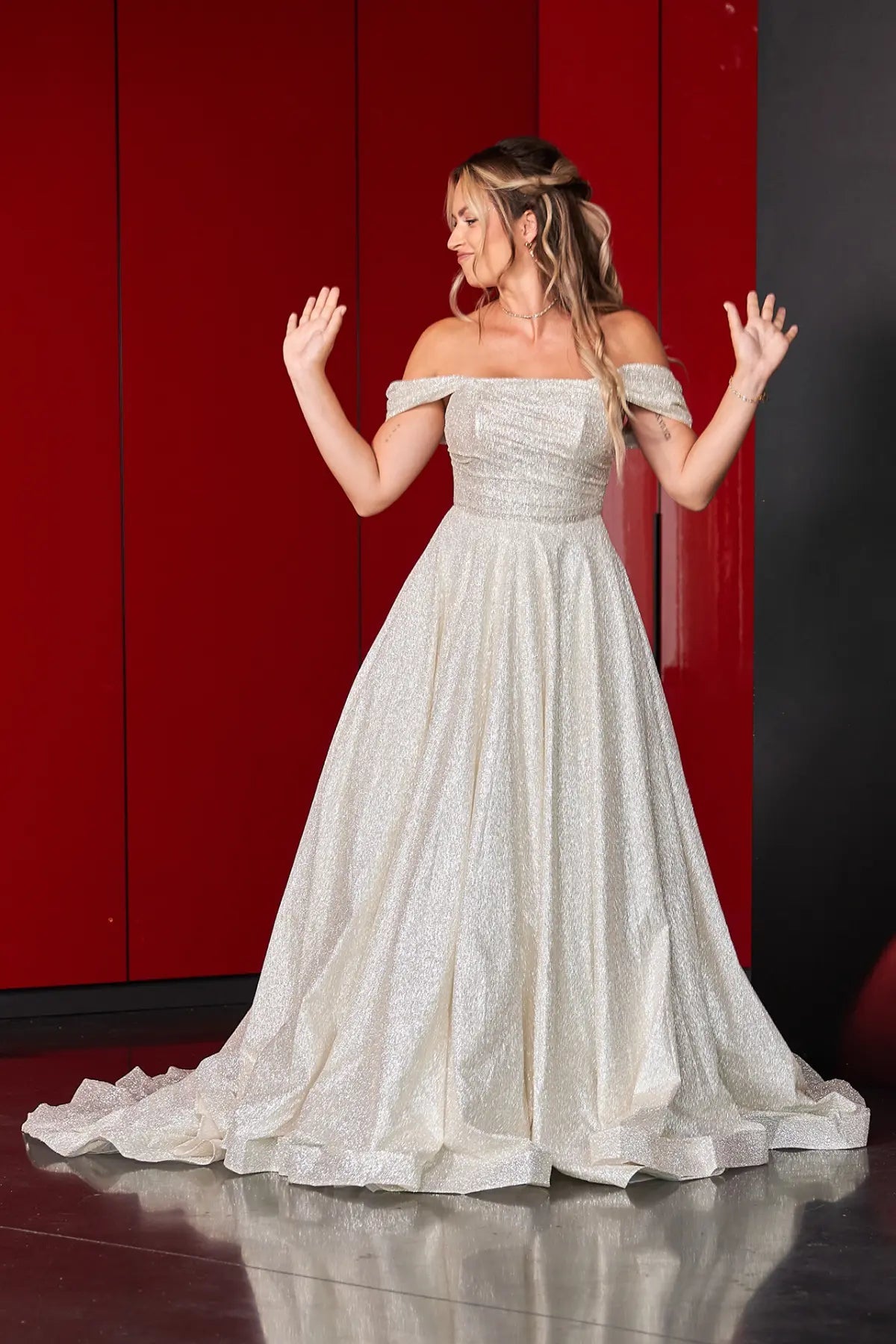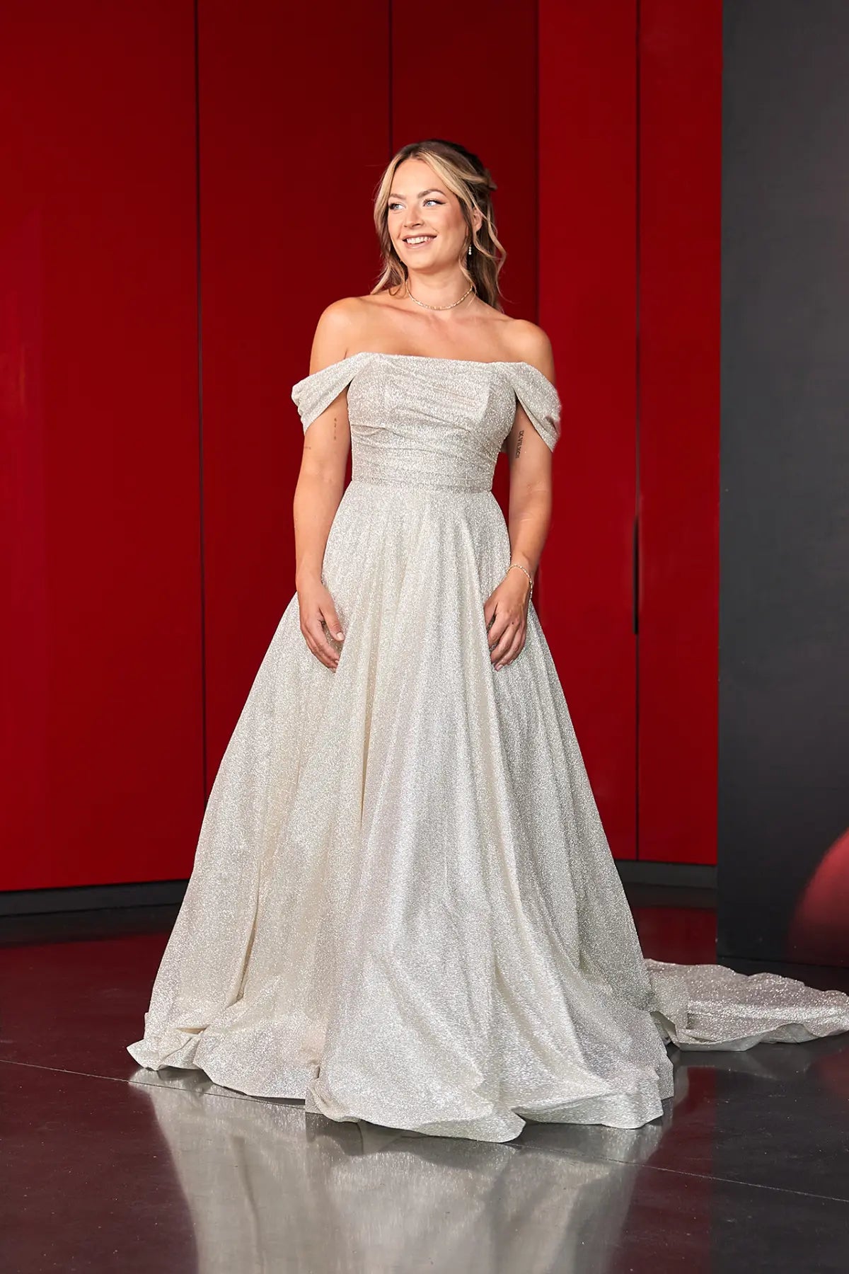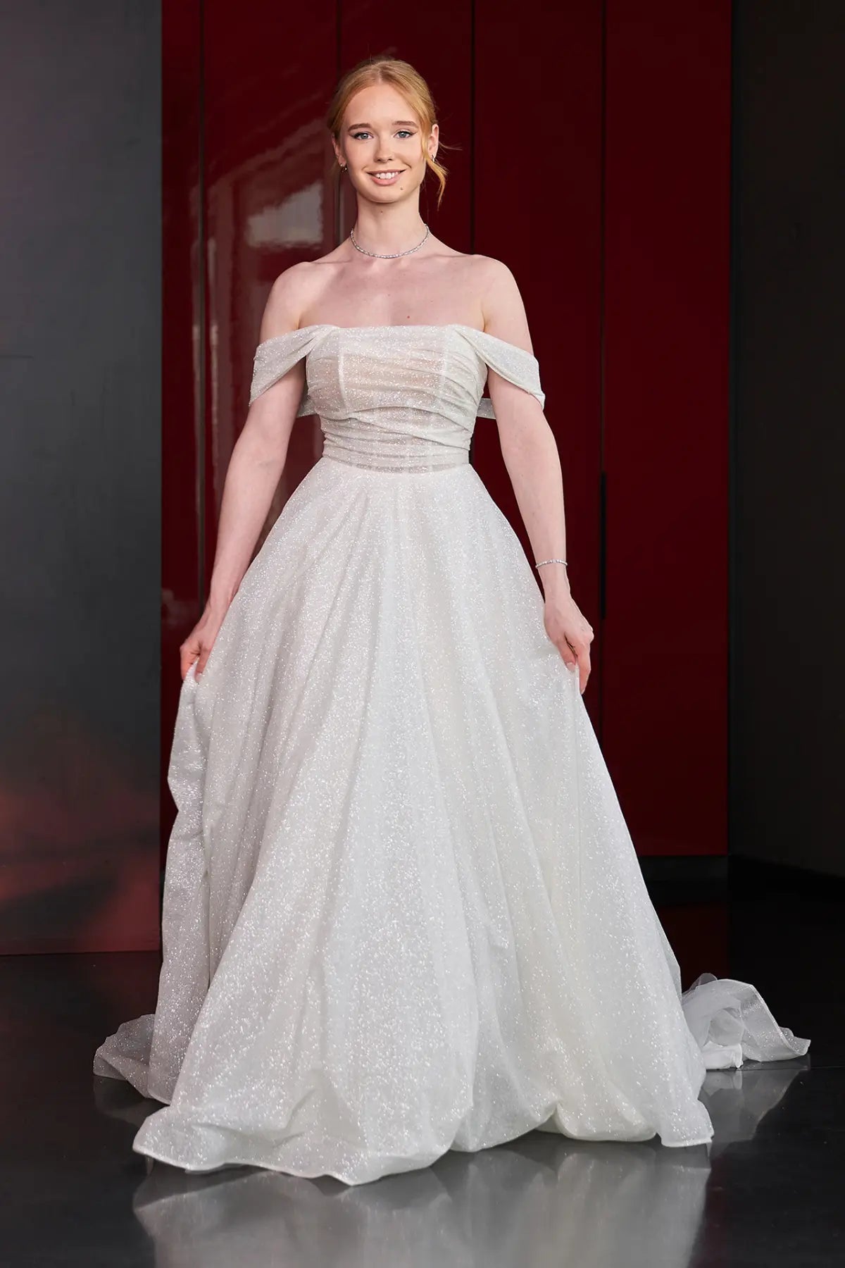Mit dem Bridonista Spark24-05 bist du die Schöne des Balls! Dieses elegante und glamouröse Hochzeitskleid hat einen geraden Ausschnitt, Rüschen an der Corsage und schulterfreie, abnehmbare Träger - so hast du viele Stylingmöglichkeiten. Aber der eigentliche Star ist das glitzernde Oberteil mit einer langen Schleppe und jeder Menge Cinderella-Pep! Wenn du einen modernen Look mit zeitloser Anmut suchst, ist die Spark24-05 die richtige A-Linie für dich. Glänze weiter!