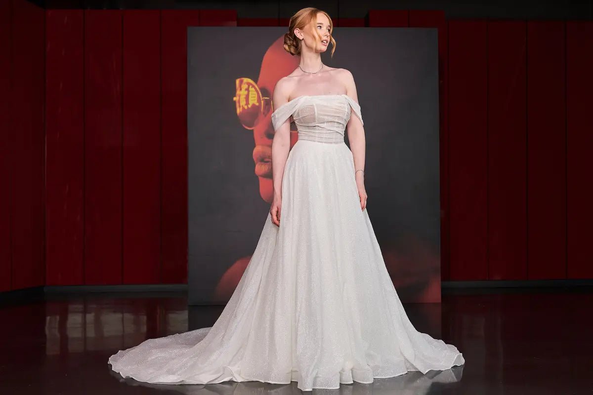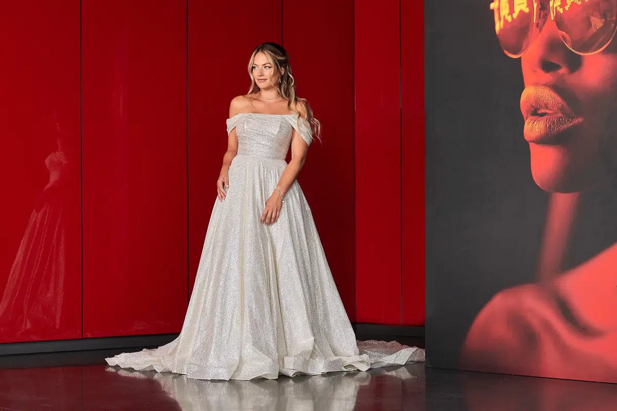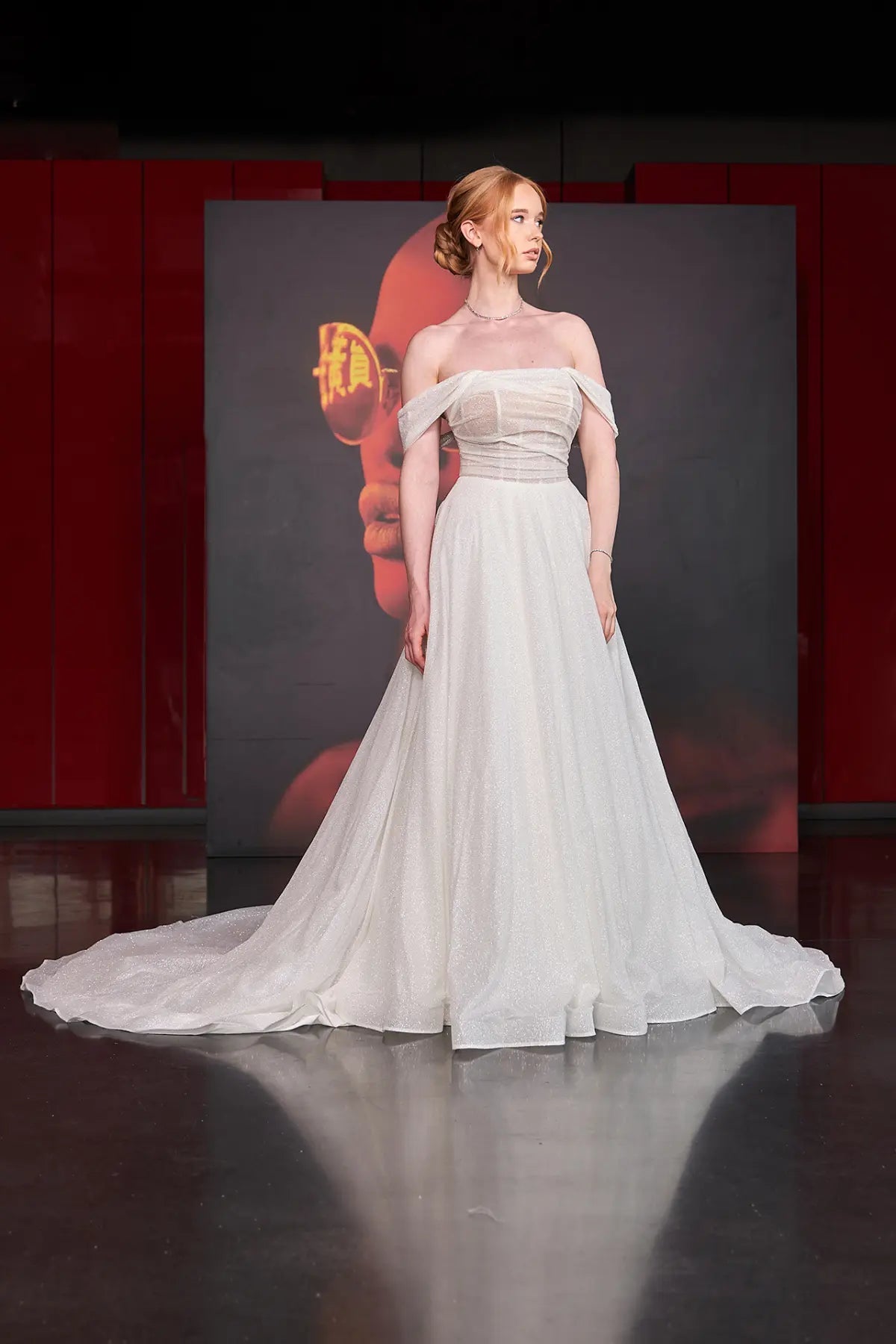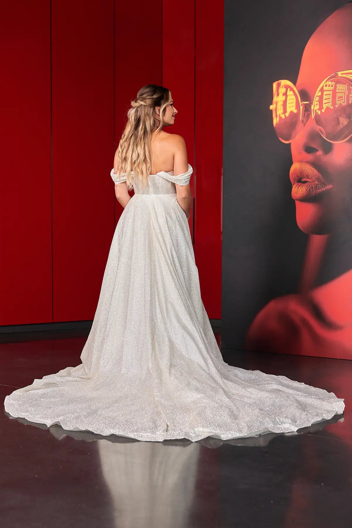 Mit dem Bridonista Spark24-05 bist du die Schöne des Balls! Dieses elegante und glamouröse Hochzeitskleid hat einen geraden Ausschnitt, Rüschen an der Corsage und schulterfreie, abnehmbare Träger - so hast du viele Stylingmöglichkeiten. Aber der eigentliche Star ist das glitzernde Oberteil mit einer langen Schleppe und jeder Menge Cinderella-Pep! Wenn du einen modernen Look mit zeitloser Anmut suchst, ist die Spark24-05 die richtige A-Linie für dich. Glänze weiter!