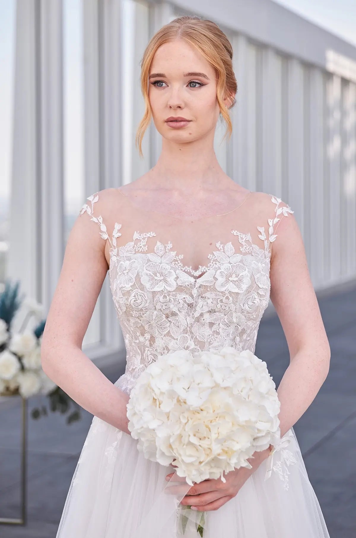 Corsage: Elfenbeinfarbene Spitze, elfenbeinfarbener Chantilly, elfenbeinfarbener Tüll; Tüll-Illusion im vorderen und hinteren Ausschnitt ist elfenbeinfarben; - Rock: Elfenbeinfarbener Tüll, elfenbeinfarbenes Futter. Dieses Modell wird nur mit elfenbeinfarbenen Materialien geschneidert.