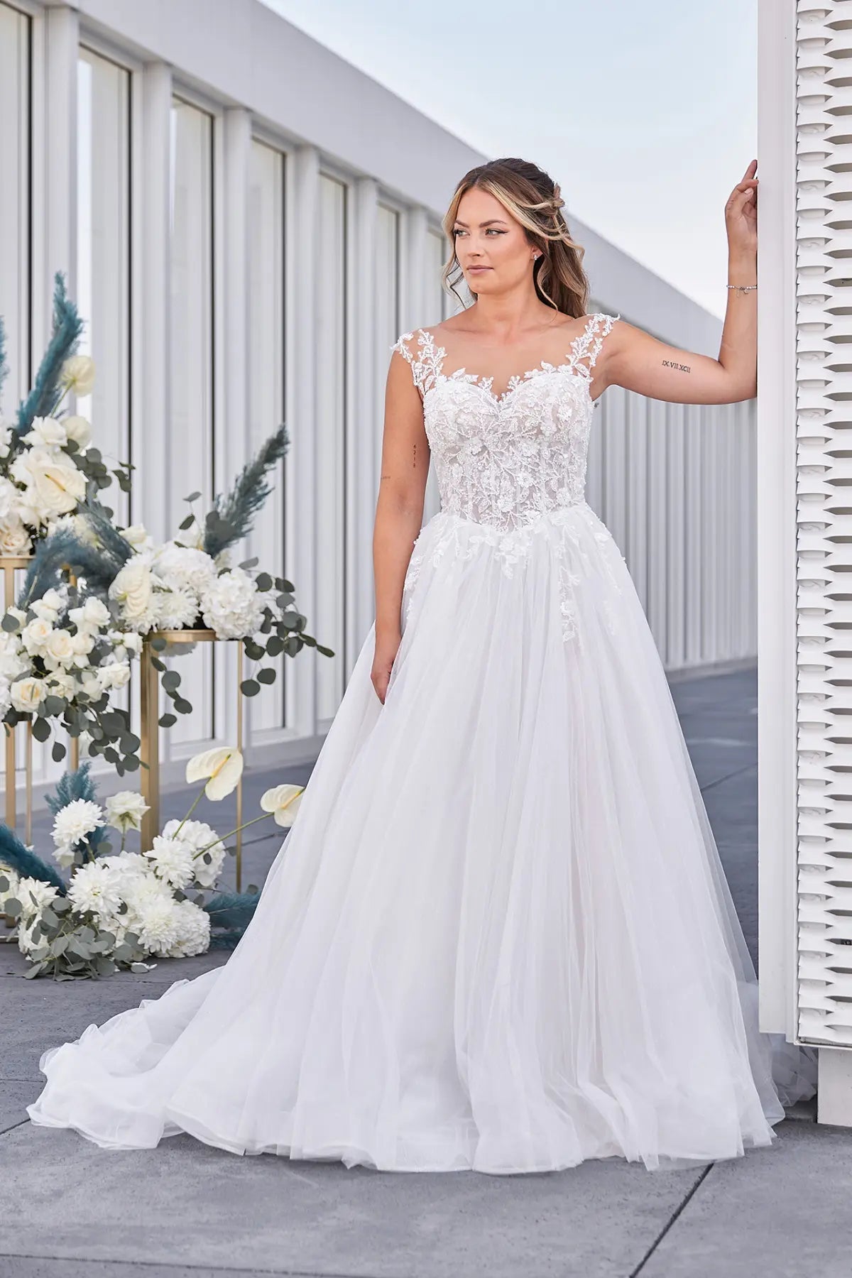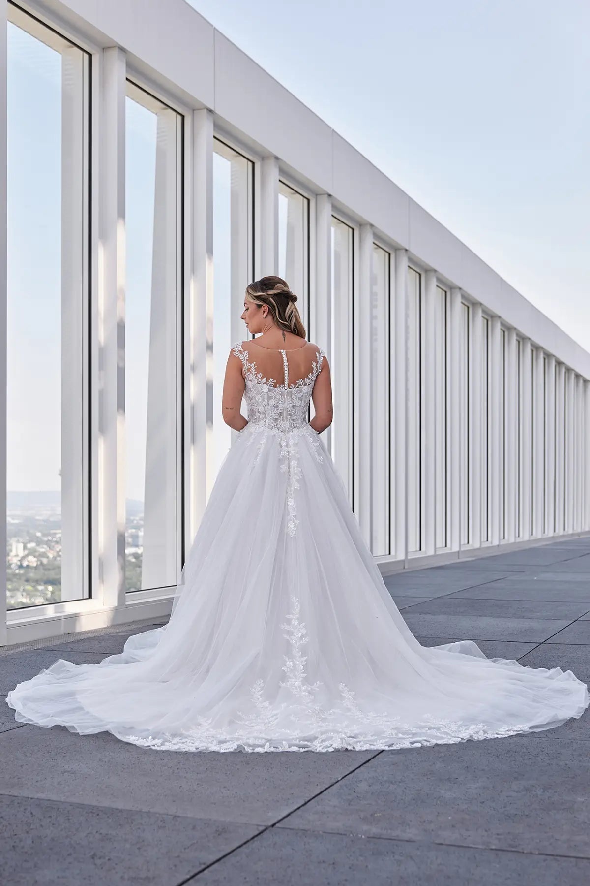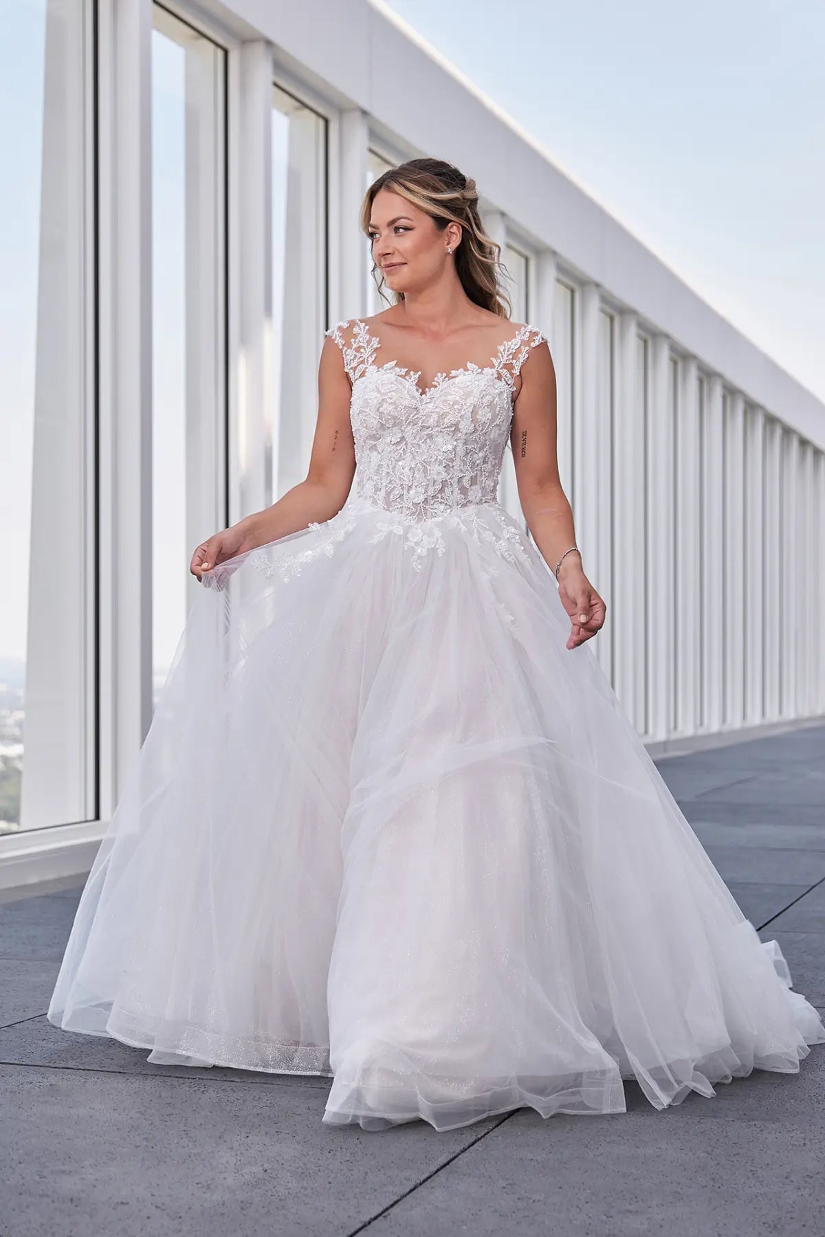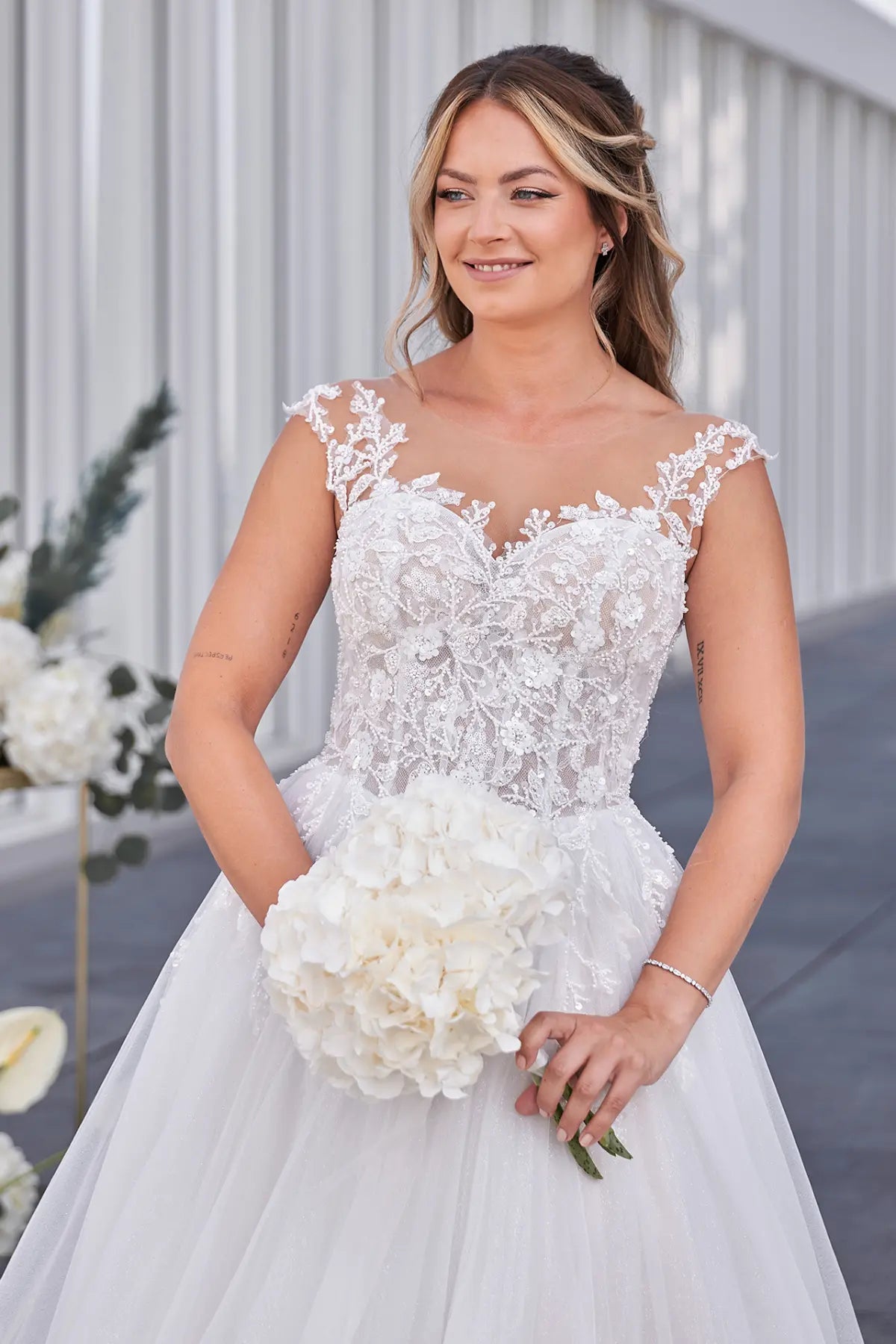Mit dem Bridonista Spark24-08 Hochzeitskleid ziehst du alle Blicke auf dich! Mit seiner modernen, verspielten Silhouette, der glamourösen 3D-Spitze und dem glitzernden Material wird dich dieses klassische Brautkleid mit Carmen-Ausschnitt wie eine echte Cindarella aussehen lassen (mit einer langen Schleppe!). Tattoo-Spitze, eine V-Corsage, Knopfleisten und die Sparkle Collection sorgen für ein königliches Vergnügen für jede zukünftige Braut. Du wirst dich im Handumdrehen wie eine Prinzessin fühlen!