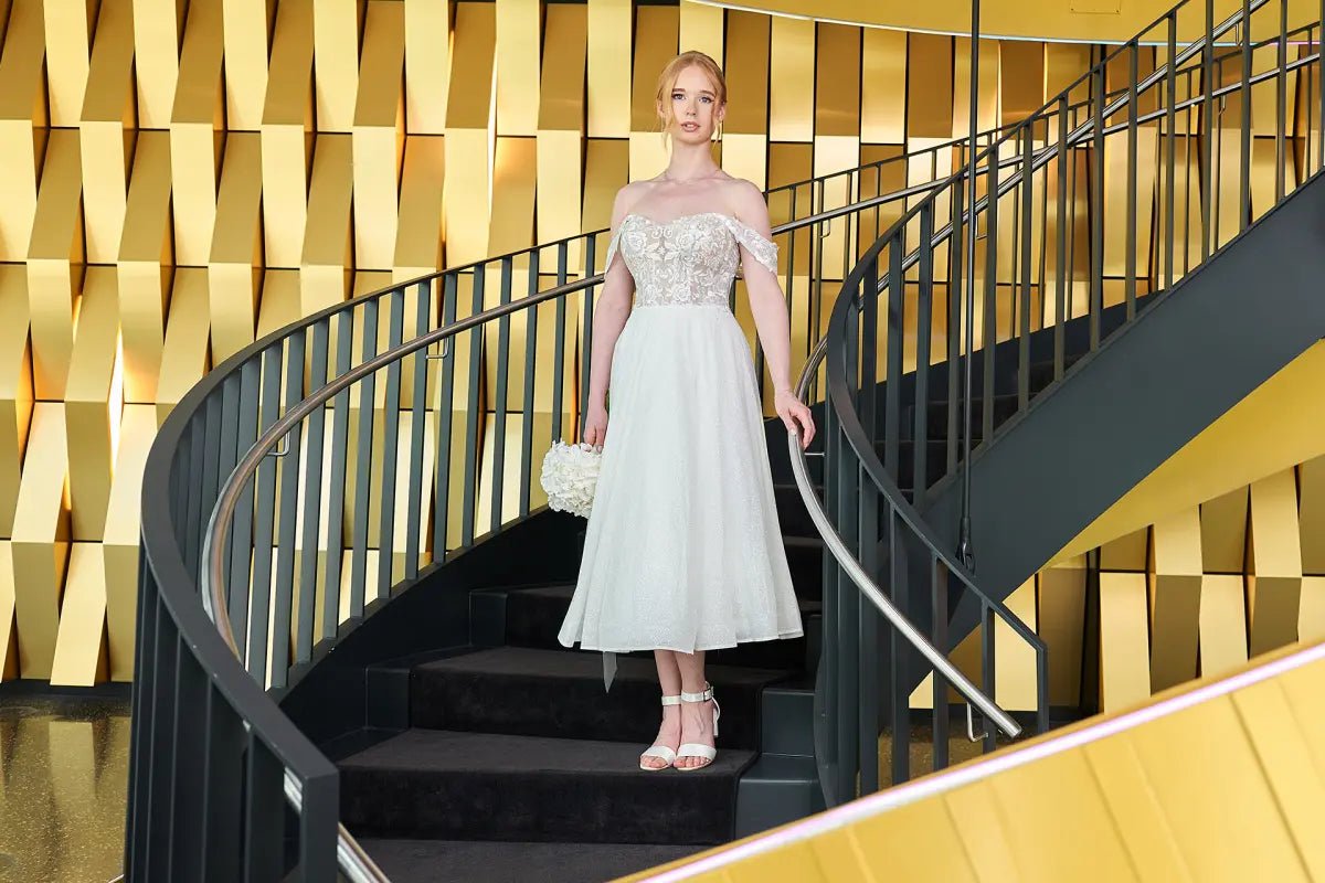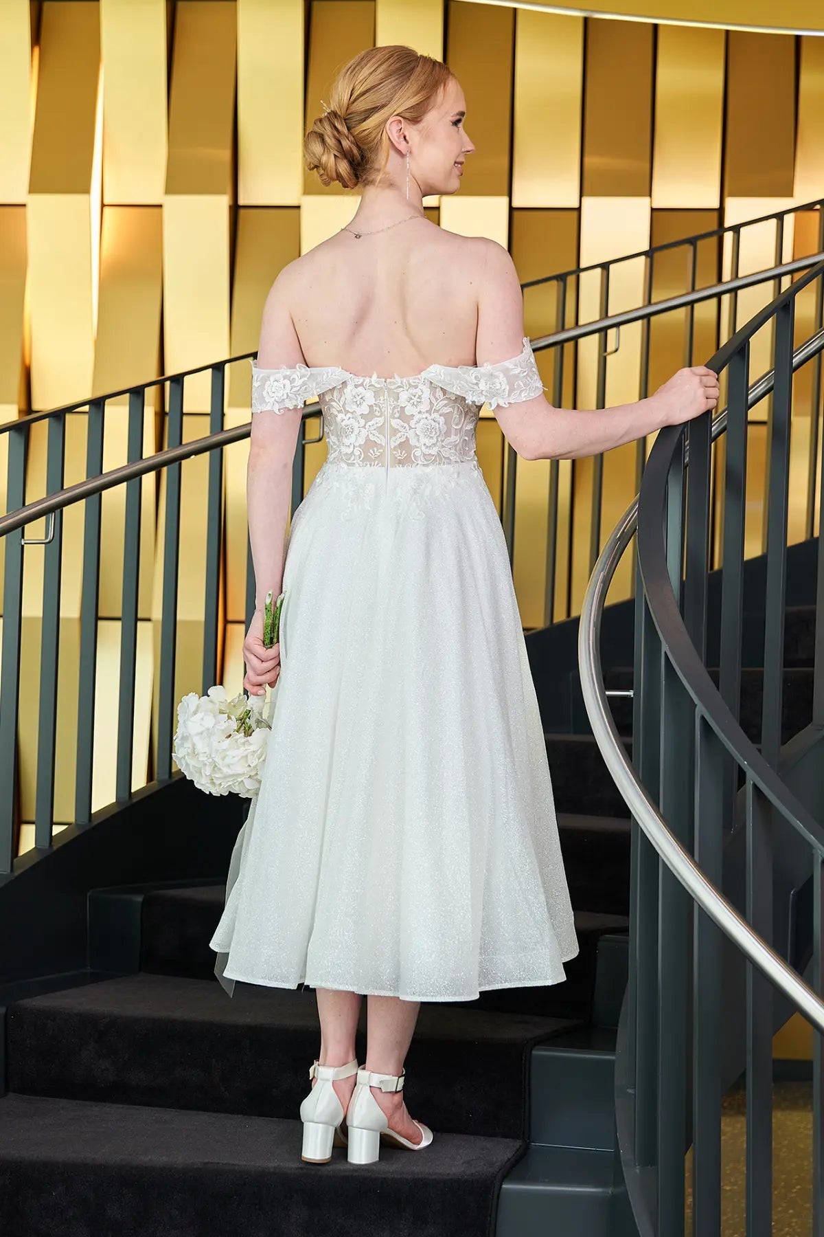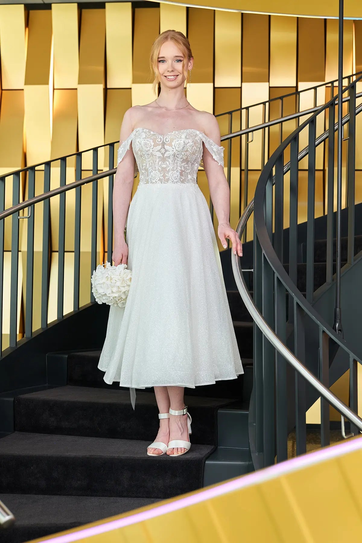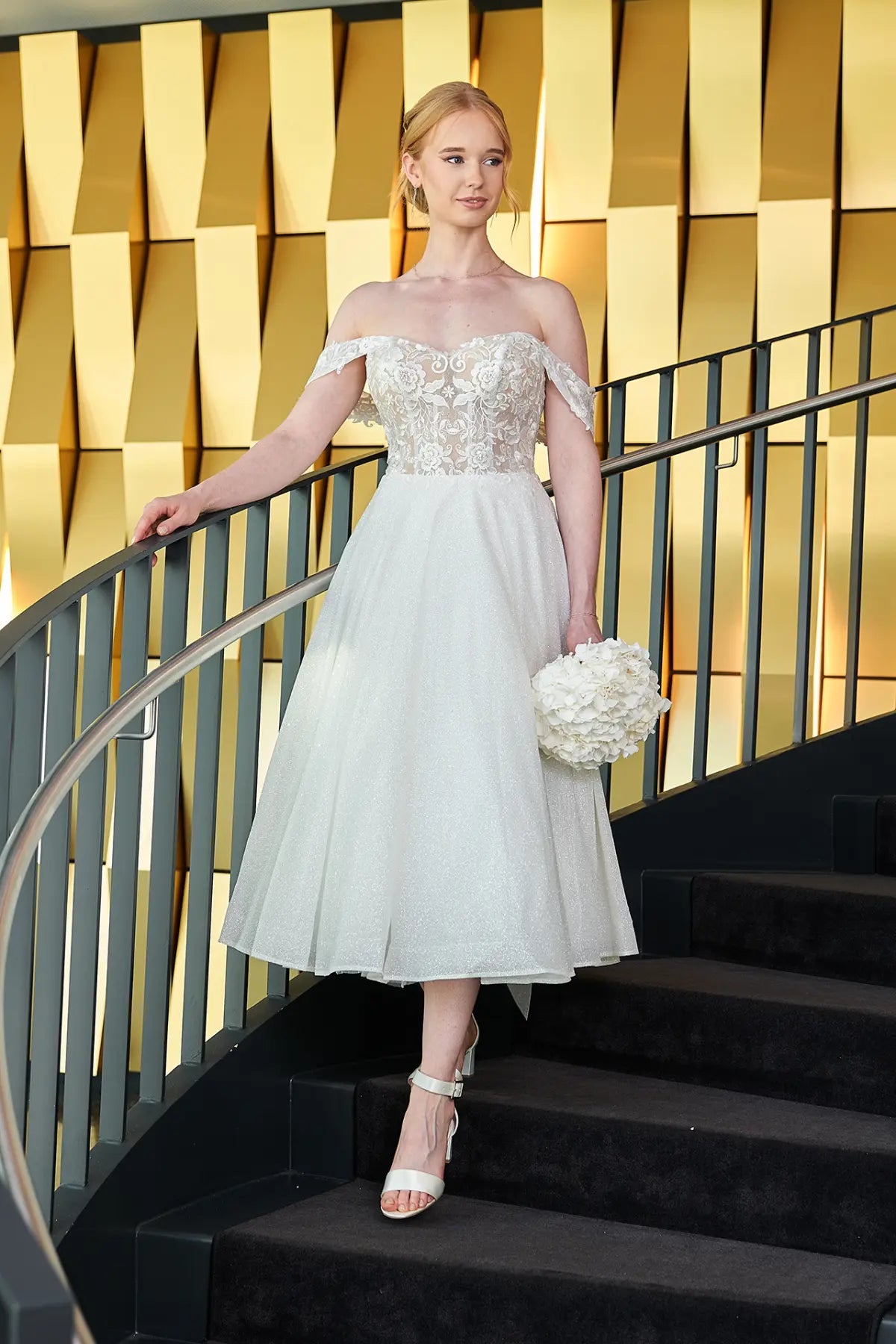 Lass die Romantik strahlen mit dem Bridonista Spark24-12! Egal, ob du im Standesamt oder auf dem Ball heiratest, dieses Kleid hat einfach alles: Herzchen-Ausschnitt, abnehmbare Träger, A-Linienschnitt - und natürlich funkelt, funkelt, funkelt*! Außerdem eignet es sich perfekt für alle Anlässe; der kleine Mantel (und ein bisschen *Zauber*!) verwandelt es im Handumdrehen von einem Hochzeitskleid in ein Partykleid.
