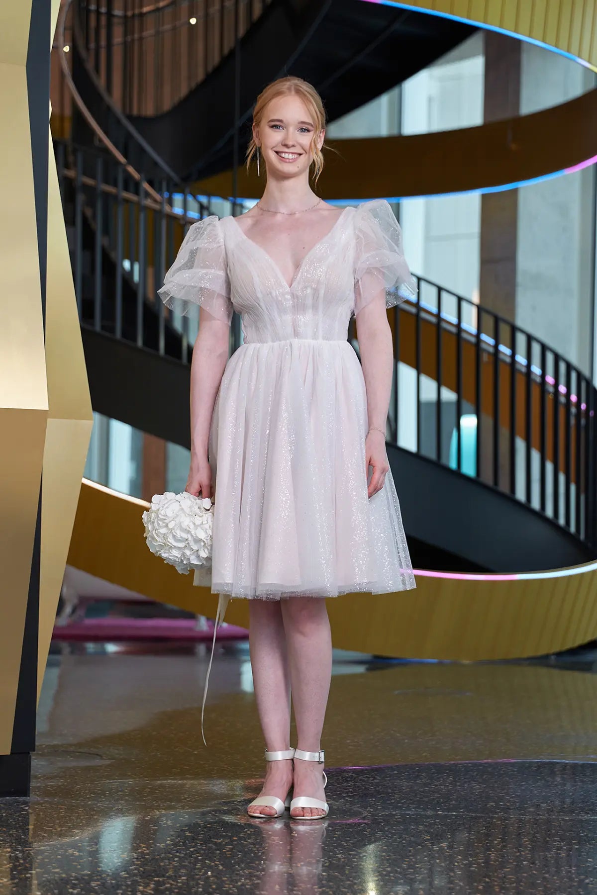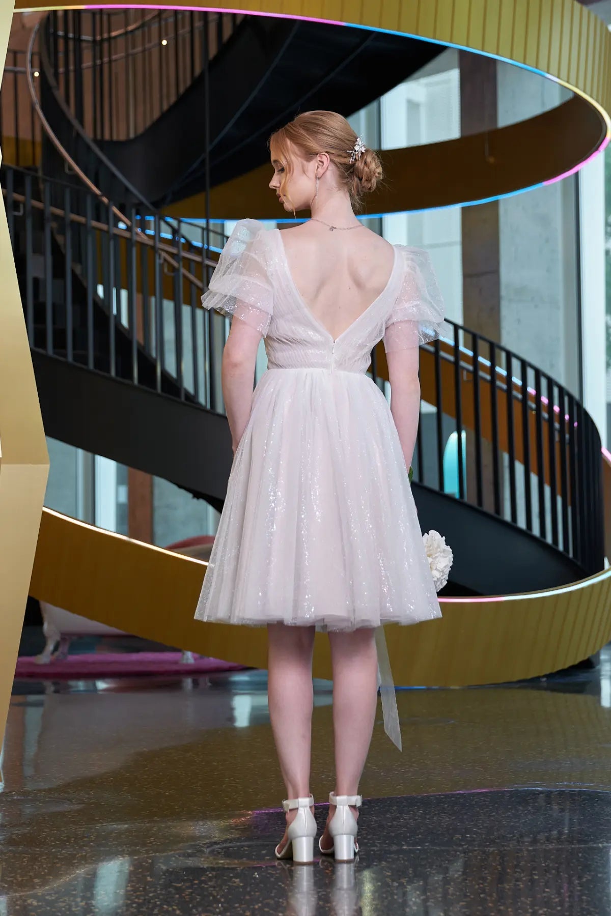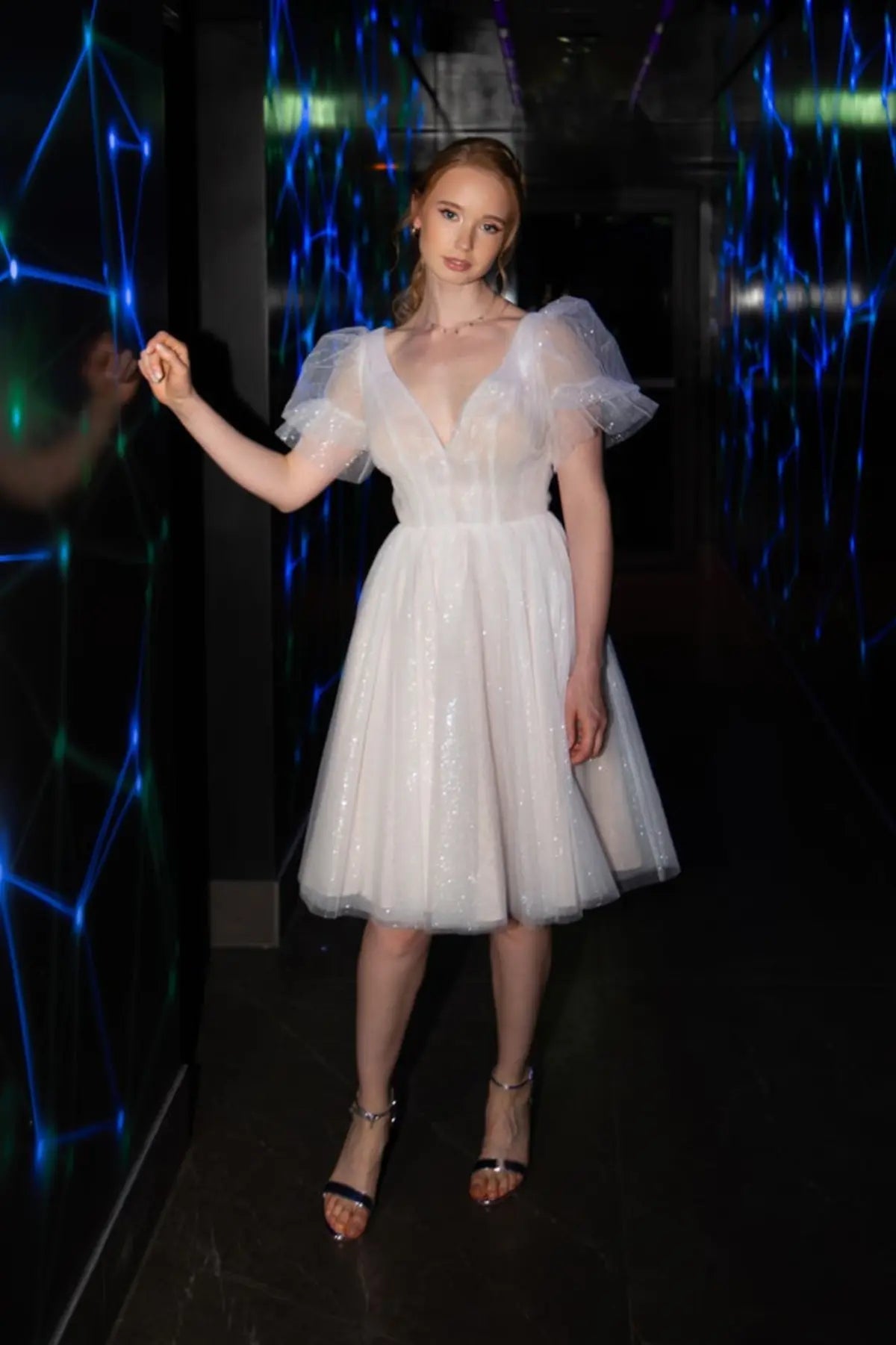 Sag "Ja" zum Bridonista Spark24-13! Dieses lustige Partykleid ist perfekt für einen märchenhaften Hochzeitslook! Mit dem V-Ausschnitt, der A-Linien-Silhouette, dem glitzernden Material aus Tüll und den niedlichen Puffärmeln wirst du definitiv die Ballkönigin sein. Und mit den Rüschen in der Corsage bist du bereit, dich auf dem Standesamt zu drehen. Verpasse nicht die Chance zu glänzen!